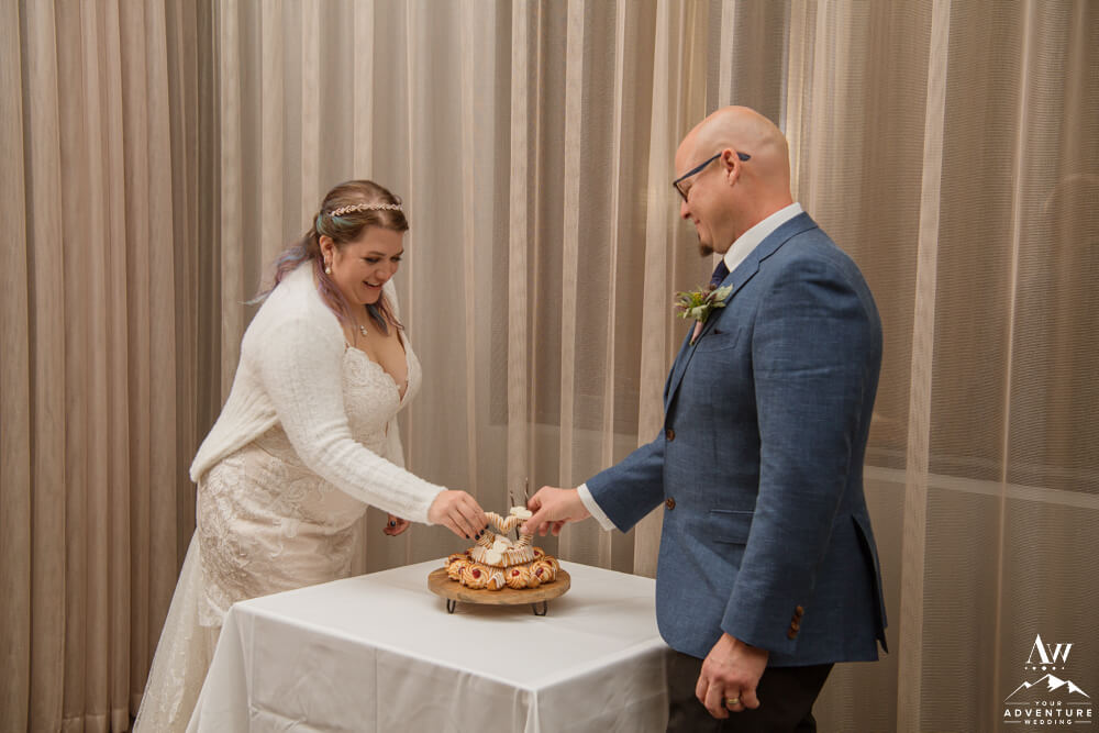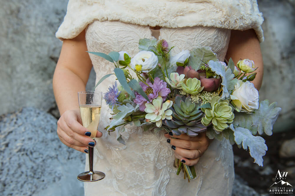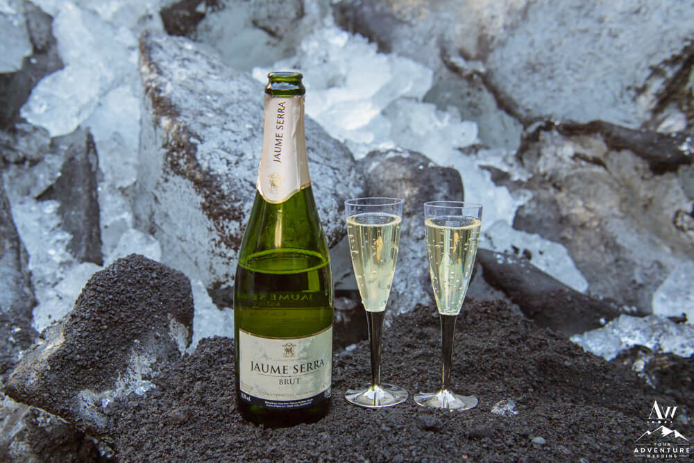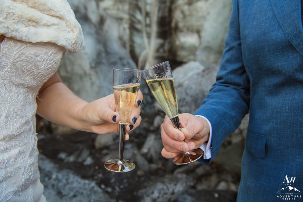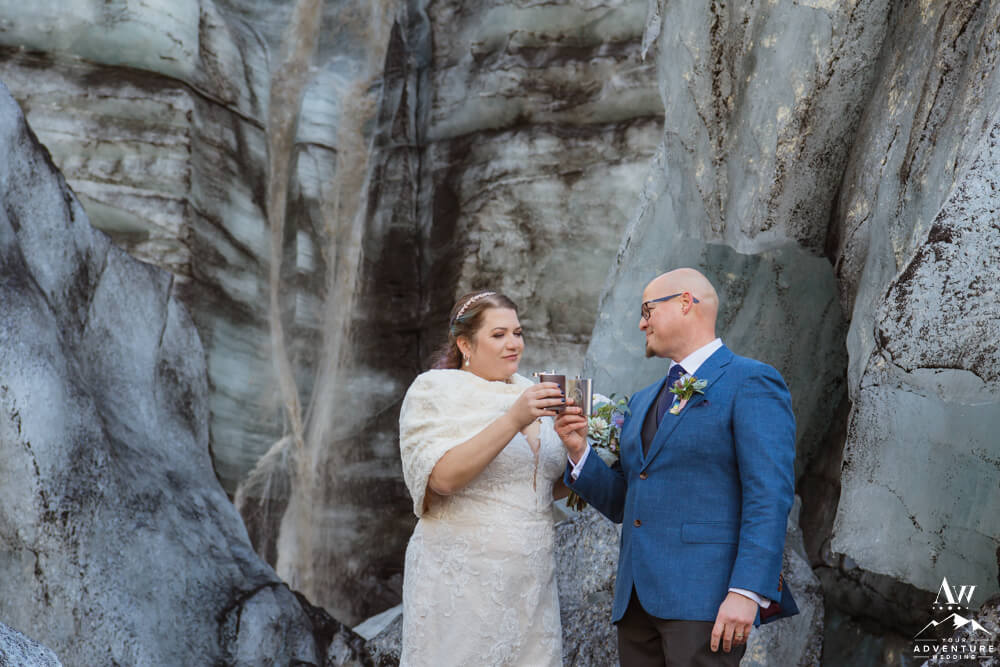Within a sparkling ice valley a perfect spot was carved out that emulated an ice alter. How fitting, right?! During the intimate Katla Glacier wedding ceremony, these two spoke inspiring personal vows and exchanged rings. Immediately following their kiss the group toasted the spectacular occasion with bubbles!