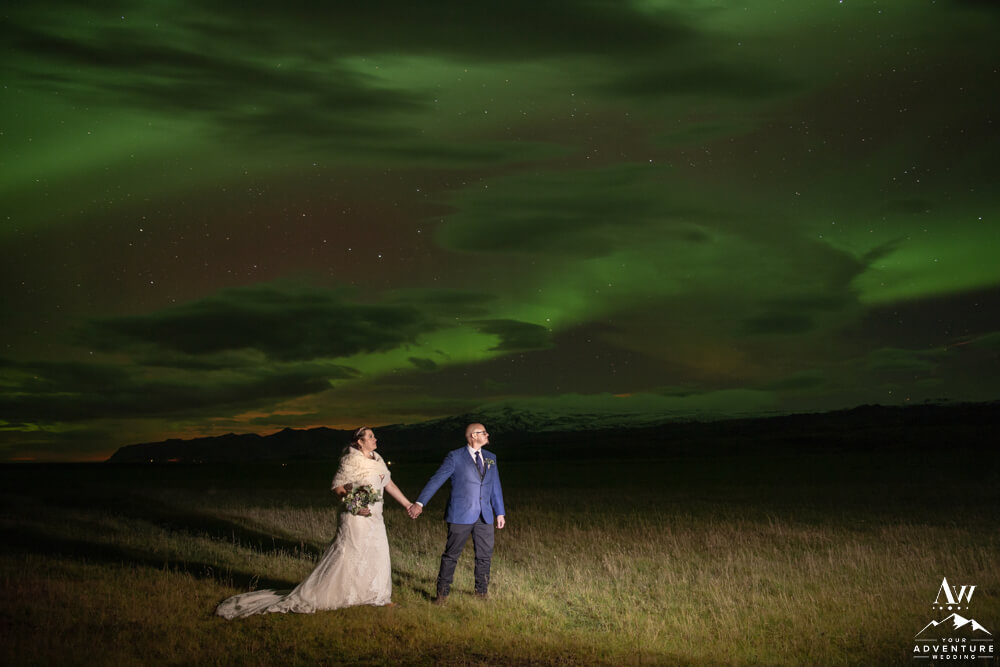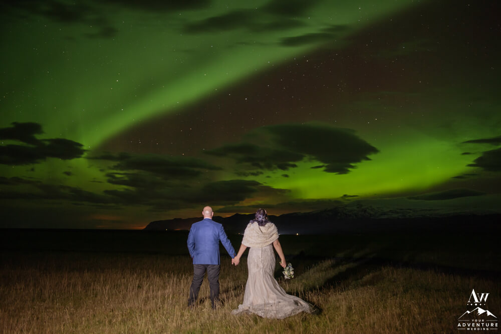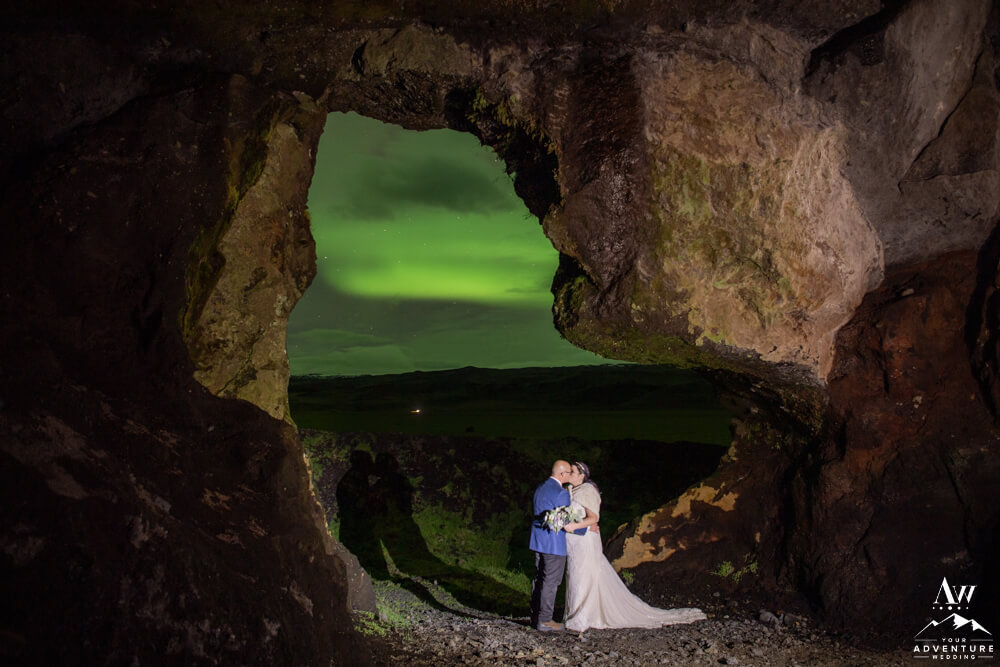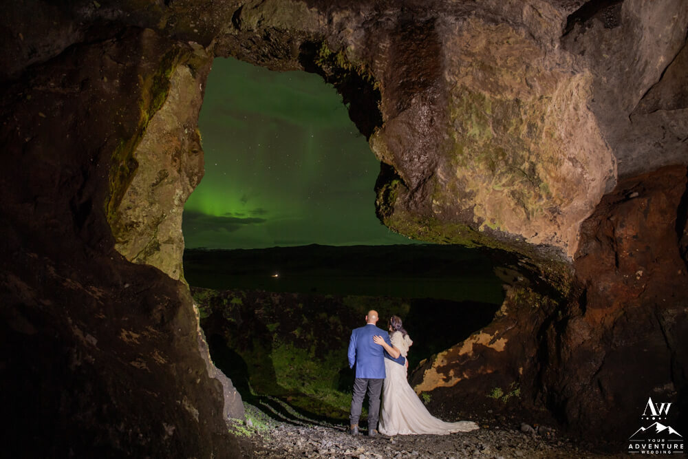 For example, while on the way to one of our favorite private property natural caves to stage a nighttime shot, we were hopeful. However when we were setting up we realized the Auroras were out! Therefore, these two were able to marvel and get some gorgeous Northern Light wedding photos!