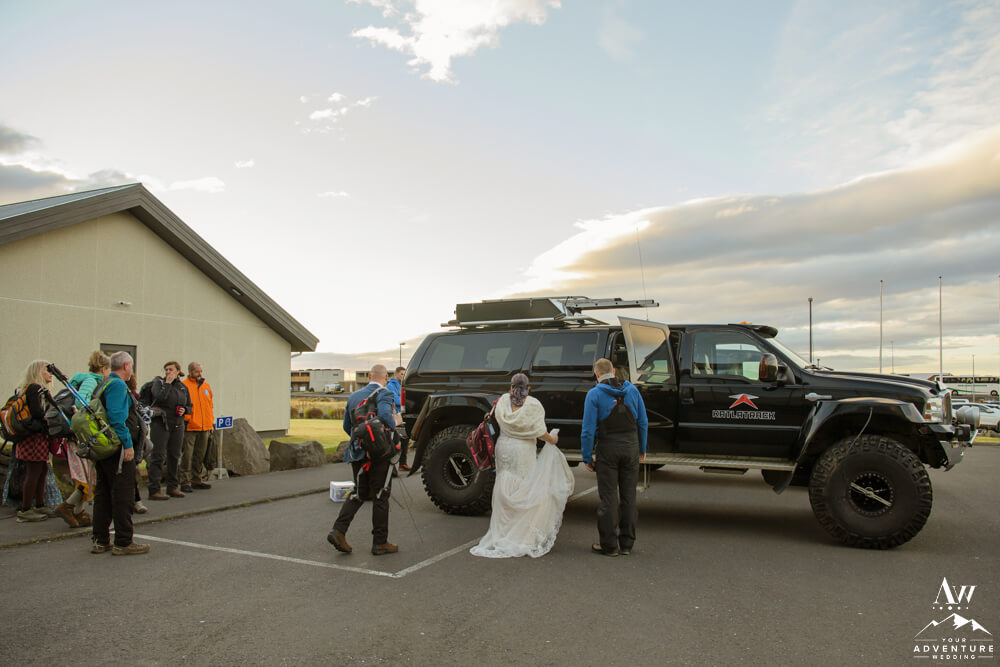 October 3rd 2021, quickly came and their 8 guests made it in the night before to check in to the host hotel. Next, the morning began well before sunrise with our Iceland wedding photographer, hair stylist and makeup artist getting right to work! Shortly before leaving the hotel, Danielle and Shawn shared a sweet first look. Furthermore, excited with “go bags” in hand everyone loaded into super jeeps for the day to head to the Katla Glacier wedding!