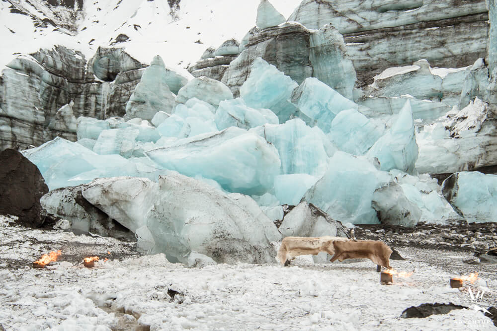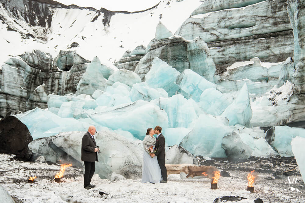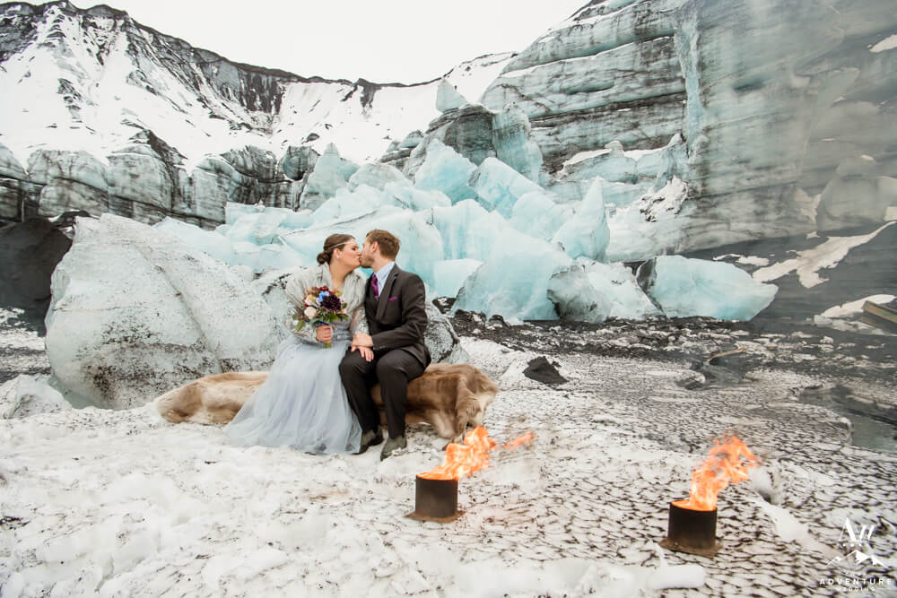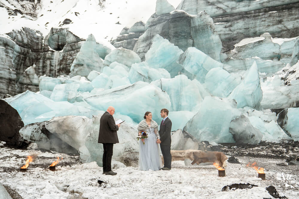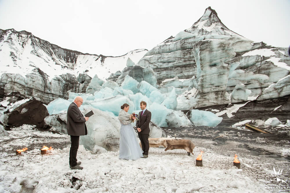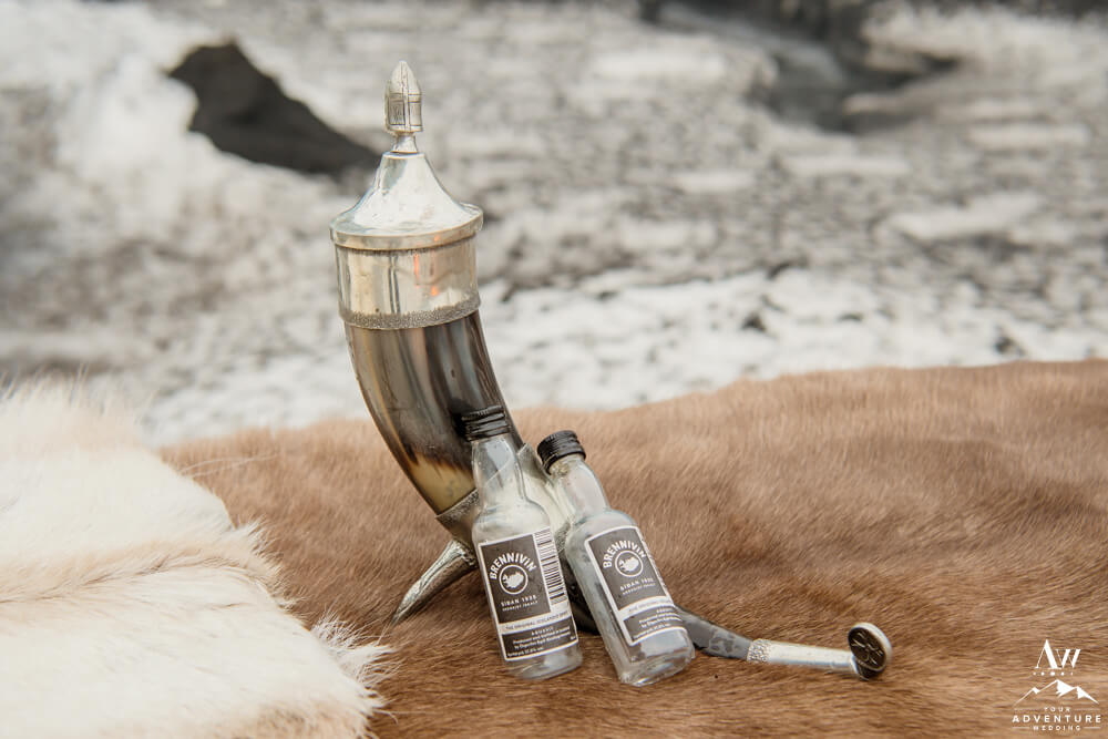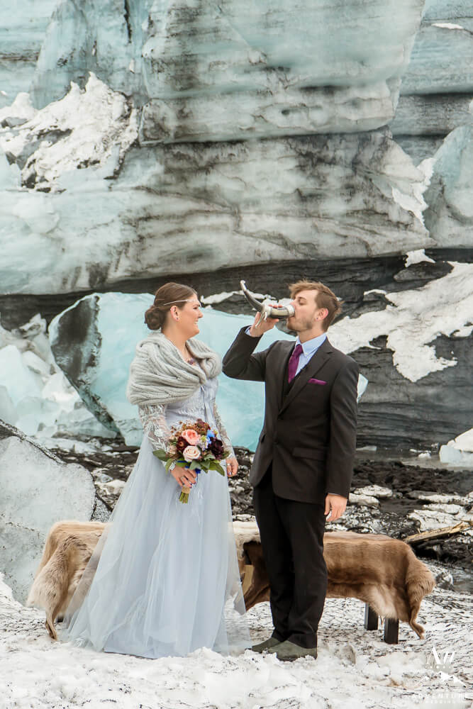 Being an alternative type couple, these two wanted an undiscovered elopement ceremony at a glacier. Moreover, it was important to incorporate themes of fire, ice and Norse roots as well. Therefore, our Iceland Wedding Planner team brought in weather resistant fire pots, reindeer fur bench, Viking horn, Brennivín, and the couple brought locally made Mead to toast with!