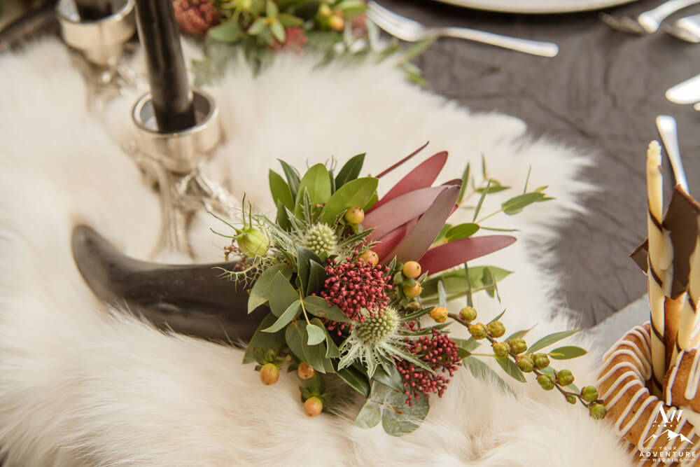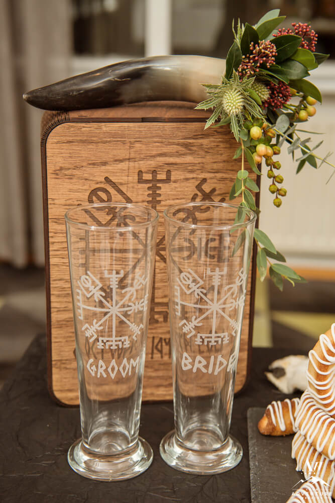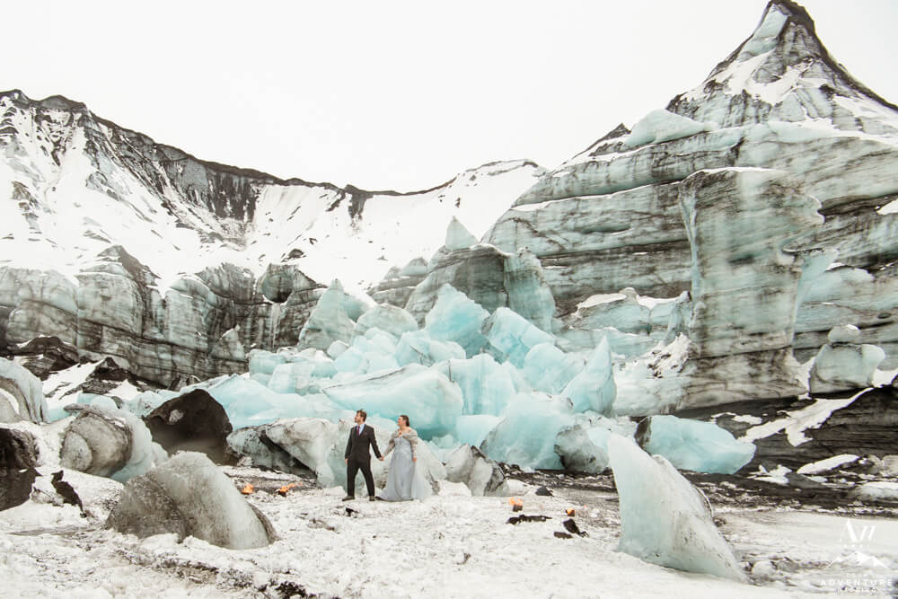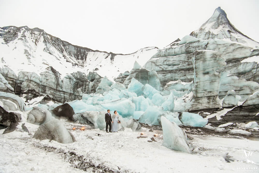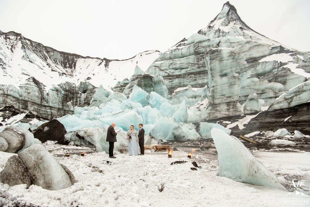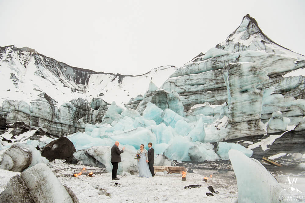 Being an alternative type couple, these two wanted an undiscovered elopement ceremony at a glacier. Moreover, it was important to incorporate themes of fire, ice and Norse roots as well. Therefore, our Iceland Wedding Planner team brought in weather resistant fire pots, reindeer fur bench, Viking horn, Brennivín, and the couple brought locally made Mead to toast with!