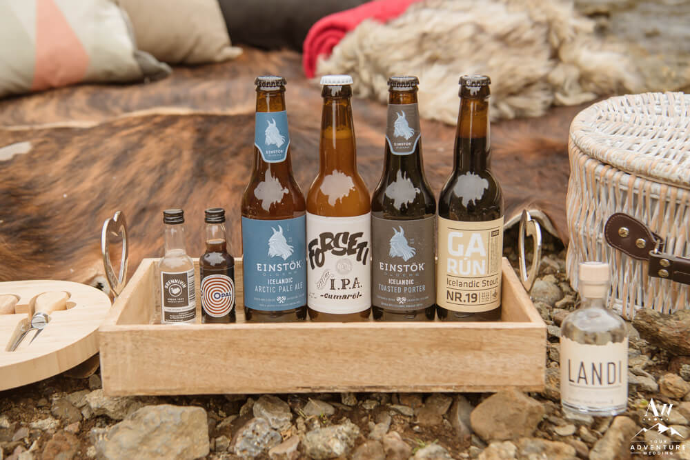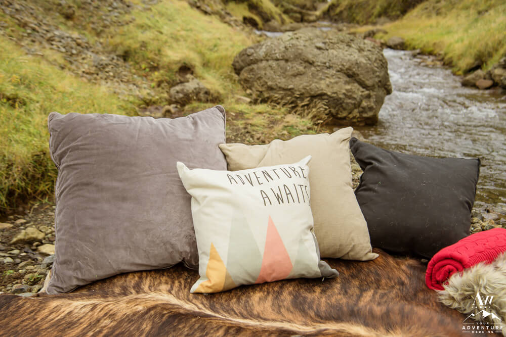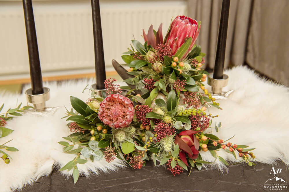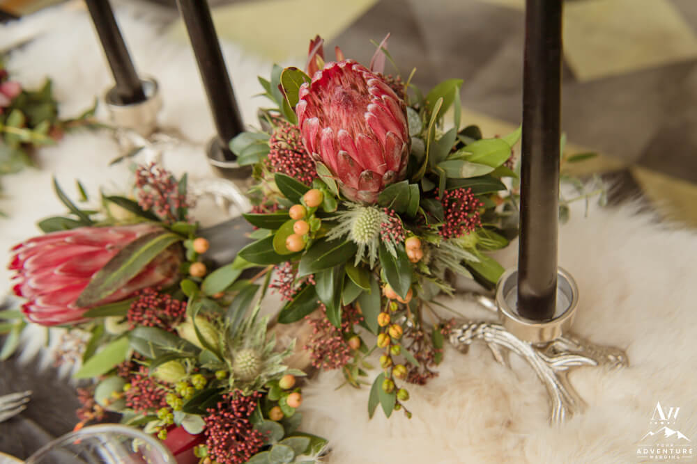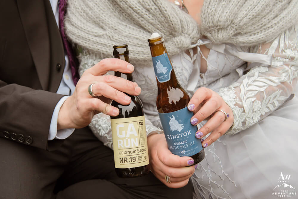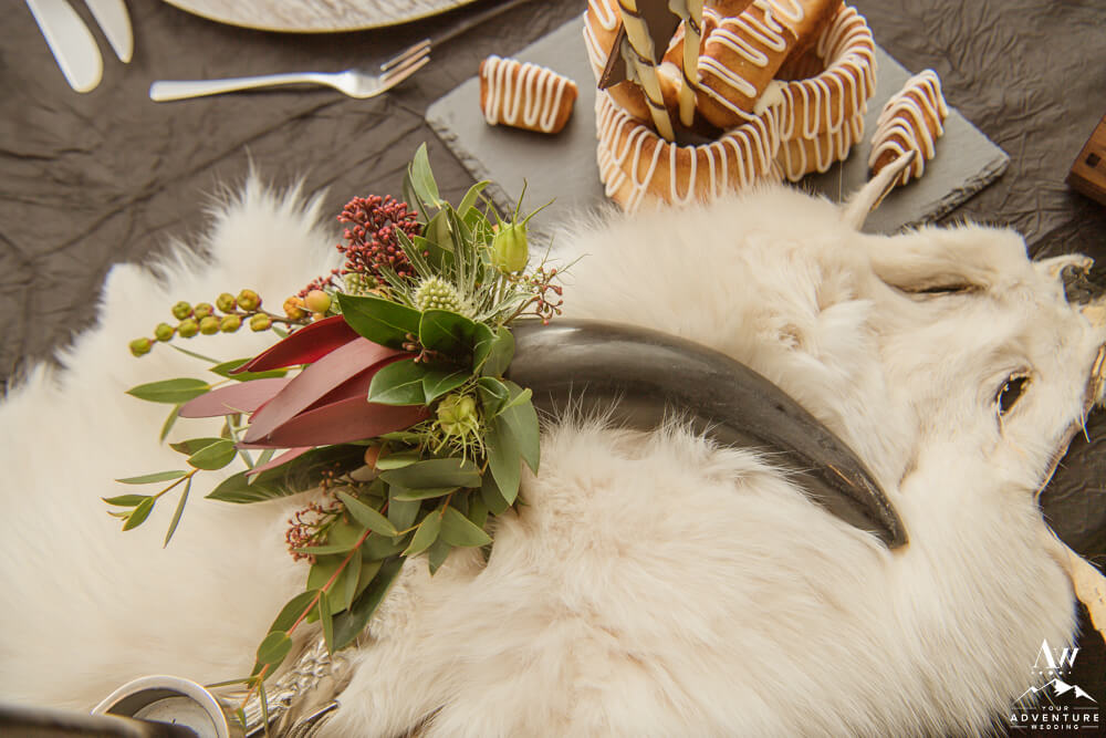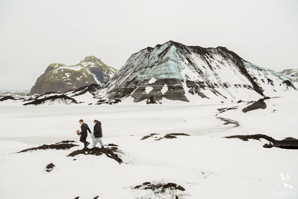 Being an alternative type couple, these two wanted an undiscovered elopement ceremony at a glacier. Moreover, it was important to incorporate themes of fire, ice and Norse roots as well. Therefore, our Iceland Wedding Planner team brought in weather resistant fire pots, reindeer fur bench, Viking horn, Brennivín, and the couple brought locally made Mead to toast with!