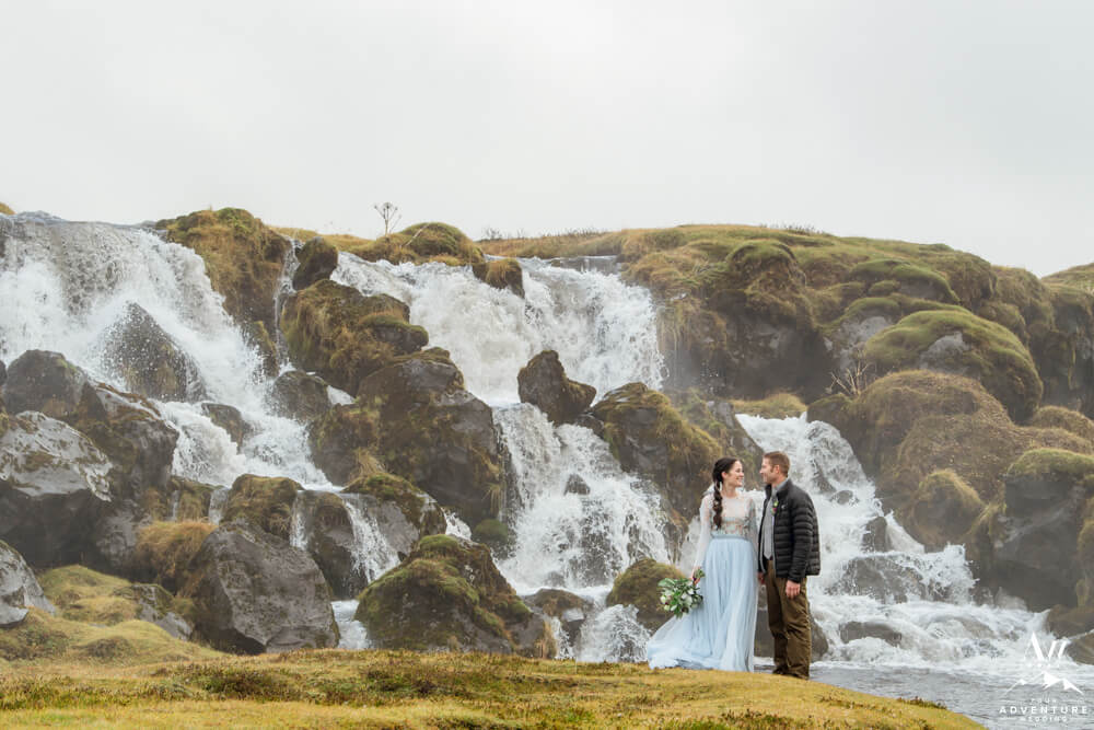 Can you imagine a more perfect place to have lunch than at a highland waterfall in Iceland? Especially if you’re eloping in Iceland, adding on a luxury lunch experience can really make you feel special. Also, it can help slow down the day too if it’s action packed. For example, you sit down with your partner, pop a bottle of bubbles, toast to your newlywedded bliss, bask in the view, and savor every single second of this EPIC moment! Following the picnic these two spent time exploring the place from all angles…