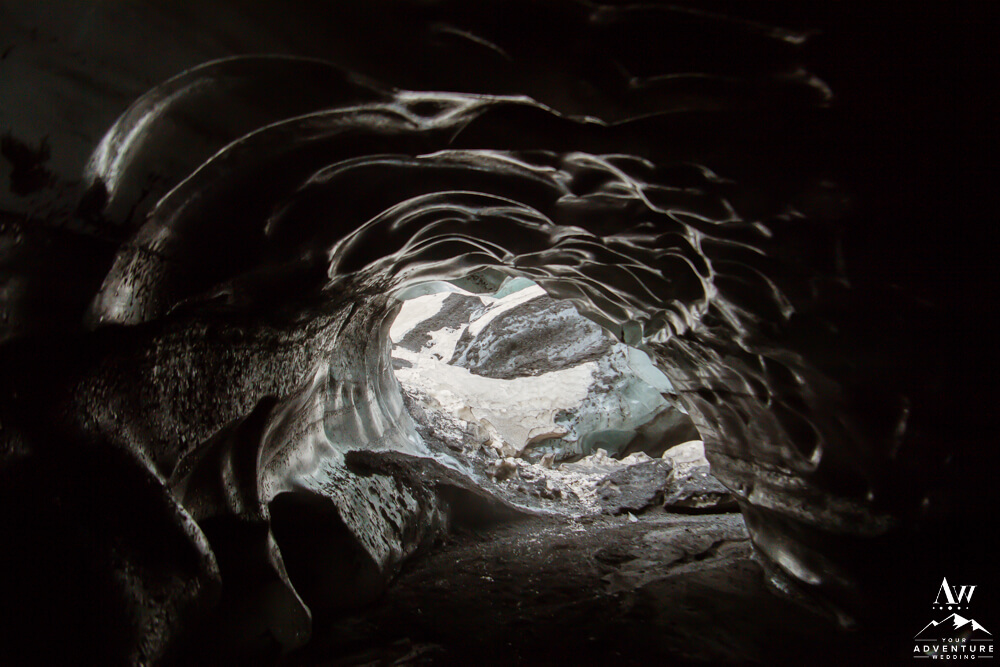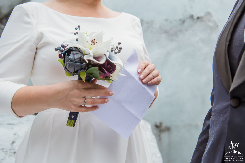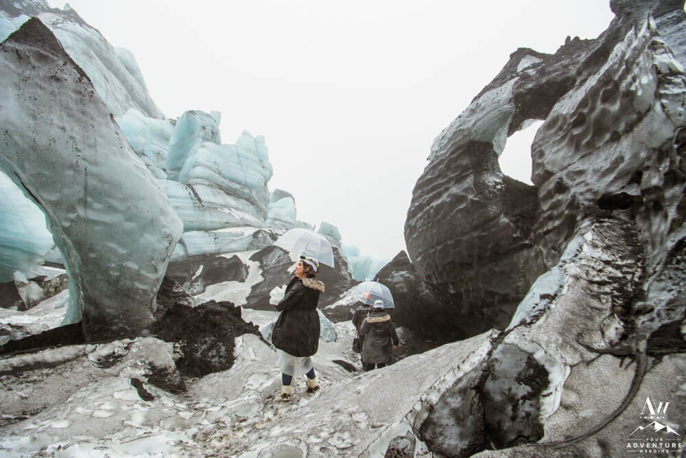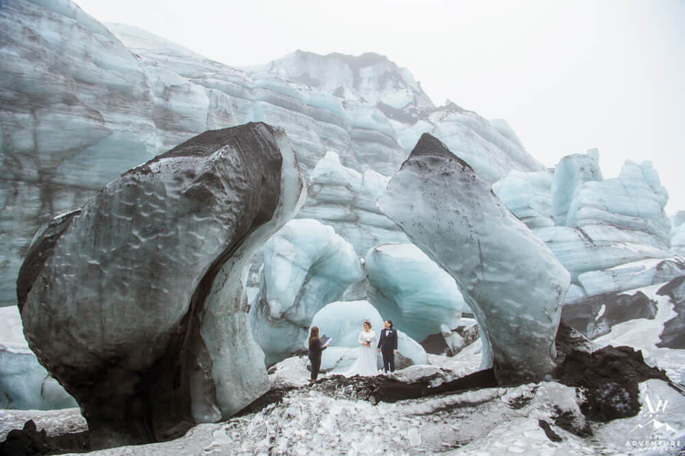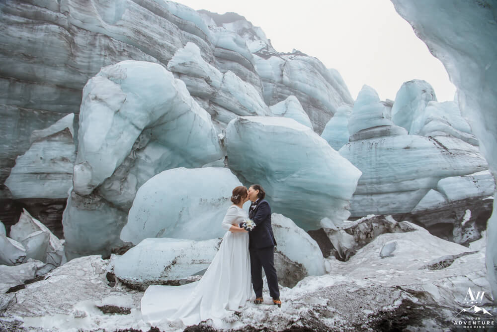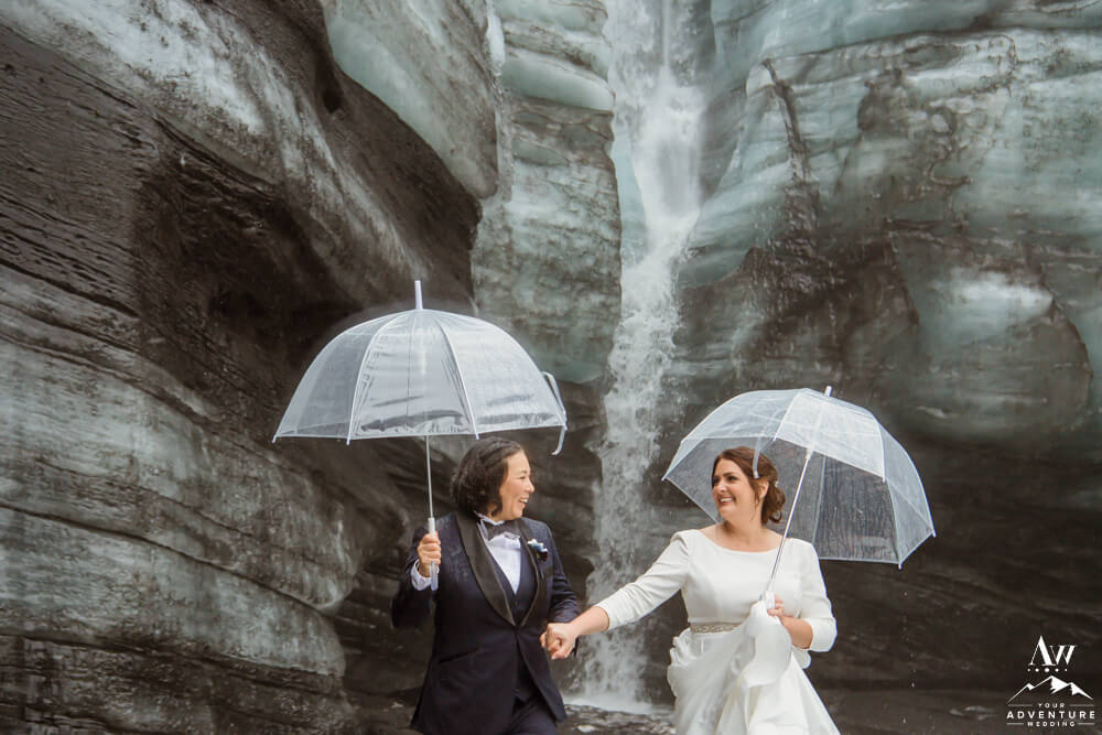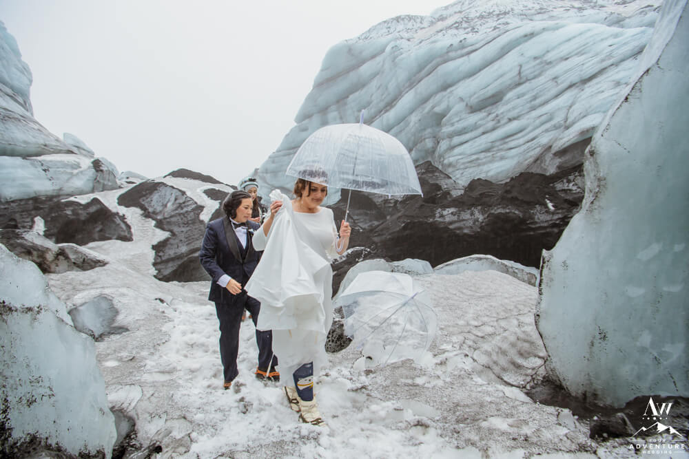 Thirdly, with “go bags” in hand, umbrellas, and smiles on their faces they jumped into the truck and were on their way to get married at the glacier!  Forth, upon arriving to the glacier they put on crampons and began the trek to an ice valley.  Our celebrant Vanessa performed a nature based wedding ceremony which included Heather surprising Amie with a poem she wrote years ago too!  How special and sweet!  After an exchange of rings and a kiss these two were ready to adventure together around the glacier.