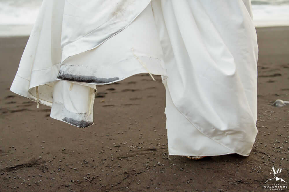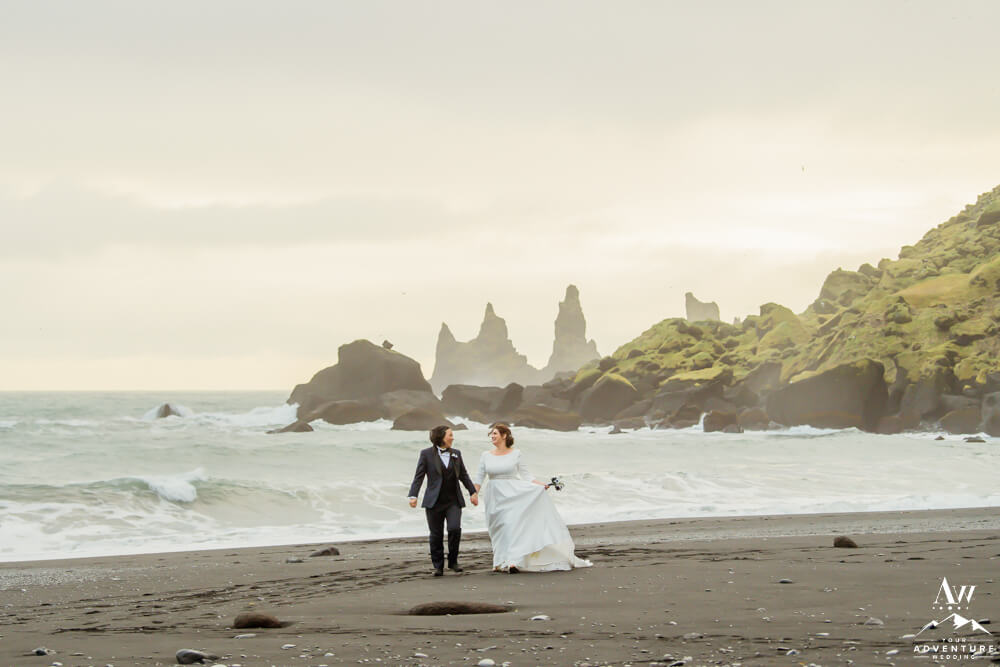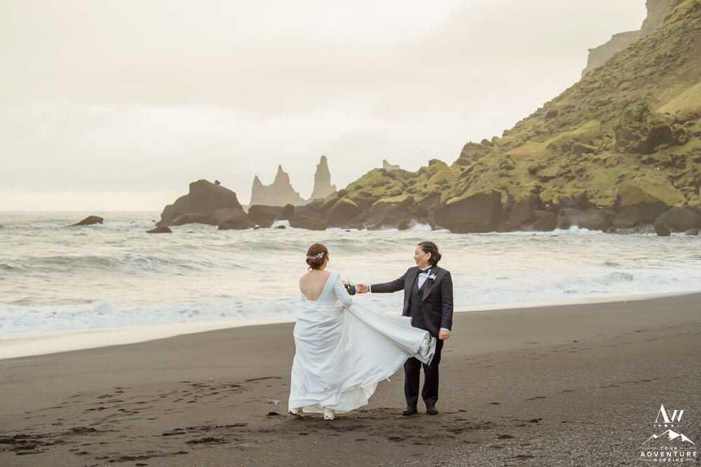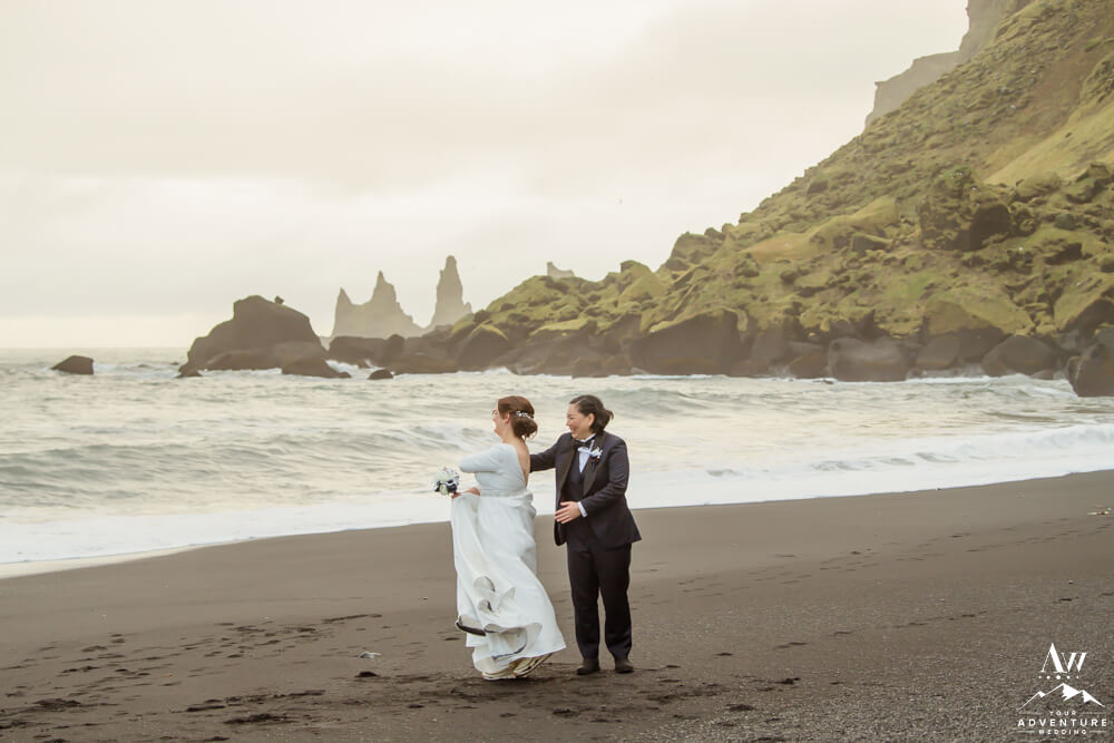 Across the South of Iceland there are countless black sand deserts and beaches.  Maybe you even noticed during their glacier elopement there were black sands?  Víkurfjara though is what most folks call “Vik Beach” and as a bonus it offers a different view of Reynisdrangar.  Heather and Amie loved the idea of chasing sunset and partaking in a first dance on this iconic beach.  …and Heather may or may not have walked away with some souvenirs in her dress!