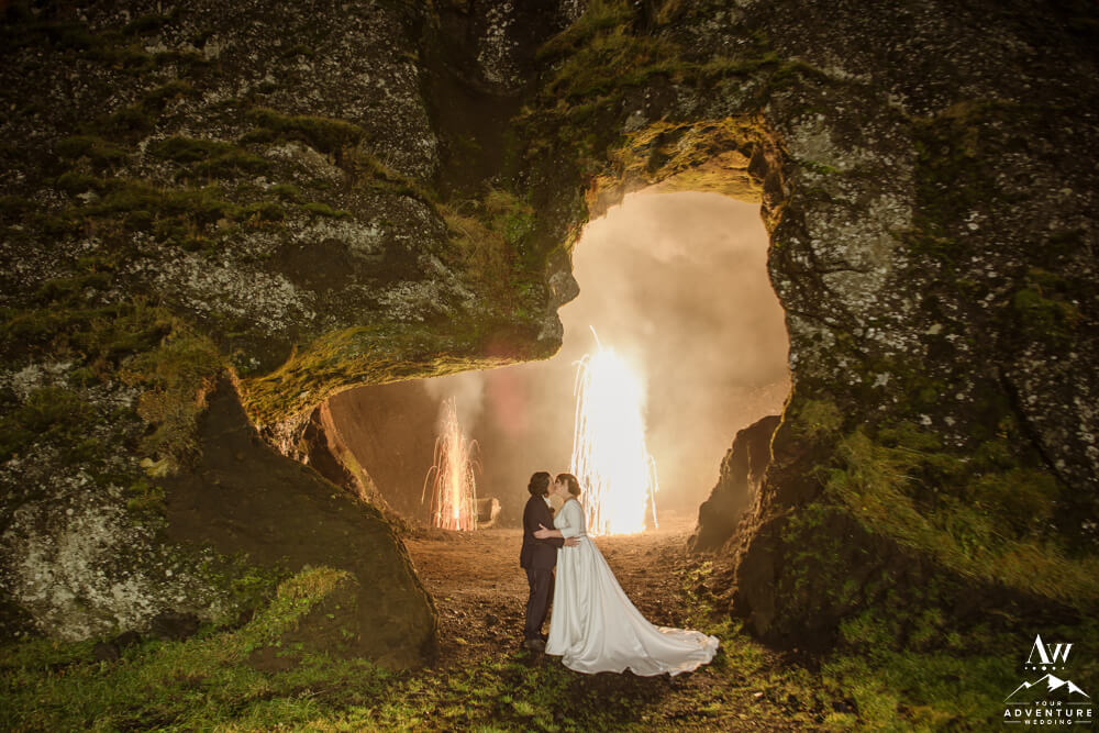 After ditching the wet clothes for some cozy ones for dinner, the newlyweds were ready for a hot delicious meal!  Once they enjoyed thoroughly, they donned their Iceland wedding dress and attire, to partake in some nighttime photos as the Northern Lights were a no show.  Since the weather wasn’t on our side, a perfect retreat was one of our private property natural caves in Iceland.  Fireworks really lit up the beauty of the place and celebrated the love of these two lifetimers!