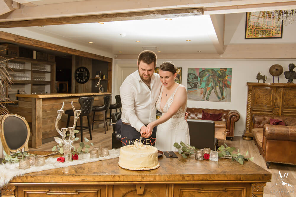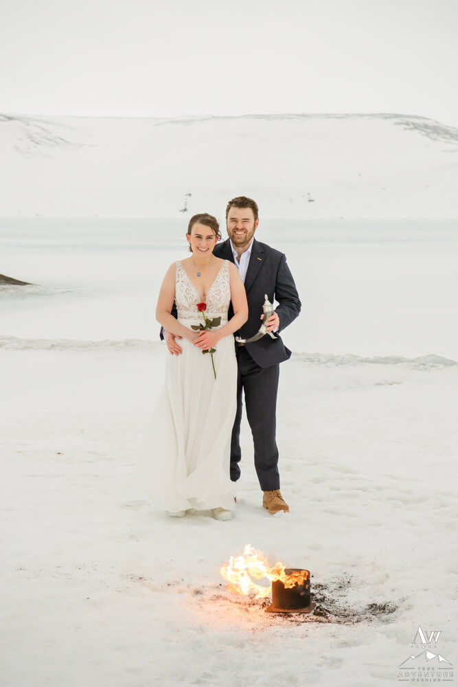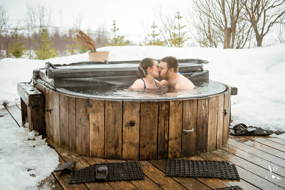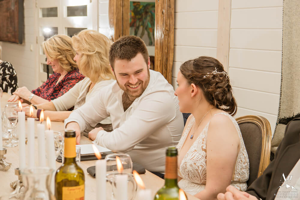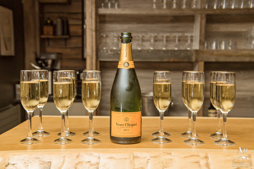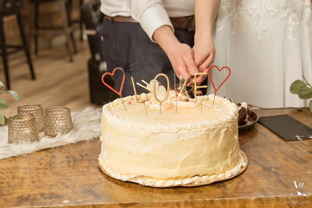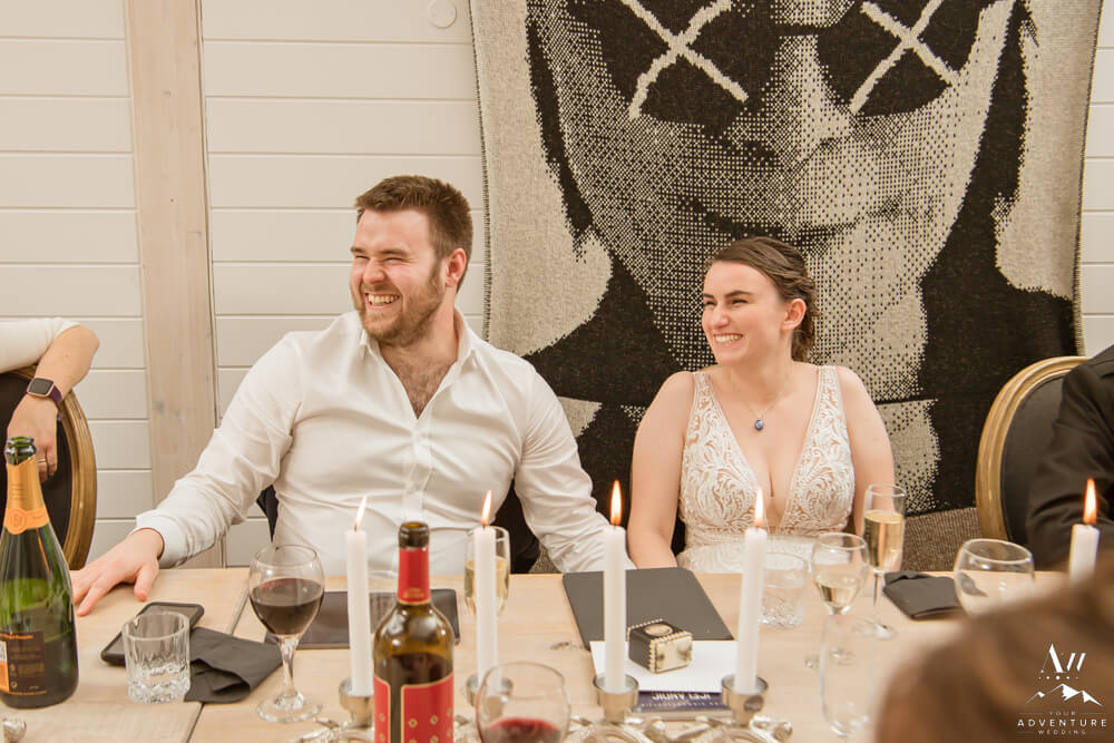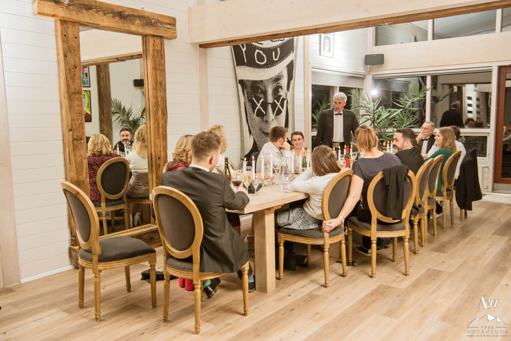 So upon returning to the lodge after the adventure day, they jumped in the hot tub while our team and catering team setup! The group delighted in a 4 course wedding meal that was truly a traditional yet culinary experience. Lastly, they ended the night with toasts, laughs, and make your cheeks hurt smiles! Inspired by Steven and Marie’s March wedding adventure? Please contact us to get an idea of what it would take to plan something similar!