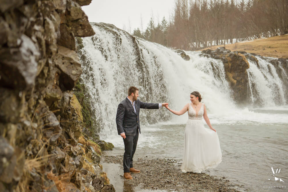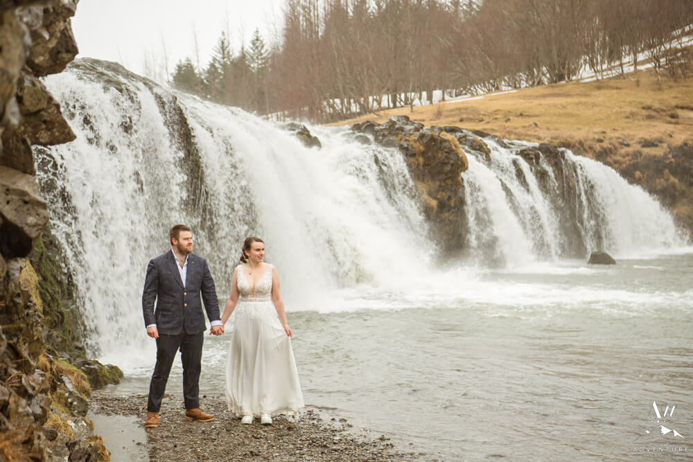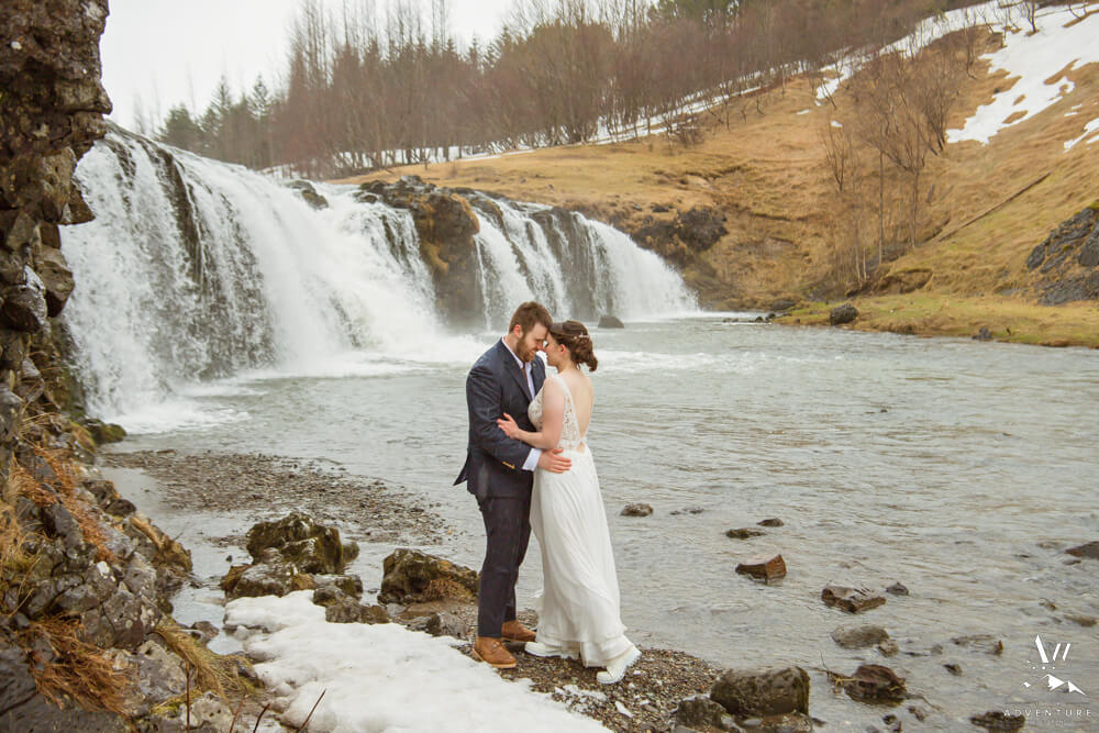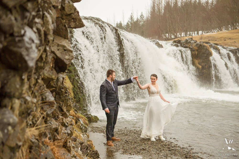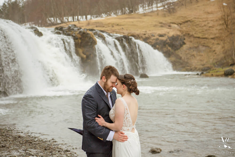 Many river waterfalls in Iceland have the elevation and texture to be waterfalls. And let’s be honest any size waterfall when you haven’t experienced one that day is stunning sometimes! During their March wedding adventure, Marie, Steven, and their guests reveled in it’s beauty despite the heavy rains and wind!