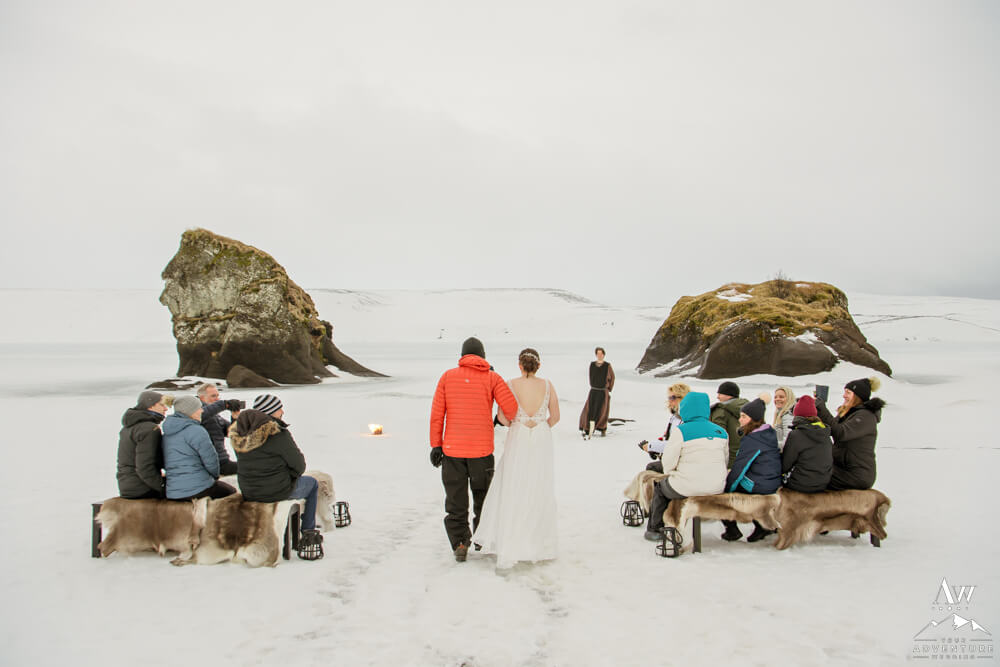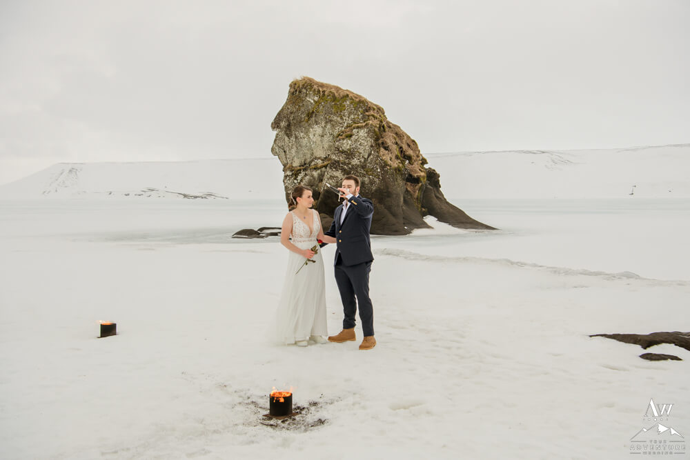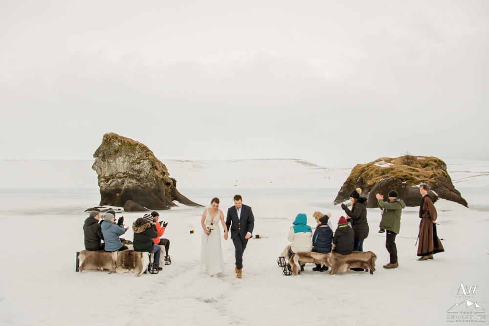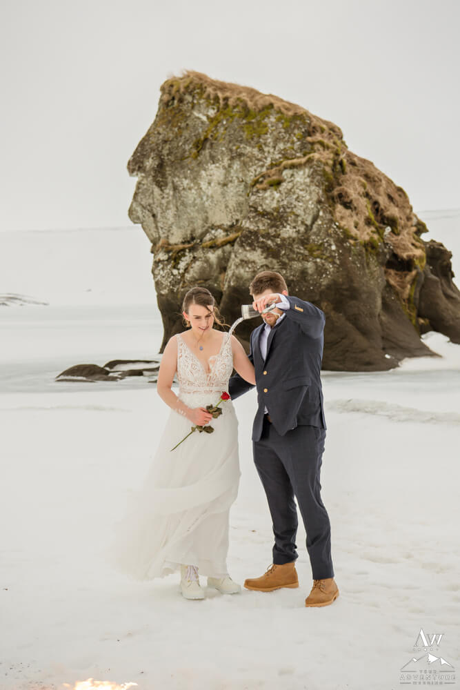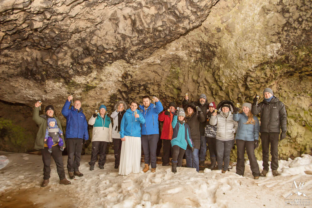 Ever wonder how you say, “cheers” in Icelandic? It is Skál (sk-owl)! And what better way to toast to the newlyweds by having a toast and first dance inside another natural cave. All away from the crazy March wedding weather!