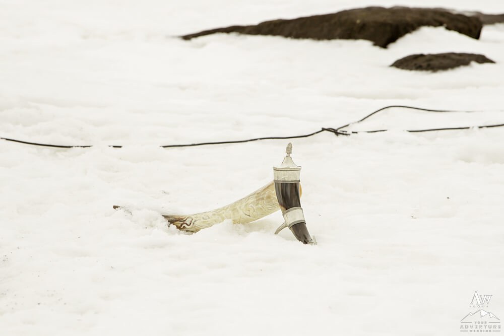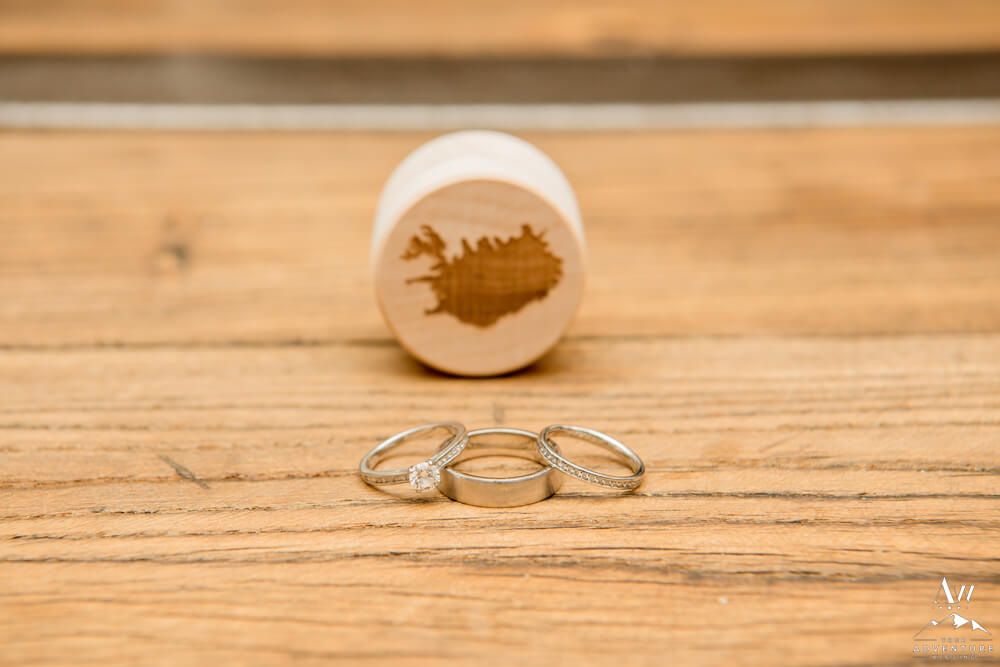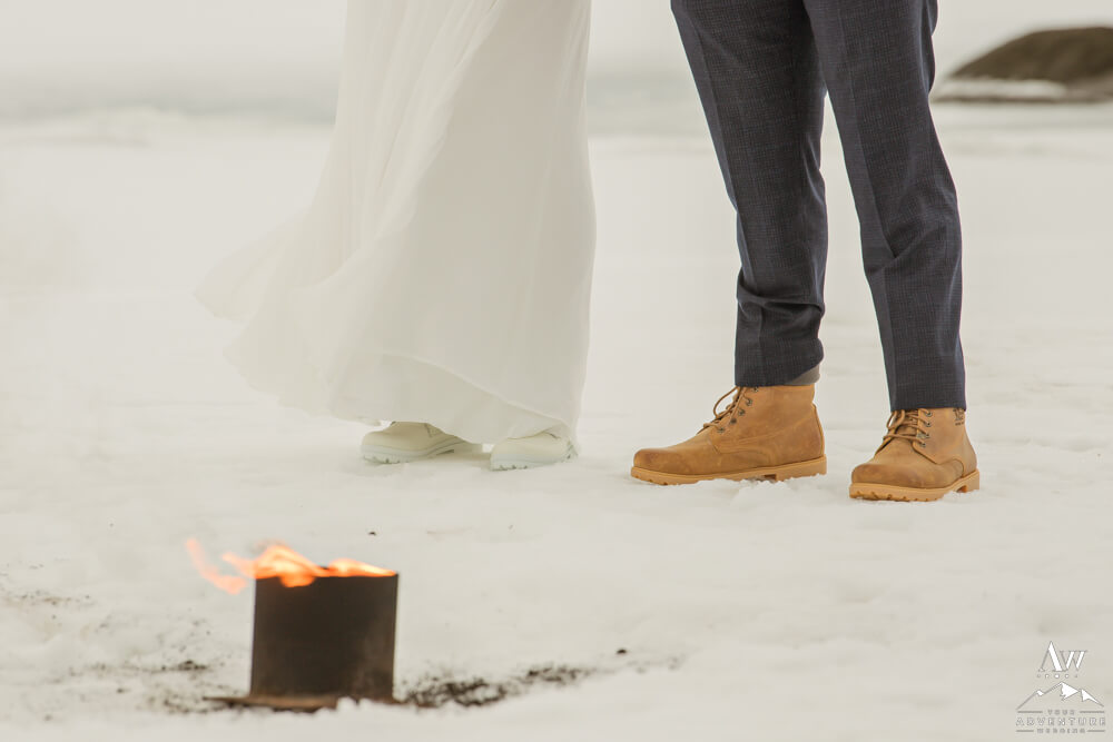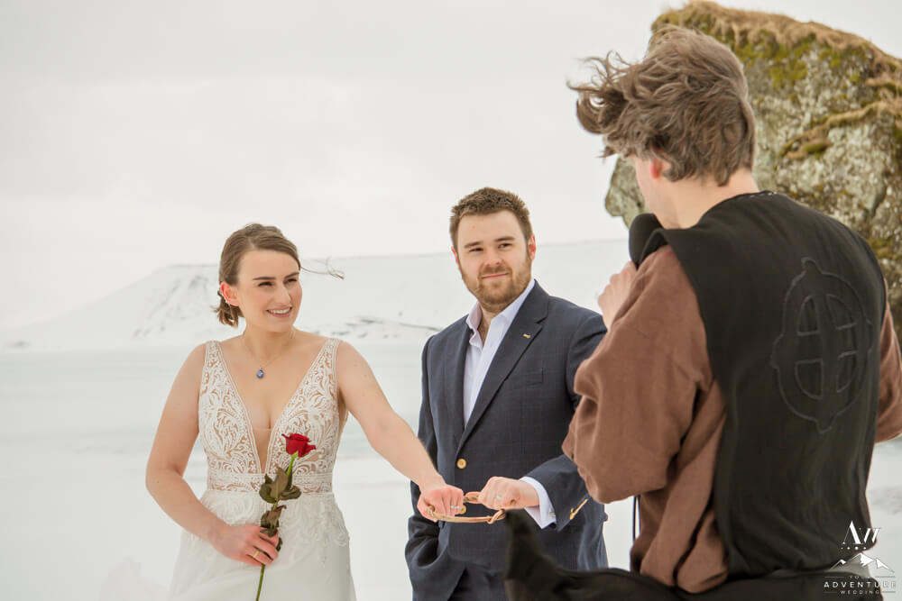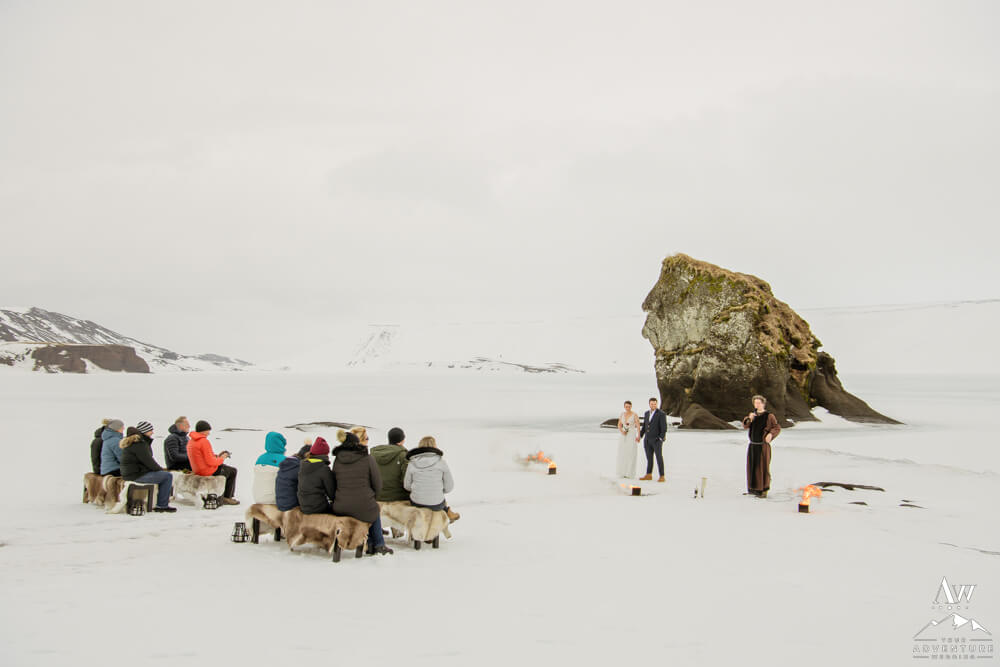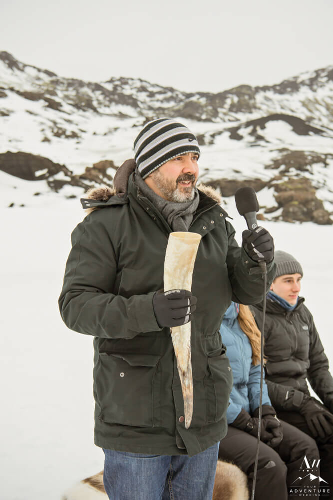 After the guests were seated, their Ásatrú ceremony began. Steven and Marie held oath rings as they declared their lifetime promises to each other. Furthermore, the celebration continued with their guests drinking from a Viking horn to wish positive vibes onto their new marriage. Lots of laughs and smiles followed as the group explored the slushy yet frozen lakeside area.