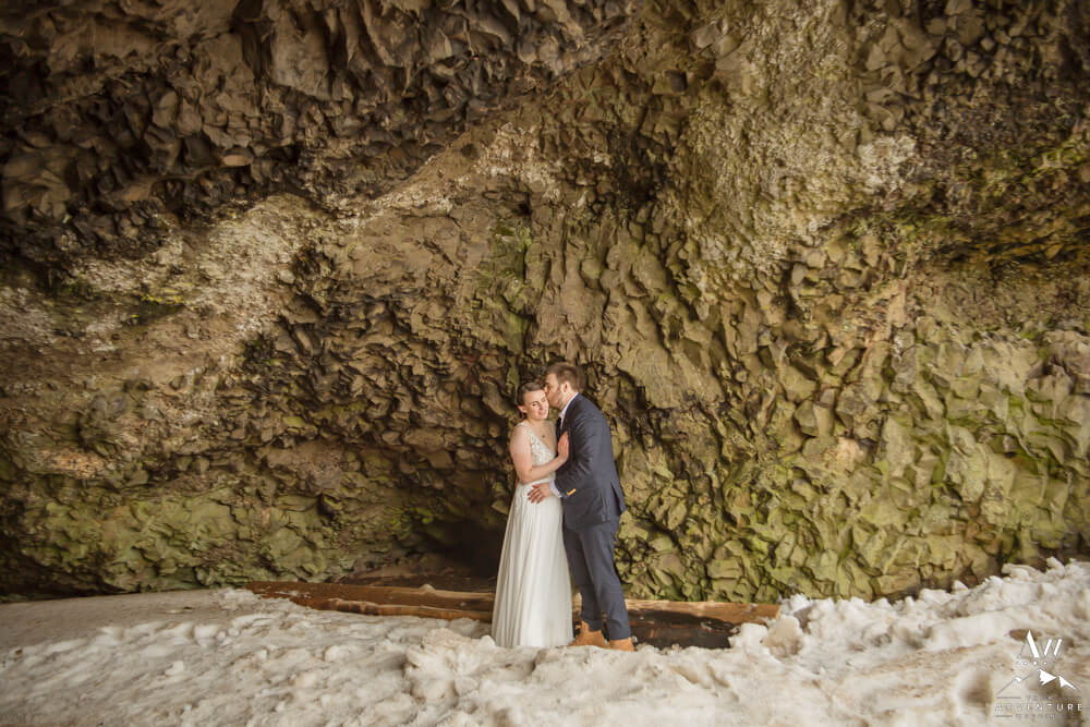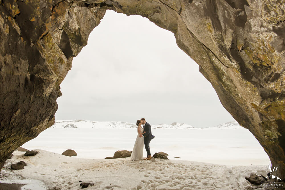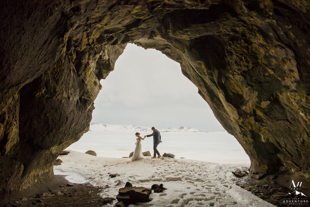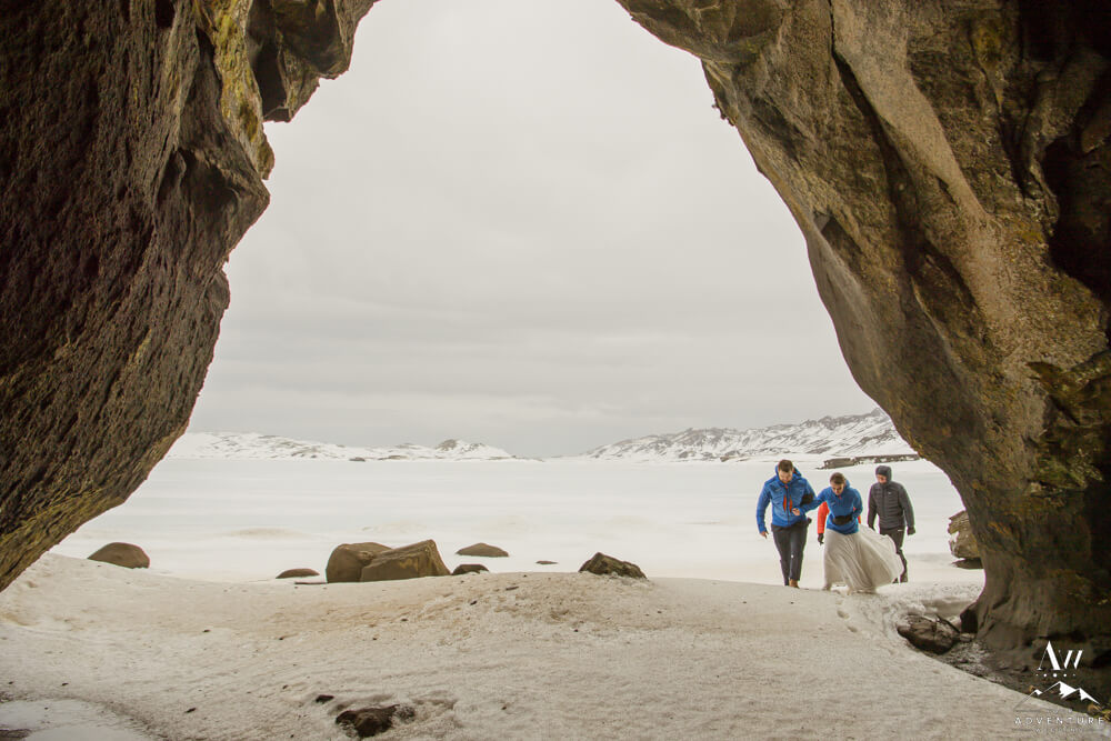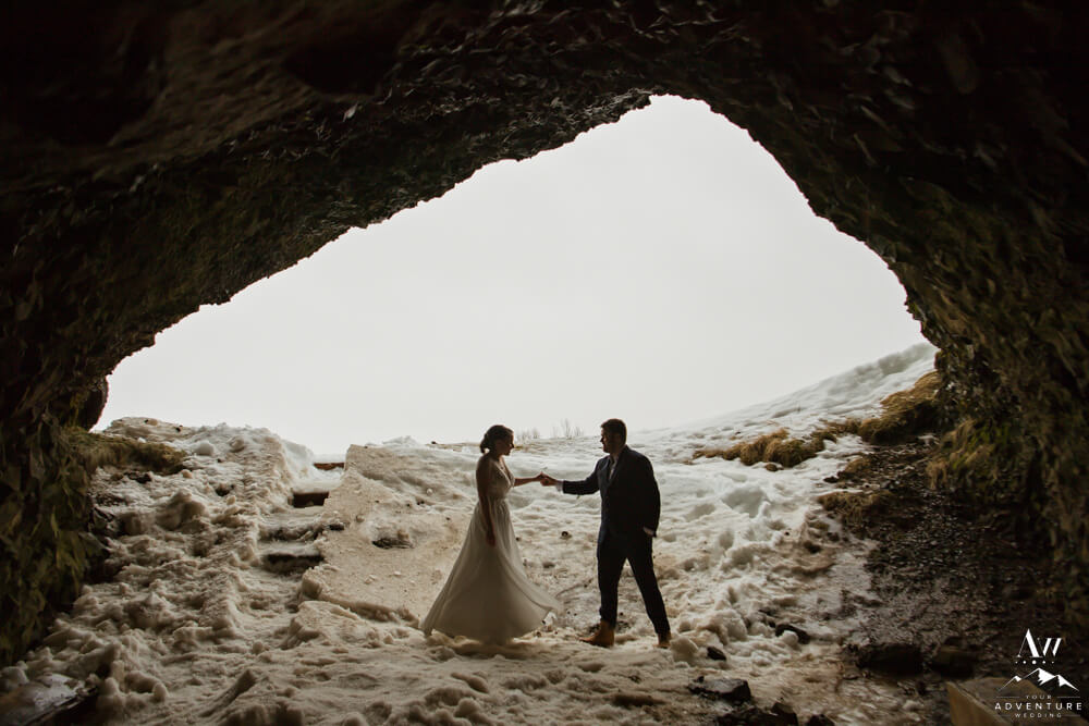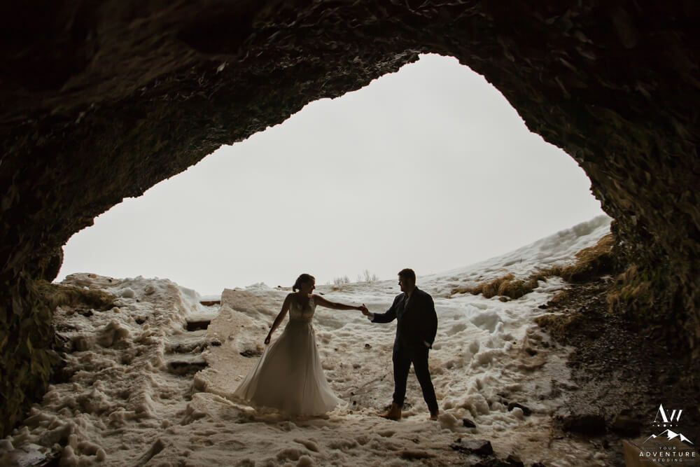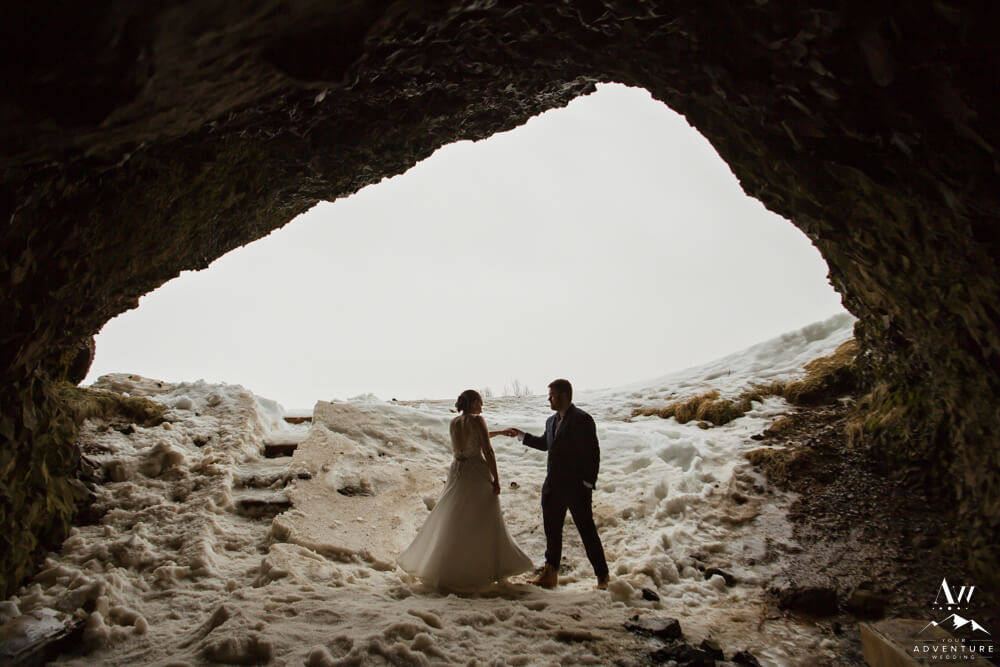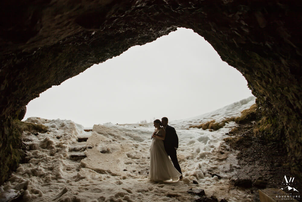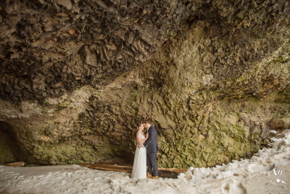 The weather in Iceland sometimes forces you indoors for a break. But what could that mean? A natural cave can be a perfect place to seek refuge during a March wedding in Iceland!