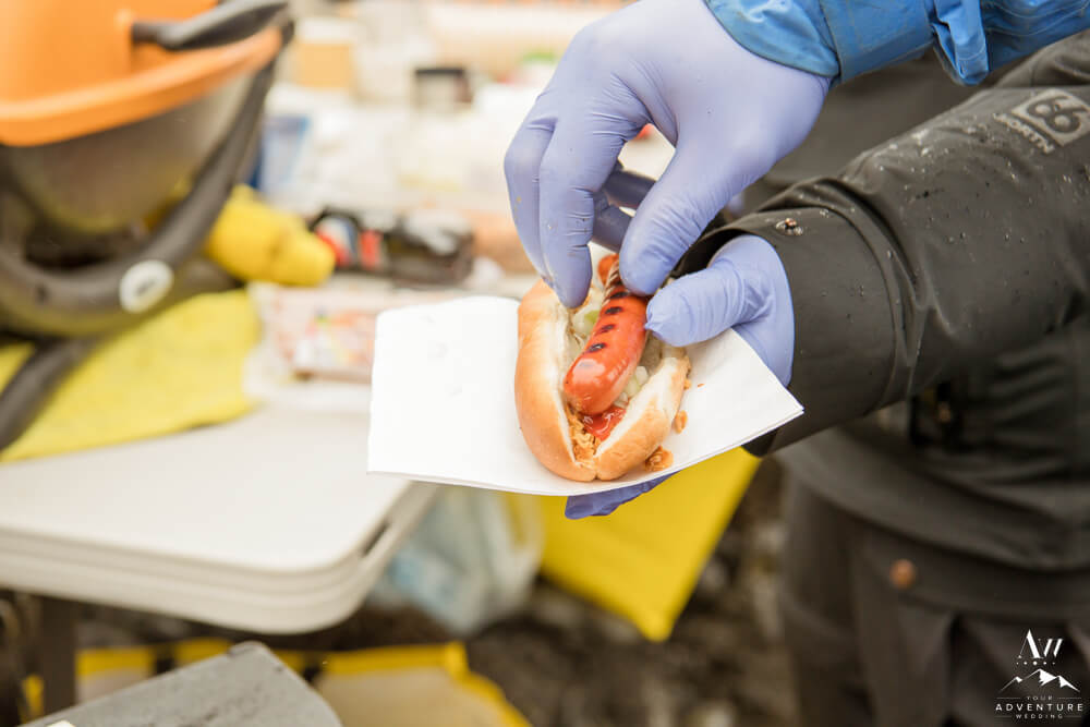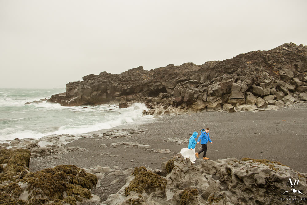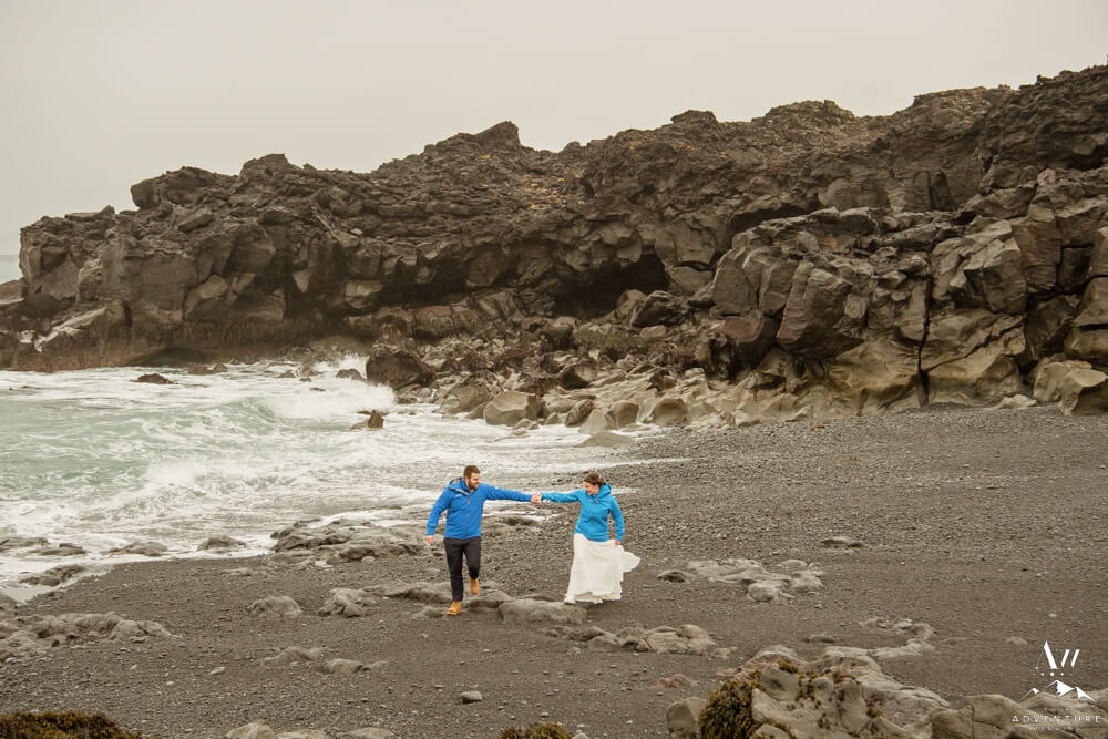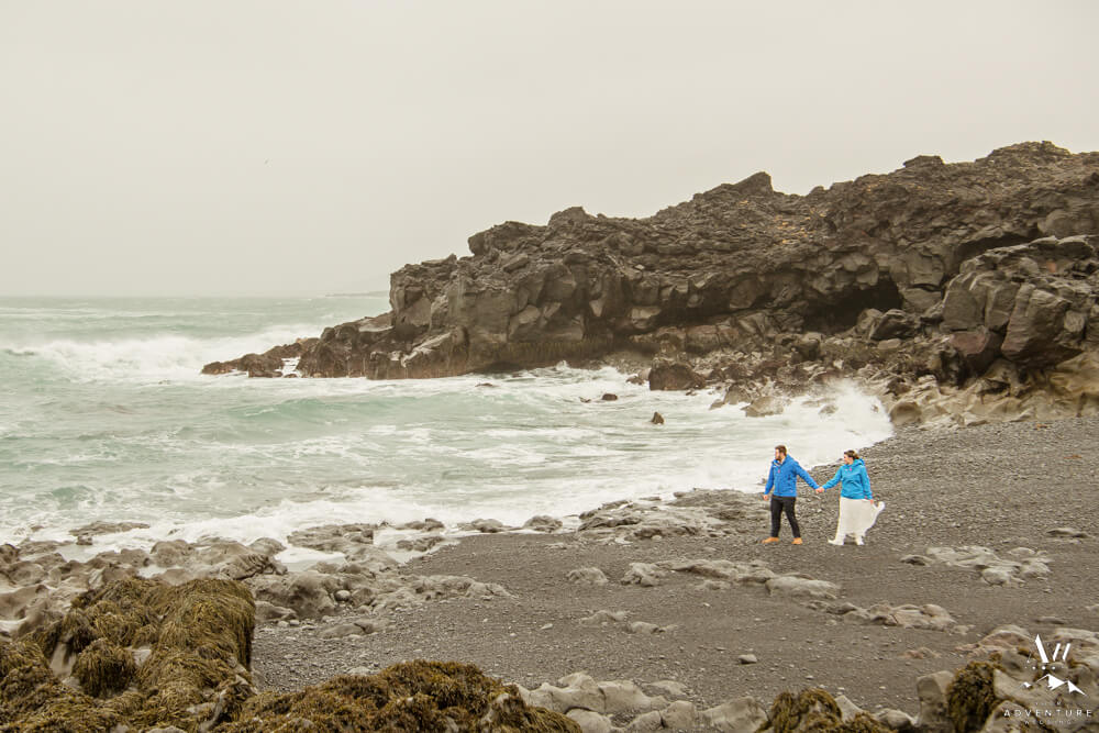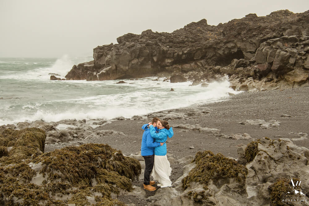 Escaping the snow and slush for a bit, these two and their guests adventured to a lava rock beach! However, the weather became pretty fierce in wind, rain, and dropping temperatures. But Marie and Steven rolled with it and just embraced harder! And heck there is no shame in keeping your coat on for some of your Iceland wedding photos too during a March wedding!! Following their discovery of this historical place, they group delighted in a deliciously traditional hot dog BBQ to warm up.