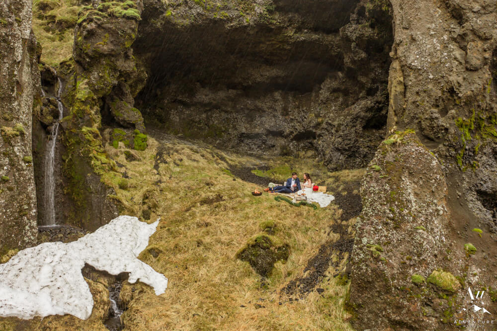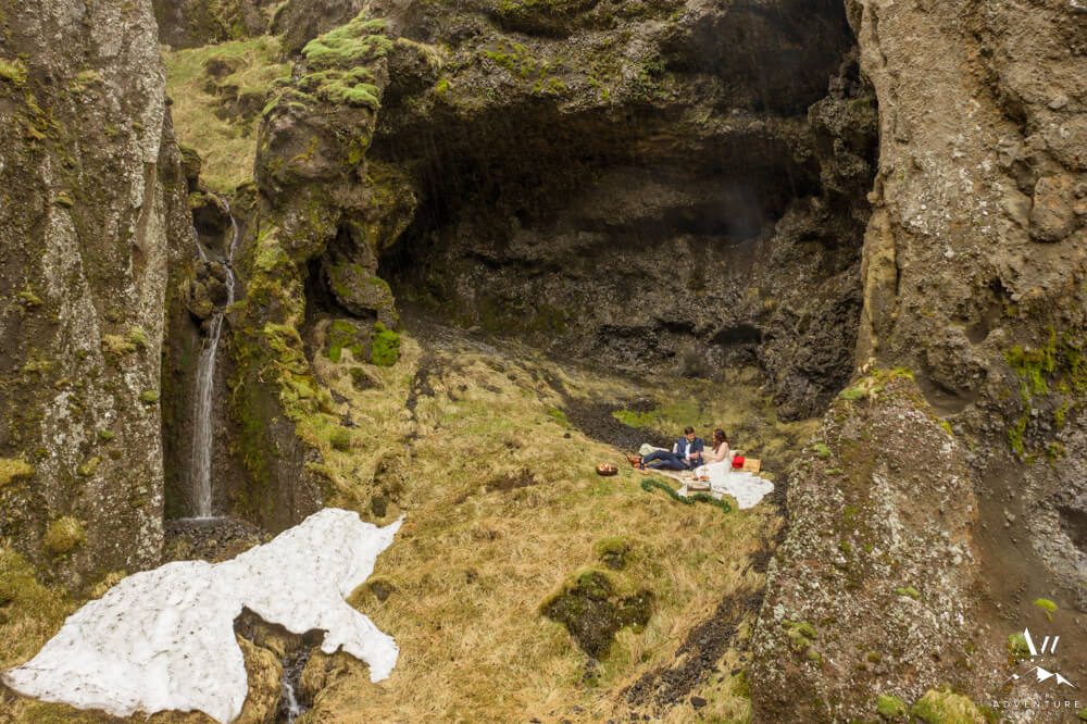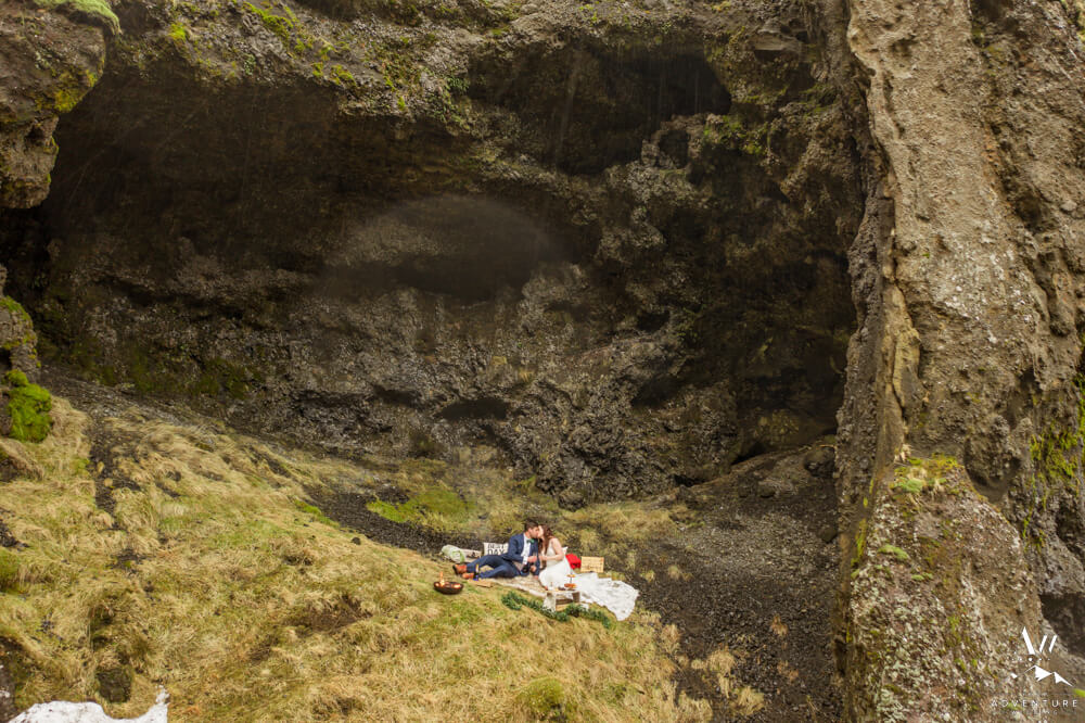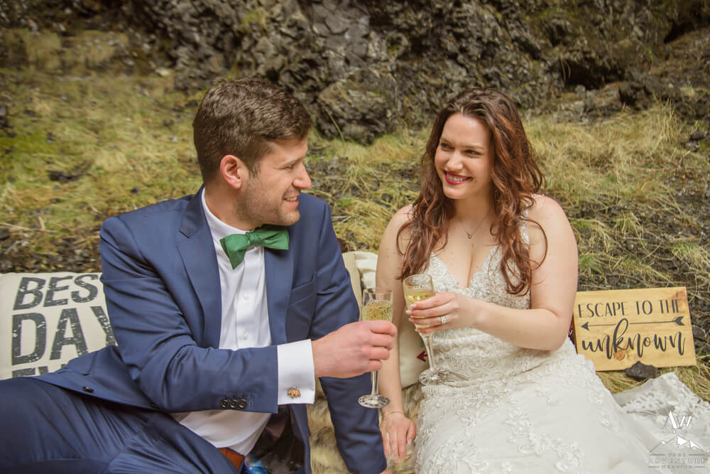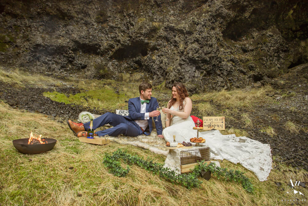 After an exciting hike it was time for part two of their wilderness honeymoon session to begin… The hike to a a luxury picnic! Although it started raining, we picked a spot in a canyon next to a small waterfall and made it cozy!! Inclusions to the honeymoon picnic were as follows: Pommery Champagne, Icelandic cheeseboard, fruit, kleina (donuts), cinnamon buns, and macaroons.