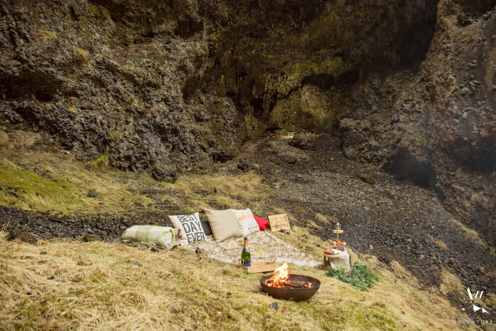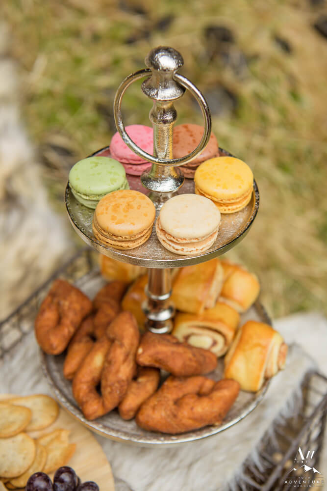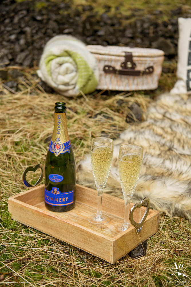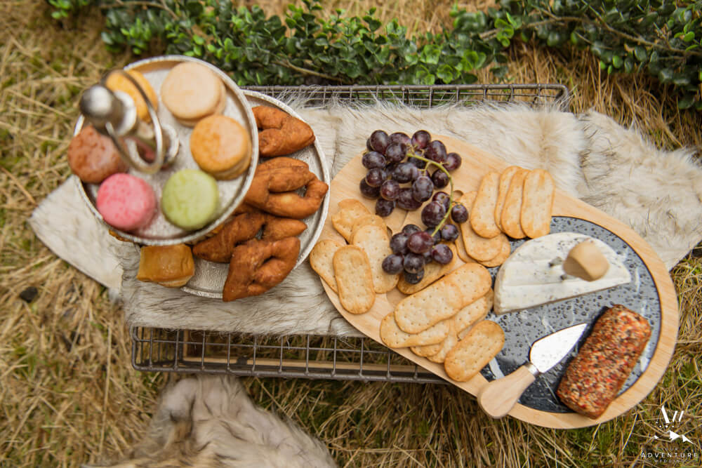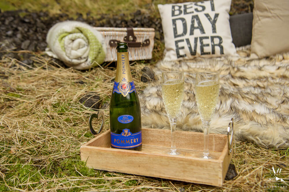 After an exciting hike it was time for part two of their wilderness honeymoon session to begin… The hike to a a luxury picnic! Although it started raining, we picked a spot in a canyon next to a small waterfall and made it cozy!! Inclusions to the honeymoon picnic were as follows: Pommery Champagne, Icelandic cheeseboard, fruit, kleina (donuts), cinnamon buns, and macaroons.