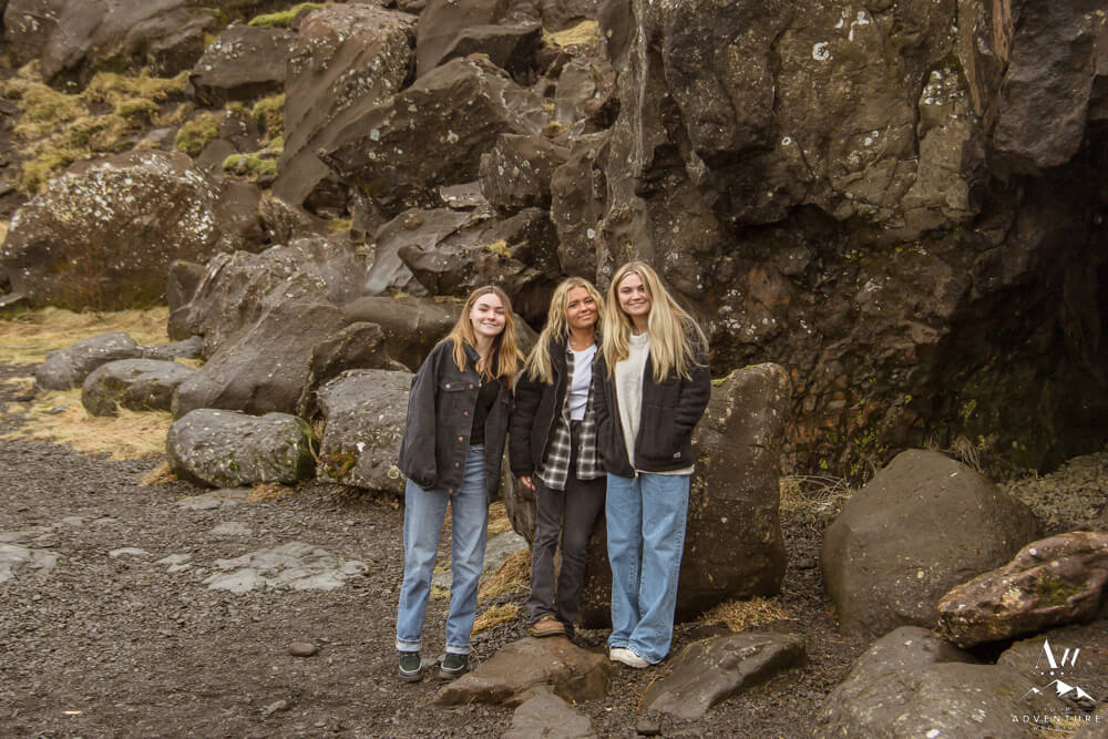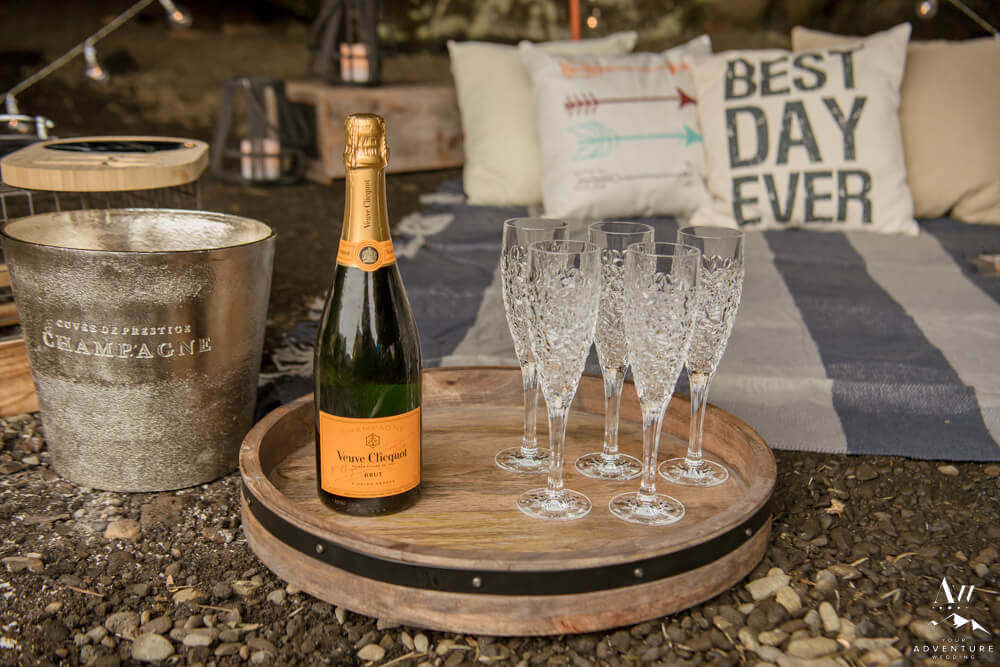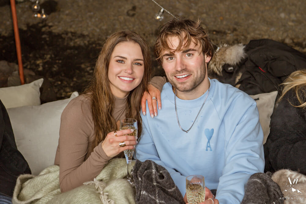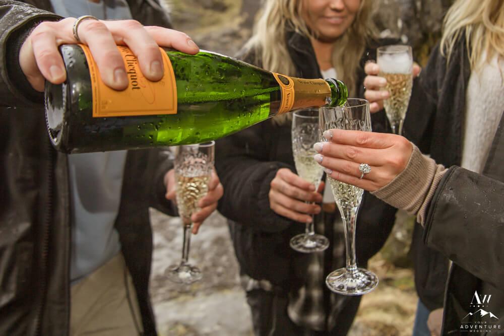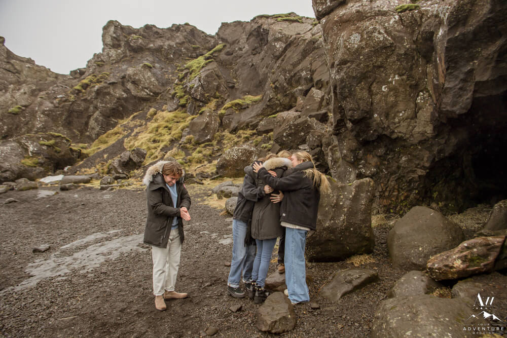 Nick decided it would be extra special to add on a luxury picnic AND fly in her sisters for this monumental moment. How sweet, right?! Therefore, our Iceland proposal team had setup the picnic in a small cave alongside the lake. To illustrate, it was also the perfect place for the sisters to hide and surprise Devin! So Kevin took her hand (as we previously discussed with him) and led her around the corner to see what else awaited her… To say she was surprised was an understatement! The group celebrated with a bottle of Veuve Clicquot!!