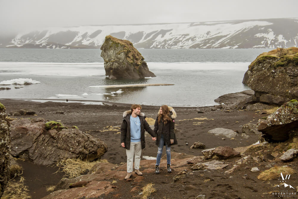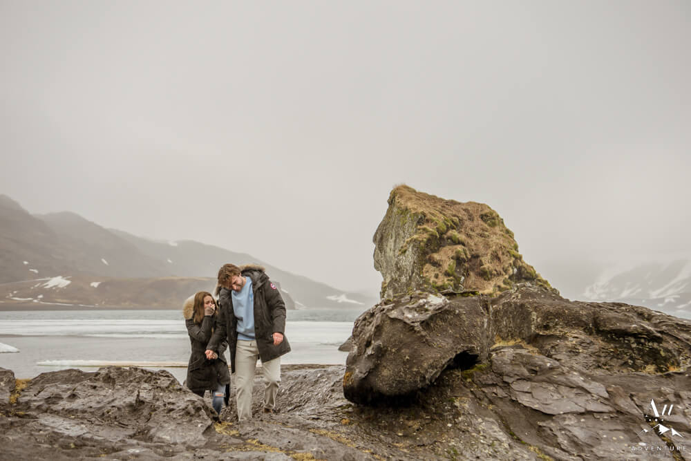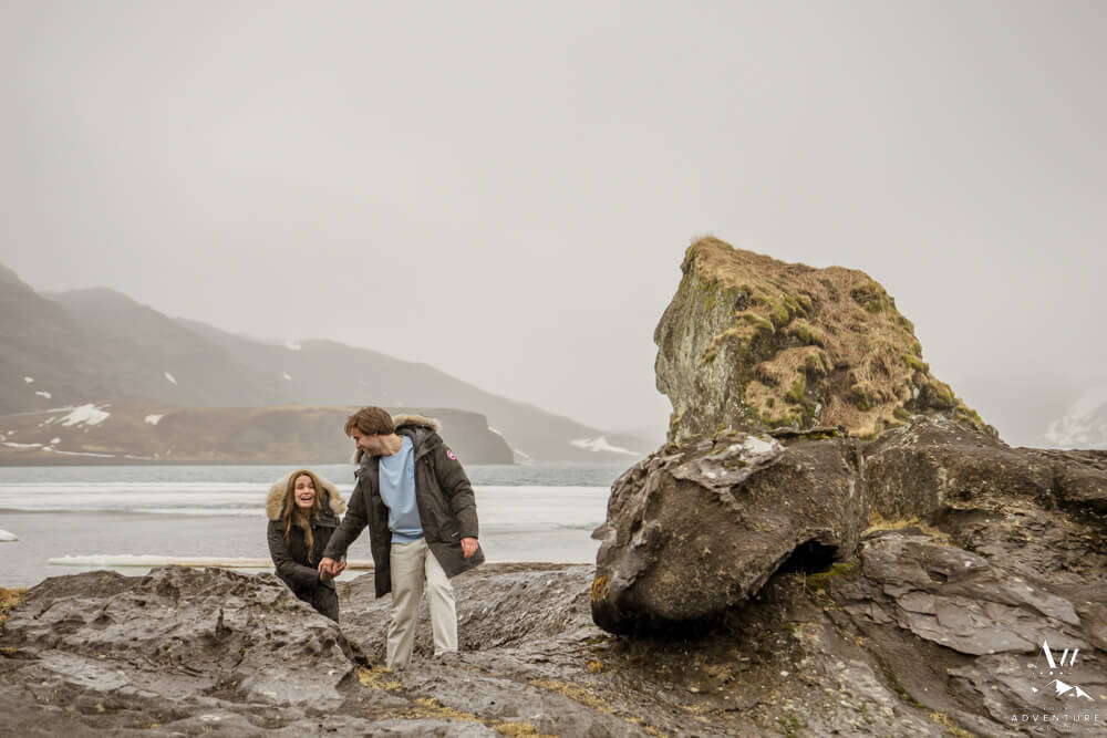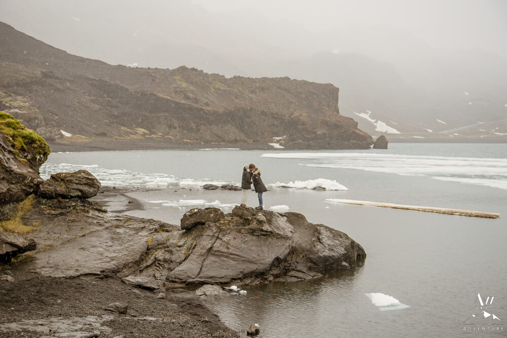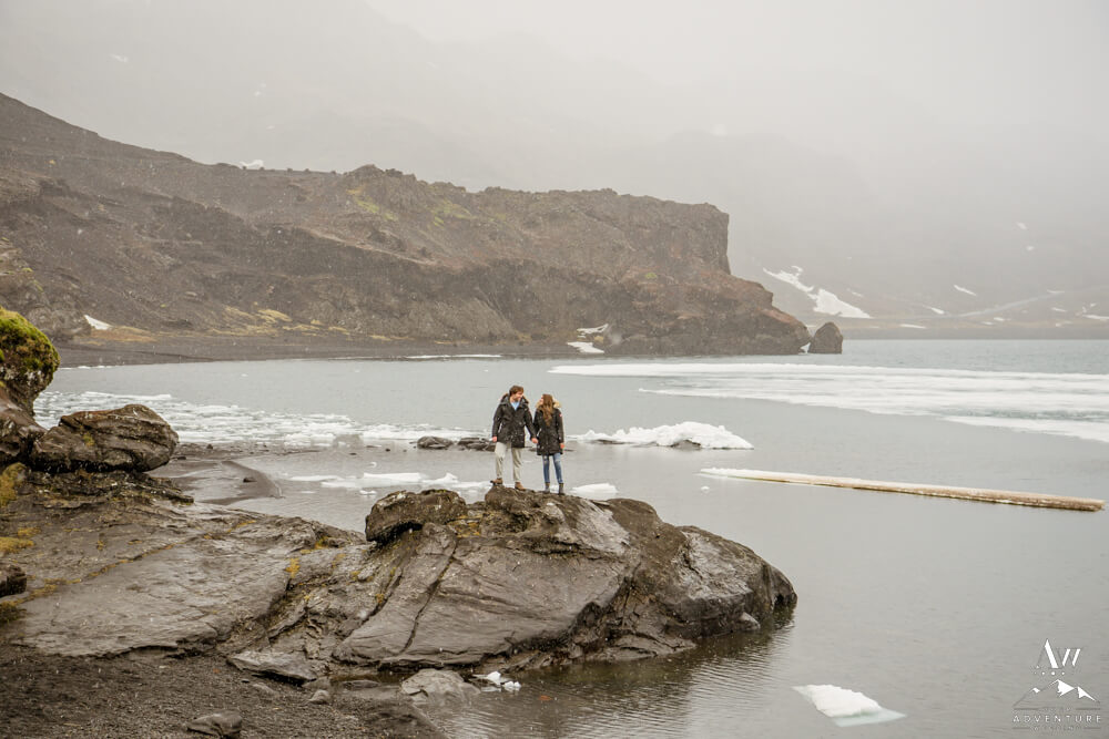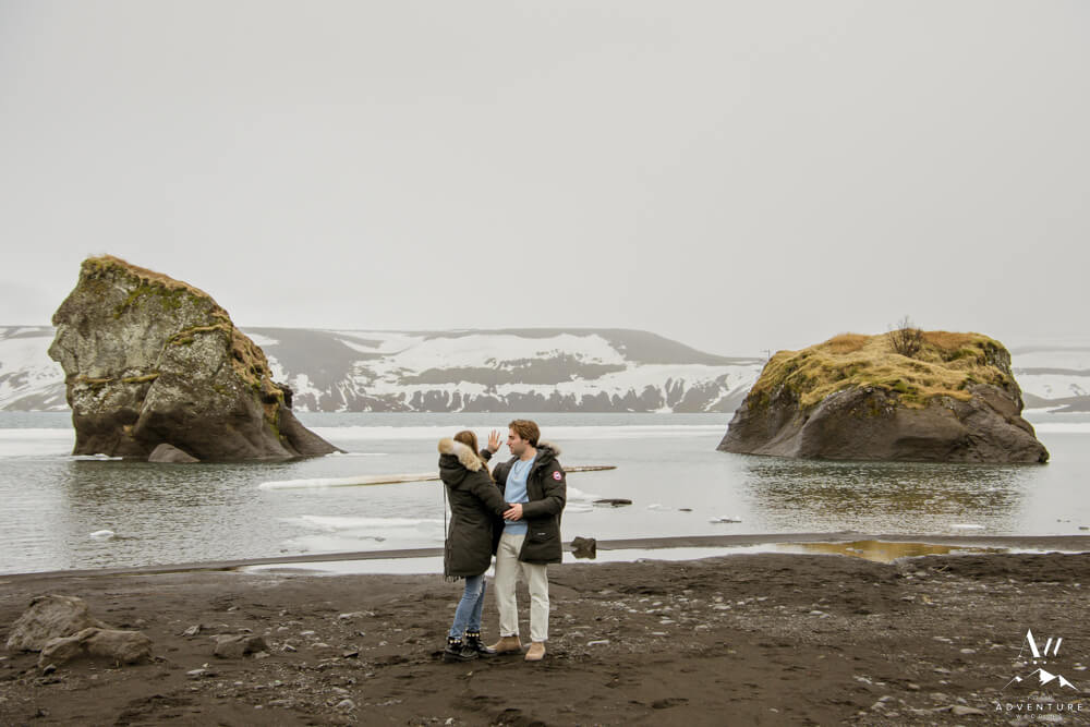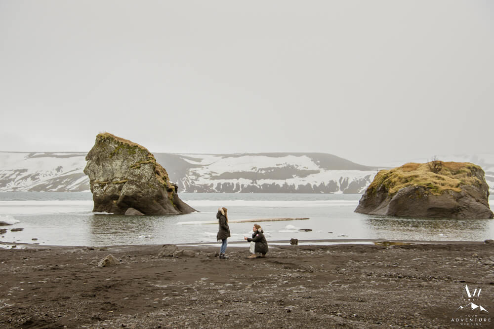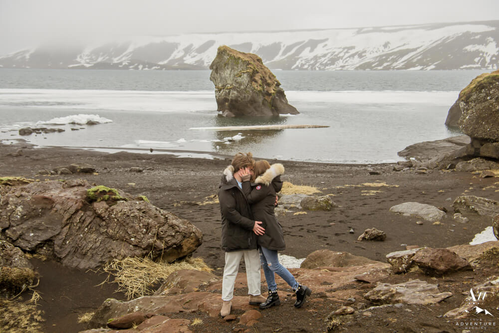 Upon arriving, we’re pretty sure that Devin didn’t even notice our Iceland proposal photographer snapping away as they were landing and checking out the lake. Nick led her over to one of the rock formations, got down on one knee, and proposed a lifetime of traveling and adventuring together! Devin said yes, hugged and kissed him profusely and realized he had organized this lifetime moment to be forever documented!