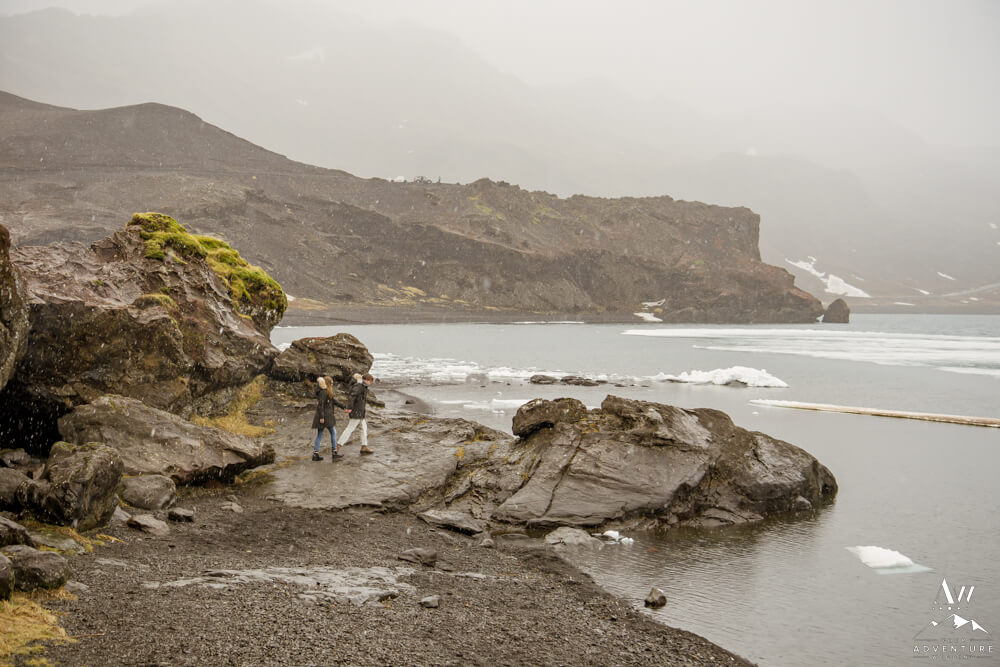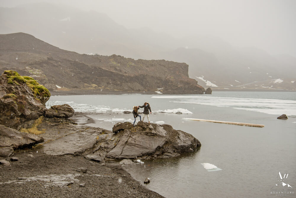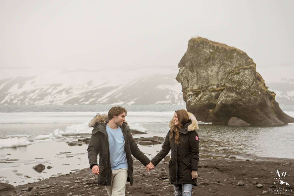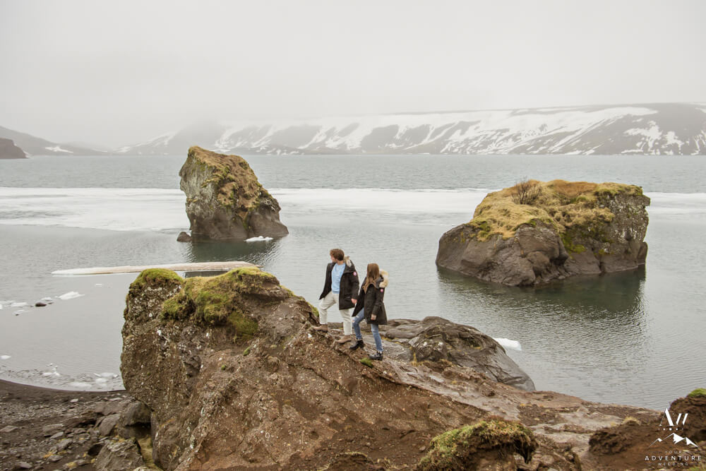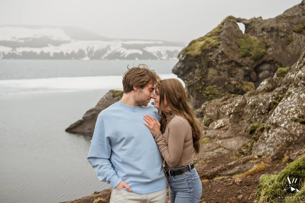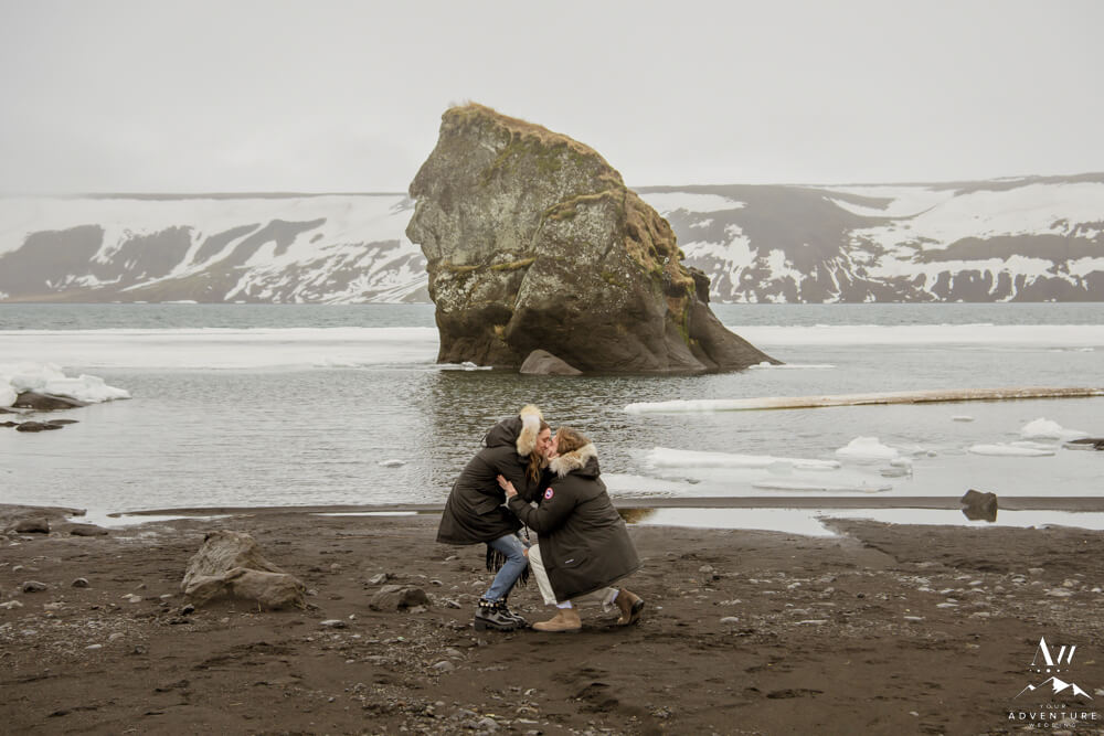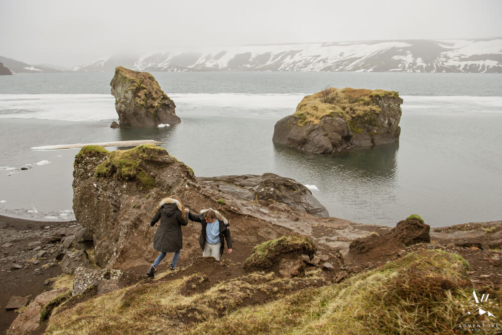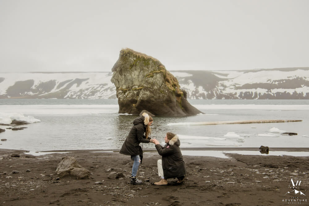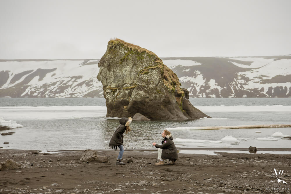 Upon arriving, we’re pretty sure that Devin didn’t even notice our Iceland proposal photographer snapping away as they were landing and checking out the lake. Nick led her over to one of the rock formations, got down on one knee, and proposed a lifetime of traveling and adventuring together! Devin said yes, hugged and kissed him profusely and realized he had organized this lifetime moment to be forever documented!