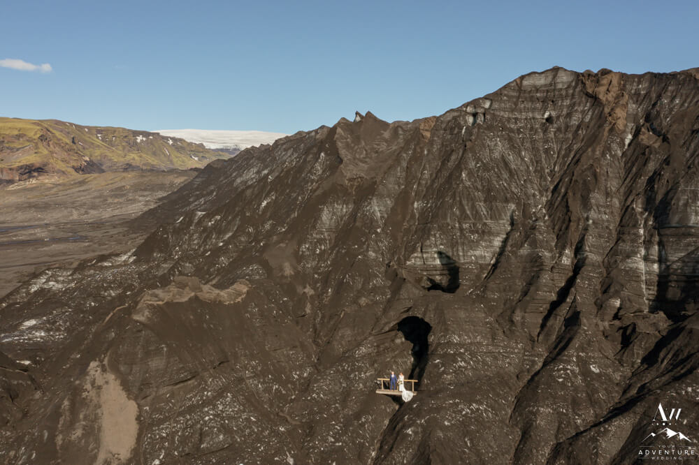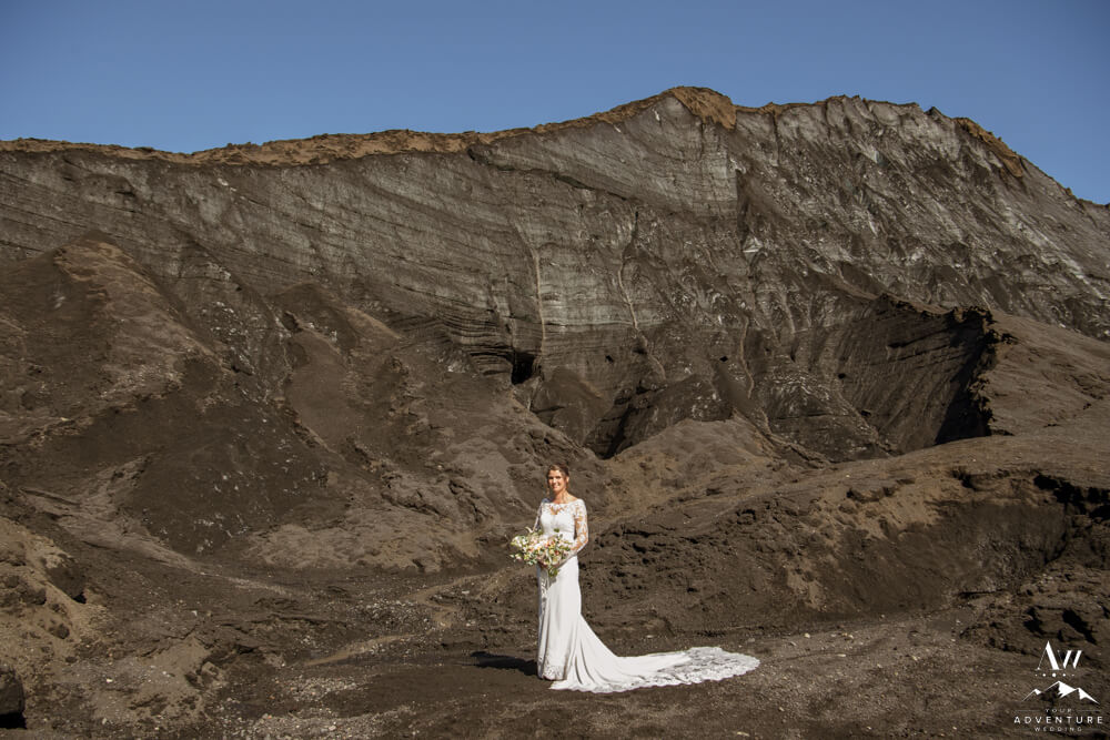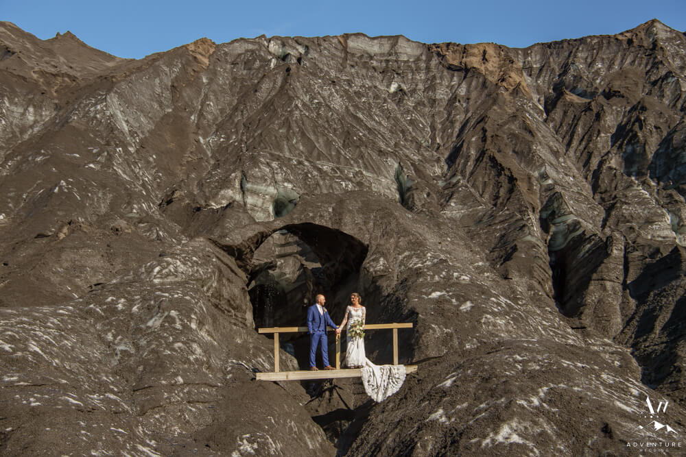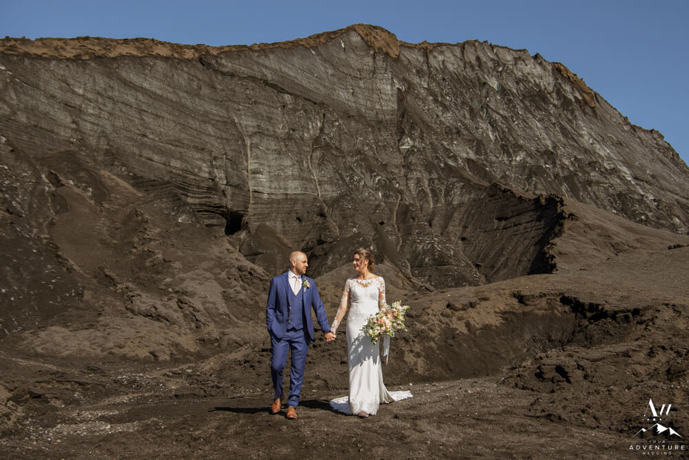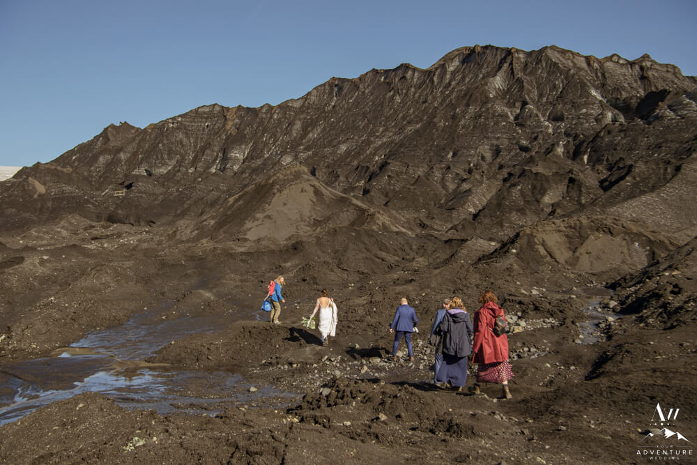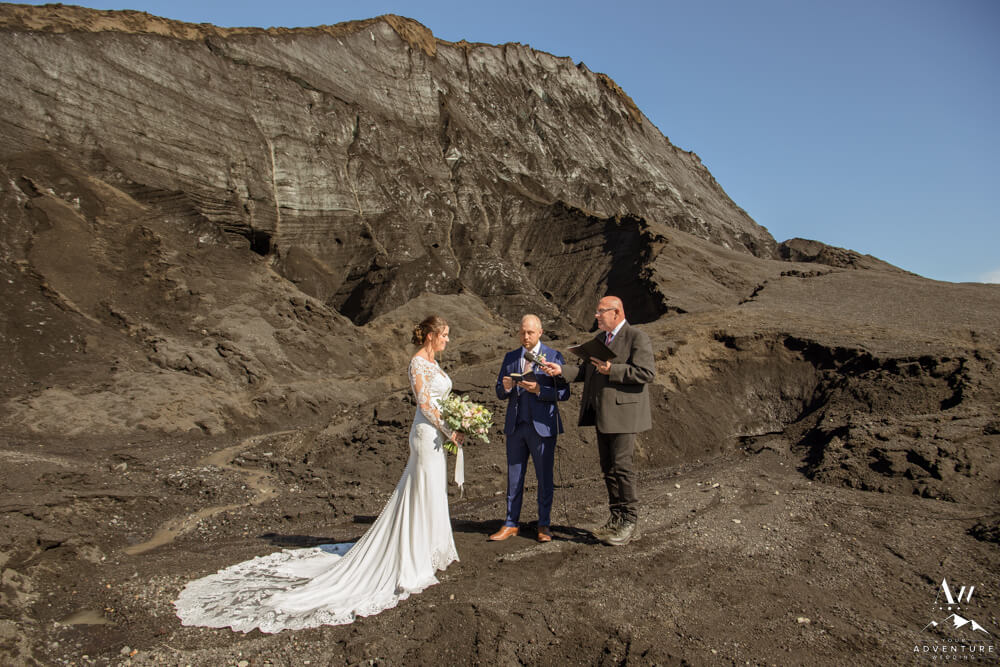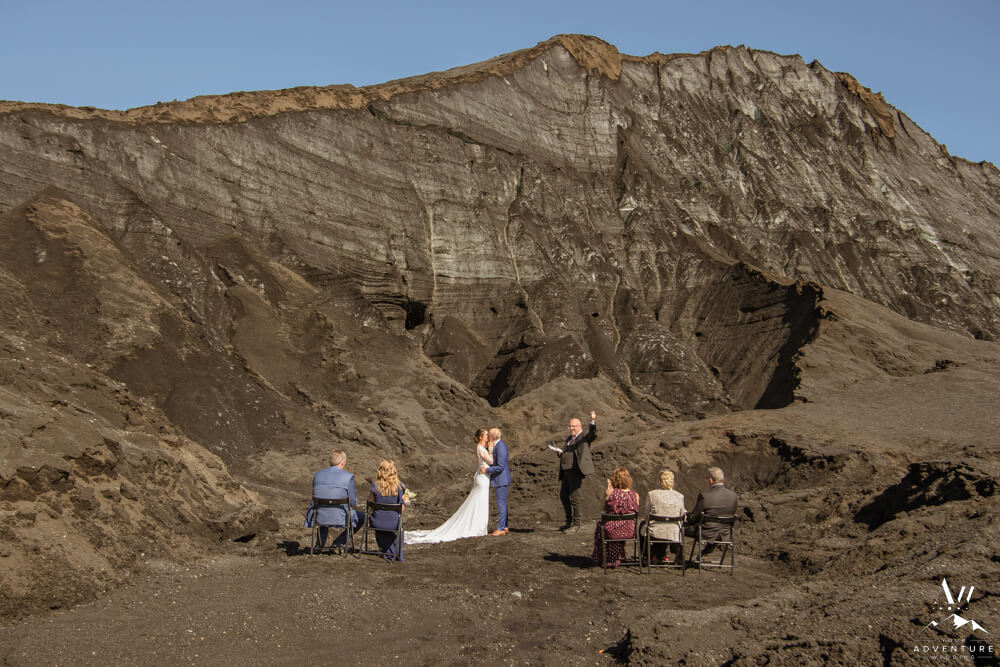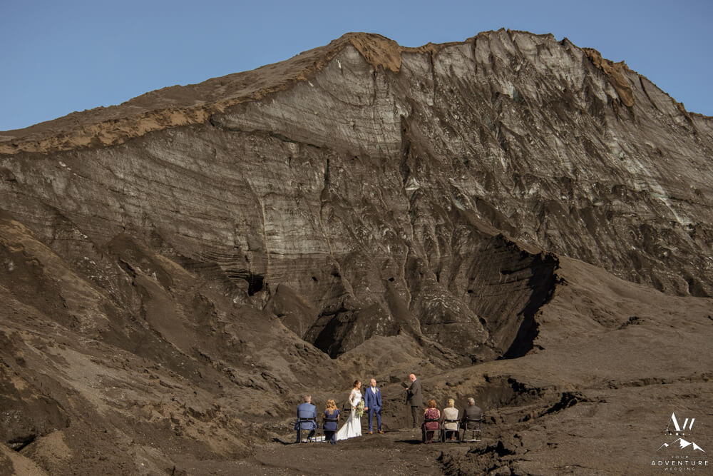 Furthermore, in exploring this glacier you’ll feel like you’re part of history!  How fun for Tom, Haley, and their guests to experience has part of their wedding expedition!!  After a hike, our Iceland Wedding Planner team setup a sweet seated ceremony and speaker system in front of a few small black glacier waterfalls.  The two held a warm, private, sunny ceremony in front of the glacier, it was perfect including their personal vows!