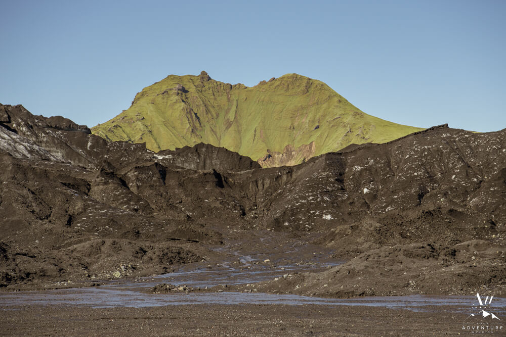 Outside of the tiny town of Vik Iceland, there is a very black glacier named Mýrdalsjökull.  It is black because of a few reasons… To illustrate, there is a sub-glacier volcano lying underneath named Katla.  So when she previously erupted she through lots of ask, sand, pumice, etc into the air and onto the glacier over hundreds of years.  Also, flooded the area  Maybe even bringing a tsunami which in-turn brought in lots of sand in the flood zones near the glacier outlet.  Additionally, the black desert area often has sand storms which pummels the glacier over and over again.