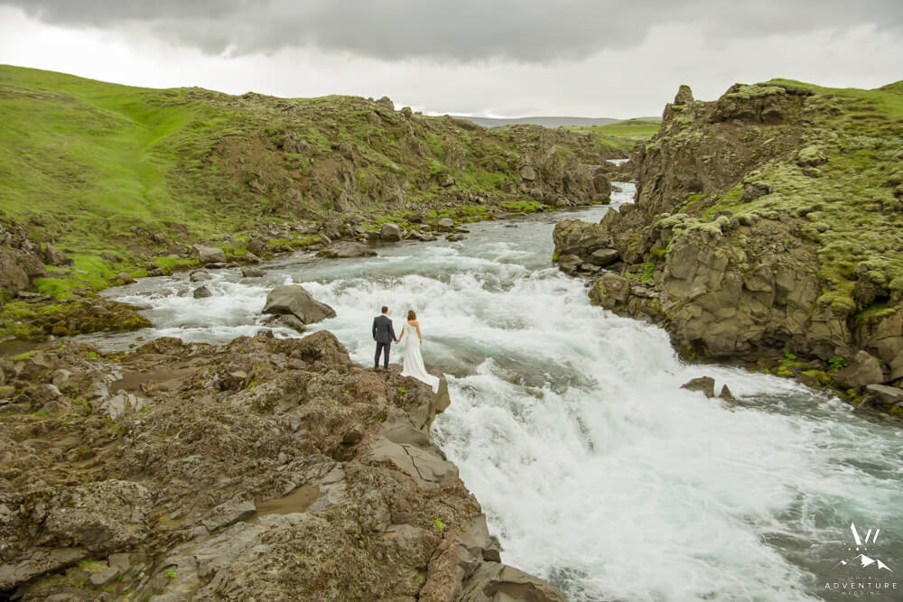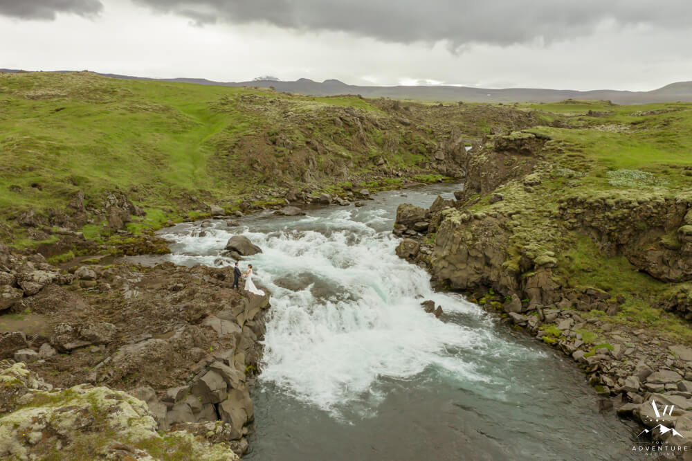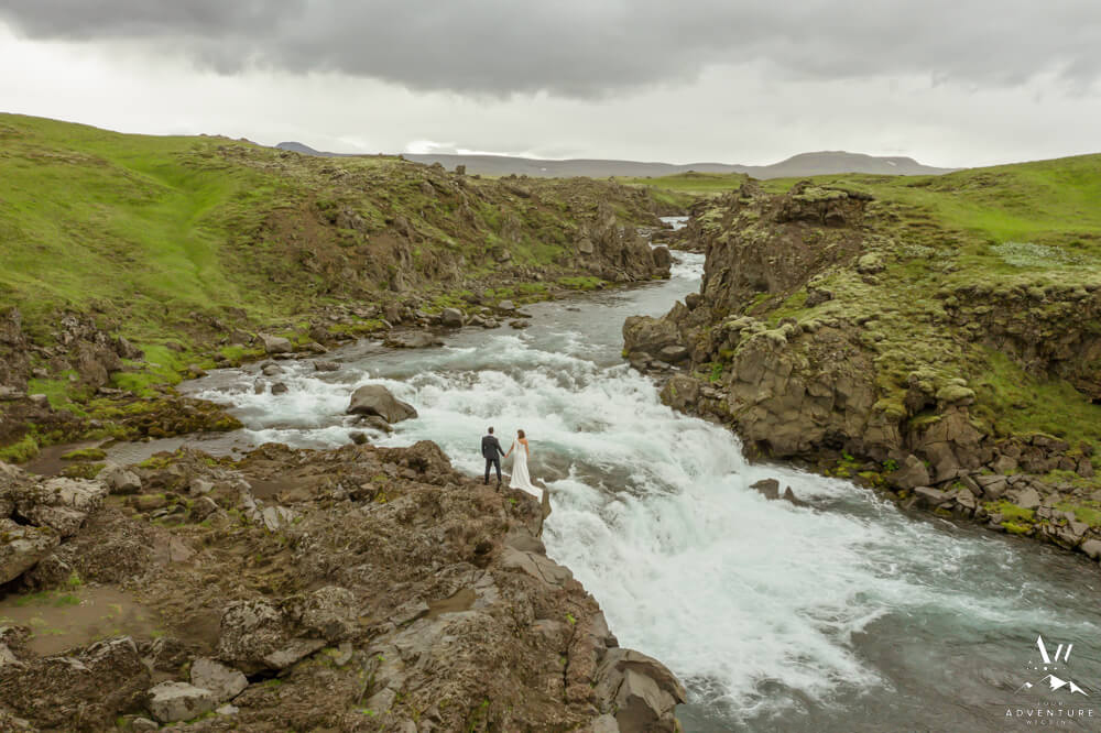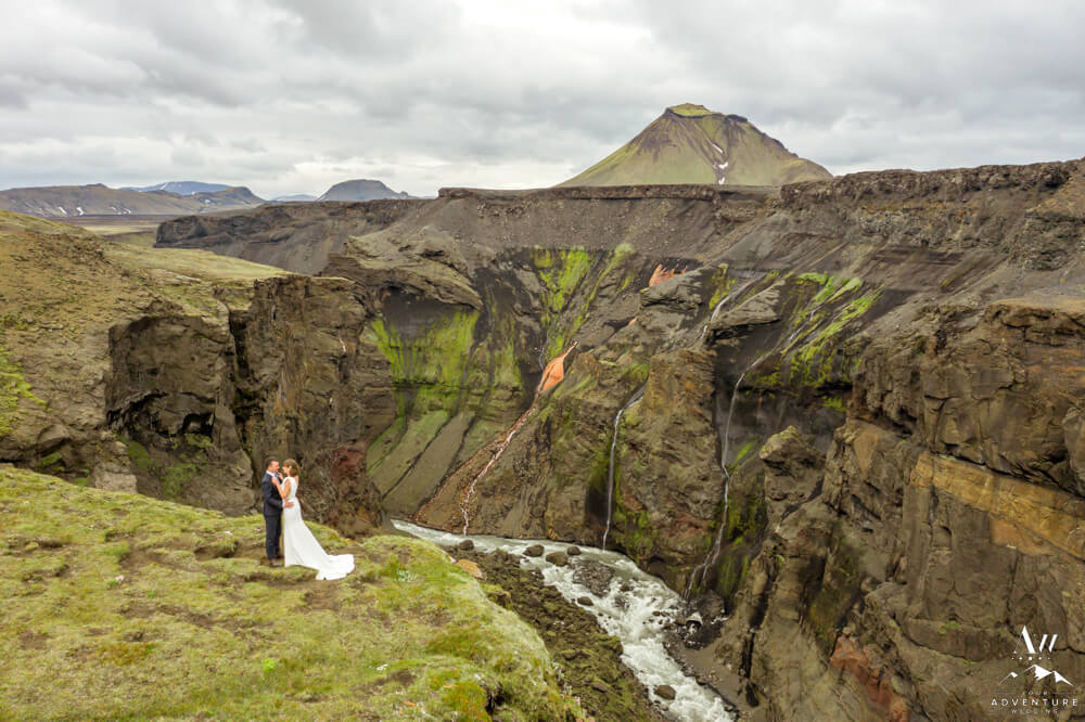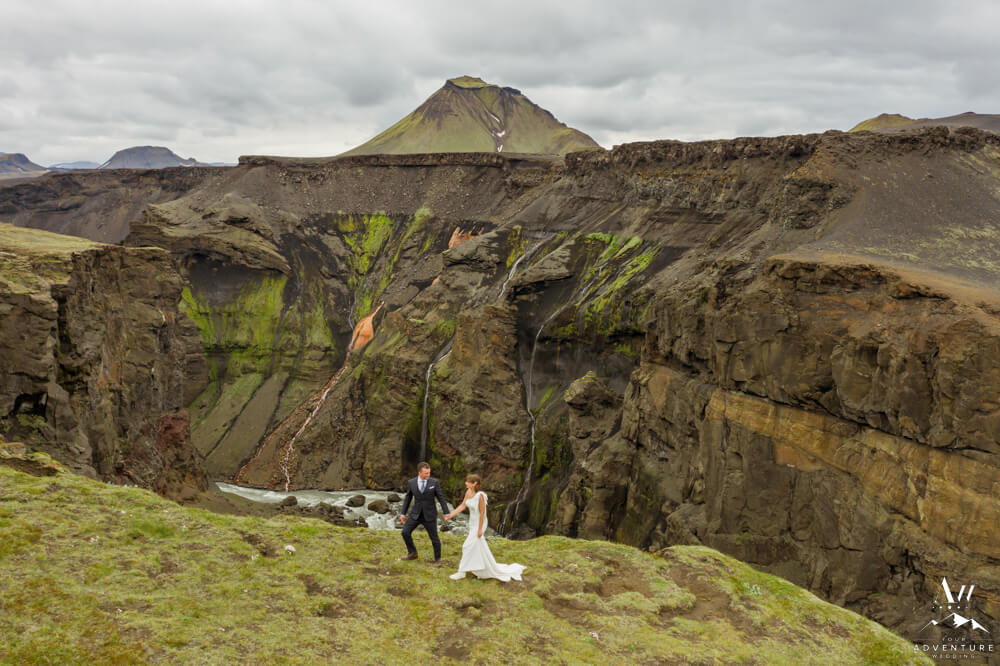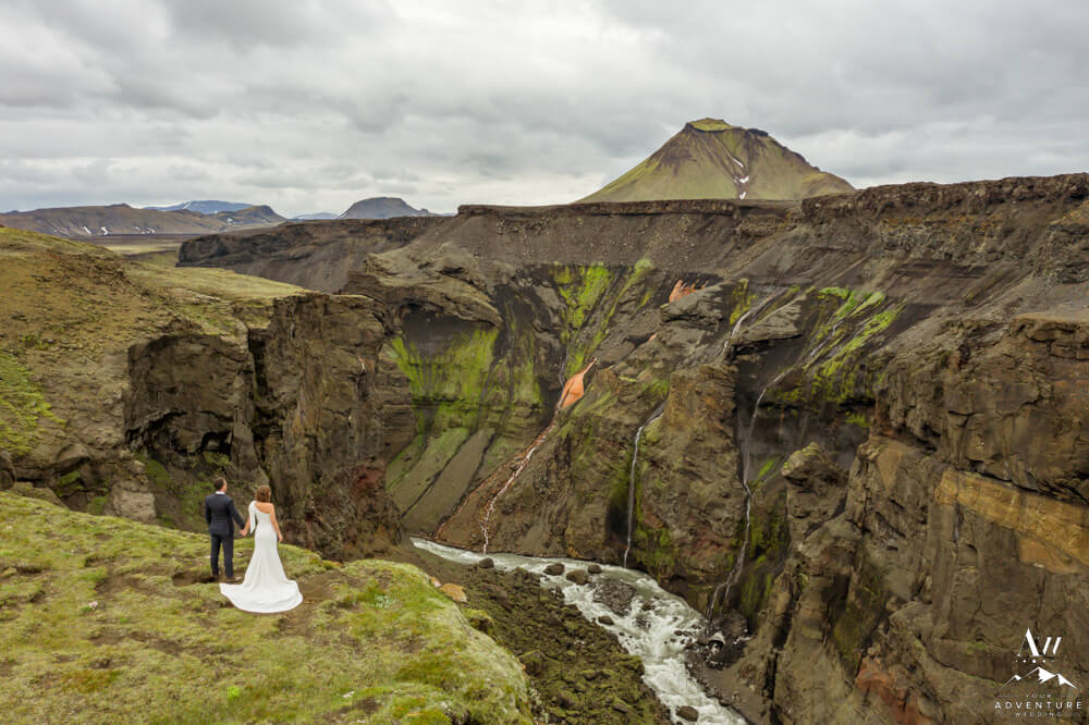 The ultimate goal of an experience driven highland elopement in Iceland is to connect on a deeper level. One that elevates your relationship and gives you once in a lifetime vibes. Specifically creating memories that you’ll look back and be like “THAT was our WEDDING DAY!” So after being married cliffside it was time to hike down into the canyon to explore more. Our Iceland elopement photographer crafted some amazing images both from the ground and the drone as you’ll see below!