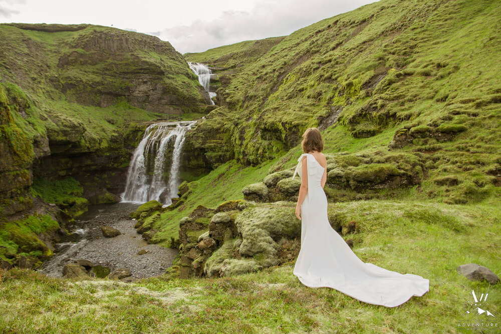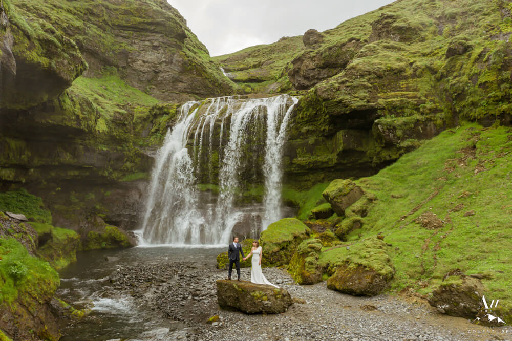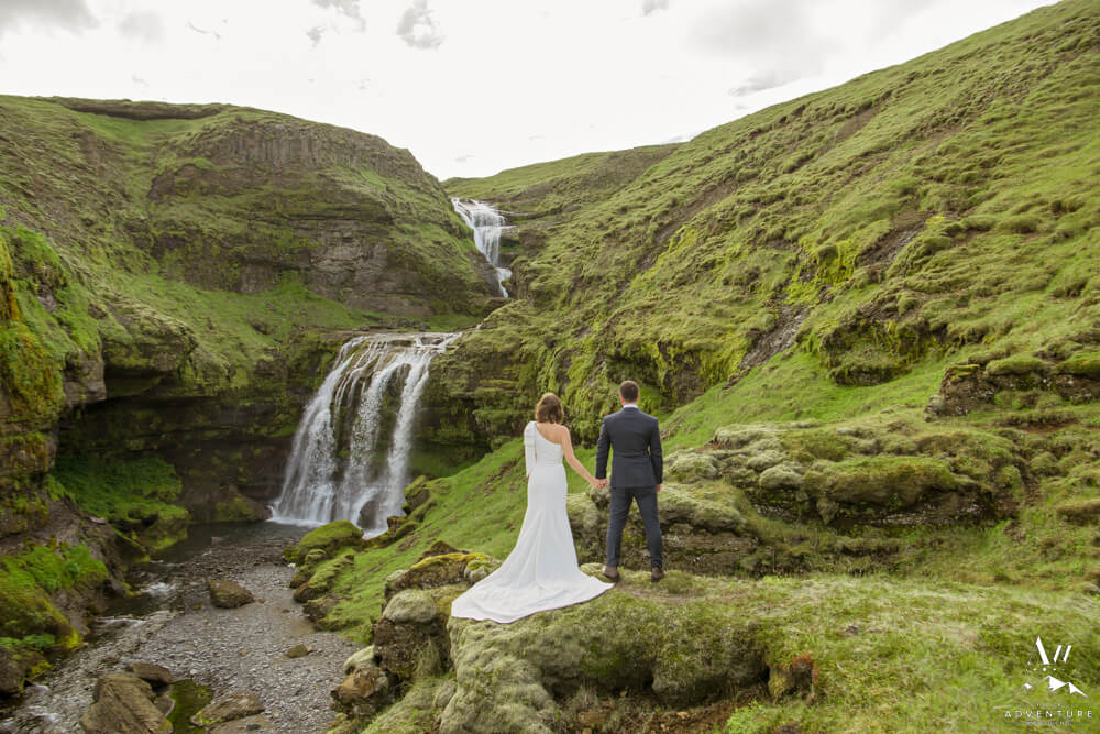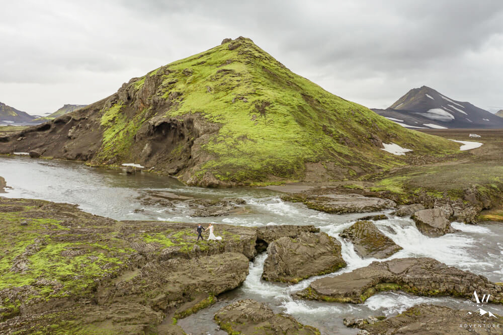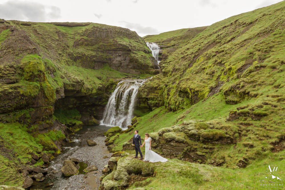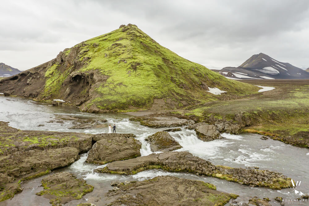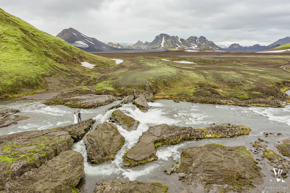 The ultimate goal of an experience driven highland elopement in Iceland is to connect on a deeper level. One that elevates your relationship and gives you once in a lifetime vibes. Specifically creating memories that you’ll look back and be like “THAT was our WEDDING DAY!” So after being married cliffside it was time to hike down into the canyon to explore more. Our Iceland elopement photographer crafted some amazing images both from the ground and the drone as you’ll see below!