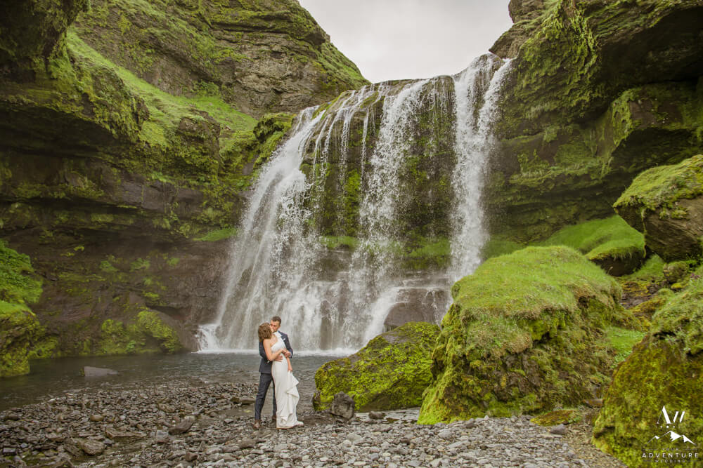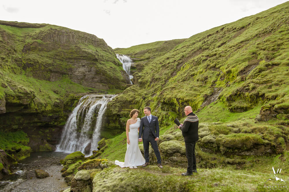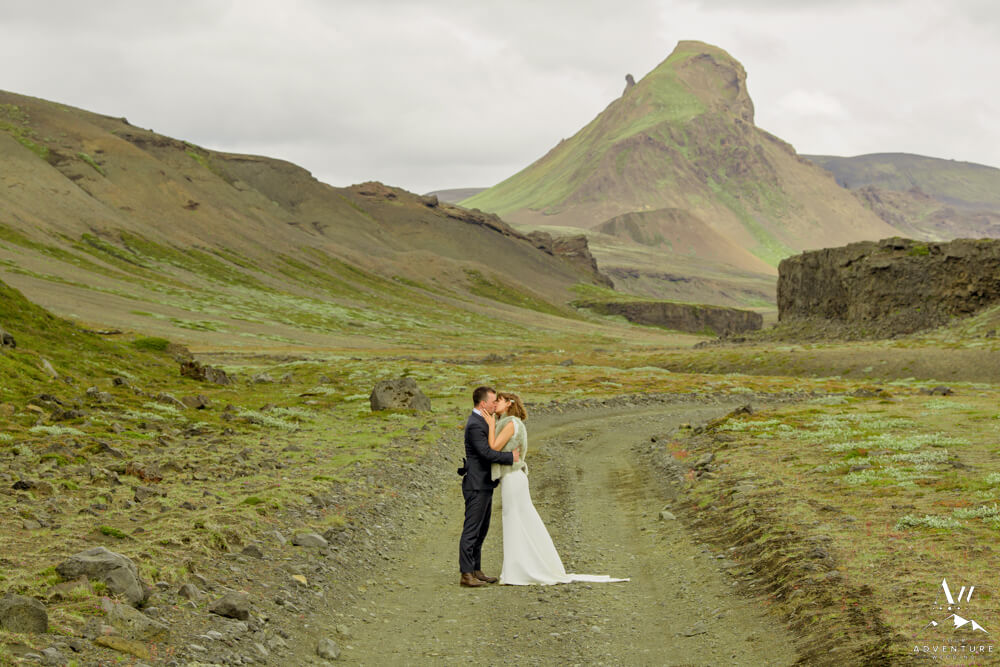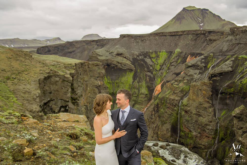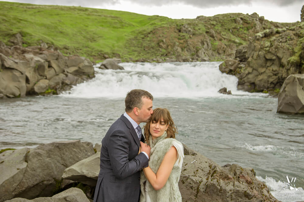 Therefore, into the the interior of Iceland for their highland elopement they went! After picking up our favorite Pastor at a strategic point, the ceremony was held high up on cliffs with a multi-tiered waterfall behind. It felt exciting yet iconic at the same time. The pair exchanged personal vows, rings, and sealed the damn thing with a kiss!!