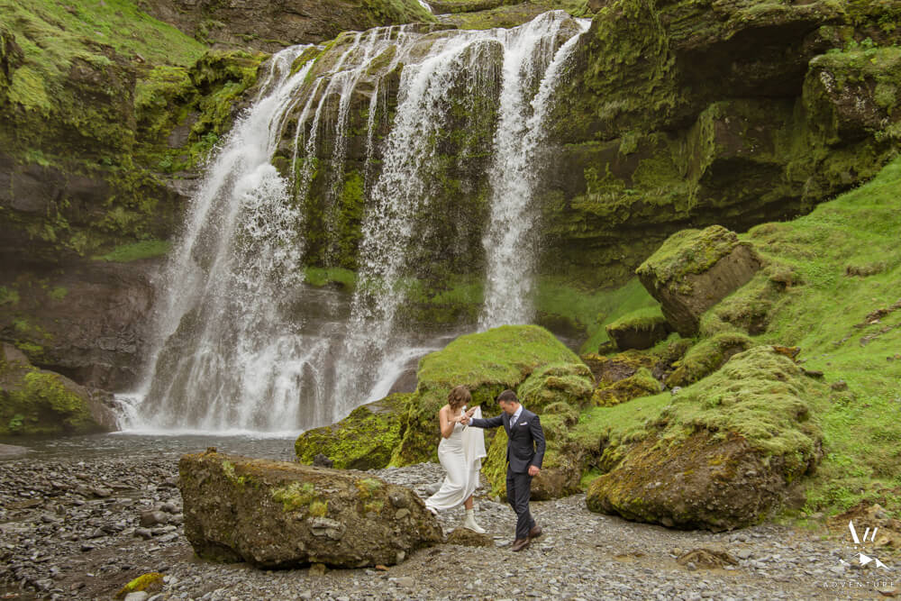 Unique bodies of water are found all over Iceland. However the best one in our humble opinion are raging rivers. To illustrate, depending on the geography of the landscape the river runs through there are often high or low waterfalls. Although we scouted this waterfall area years ago, Christine and Vladimir were the first to visit with us which is always a thrill! And who doesn’t want to be the first somewhere during their highland elopement?!