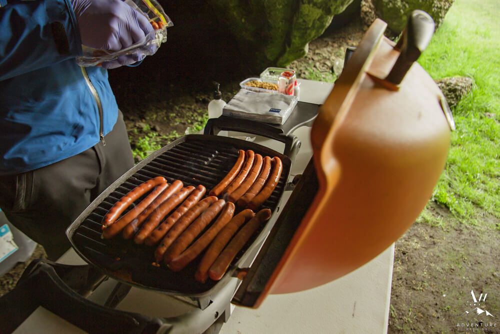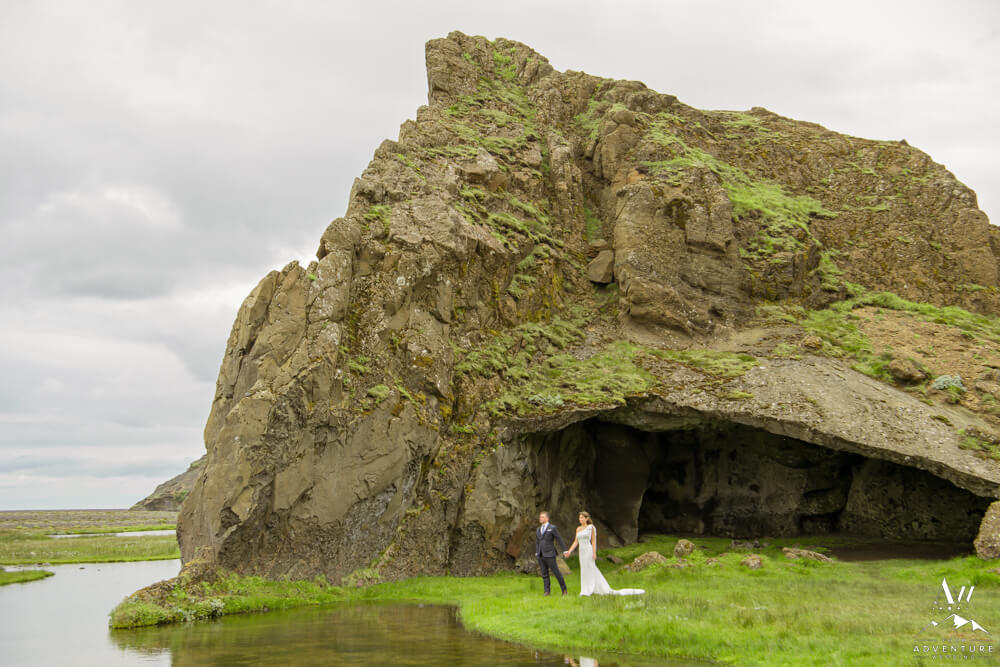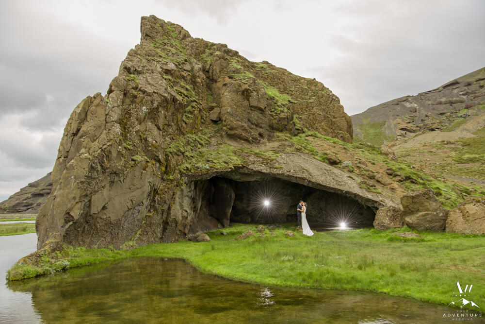 Next on Christine and Vladimir’s highland elopement adventure was having lunch in a natural cave! Meanwhile, before they tried a traditional Icelandic hot dog BBQ, they thorough discovered the area. Then after a hot dog or two, they tried Landi (Icelandic moonshine)!