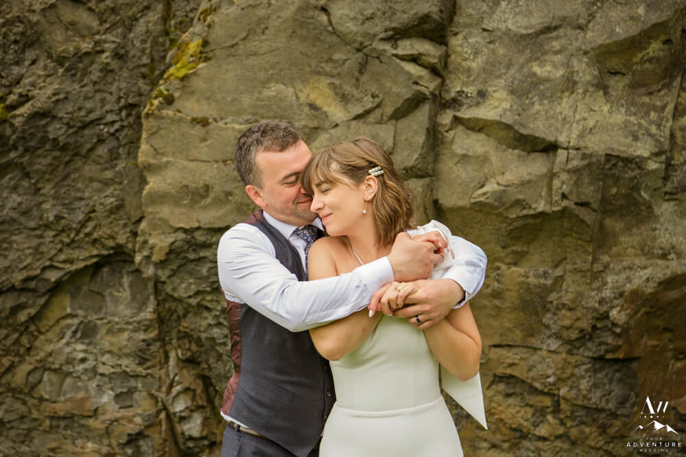 Affection increases when the weather in Iceland changes. Maybe because the wind whips through you and snuggling helps! 😉 Especially when you’re on top of a canyon and the wind swirls. So Christine and Vladimir hugged a little tighter between highland elopement photos and adventuring. We cannot blame them!! But #worthit!