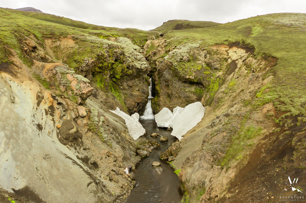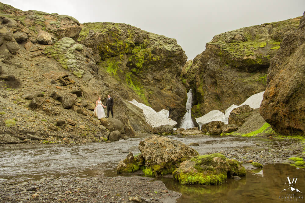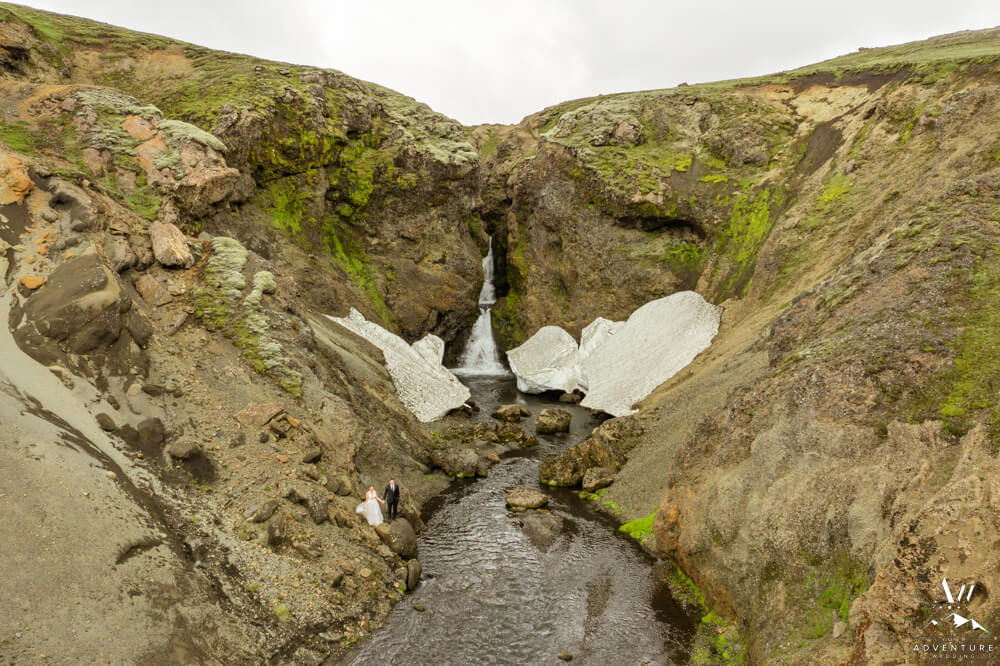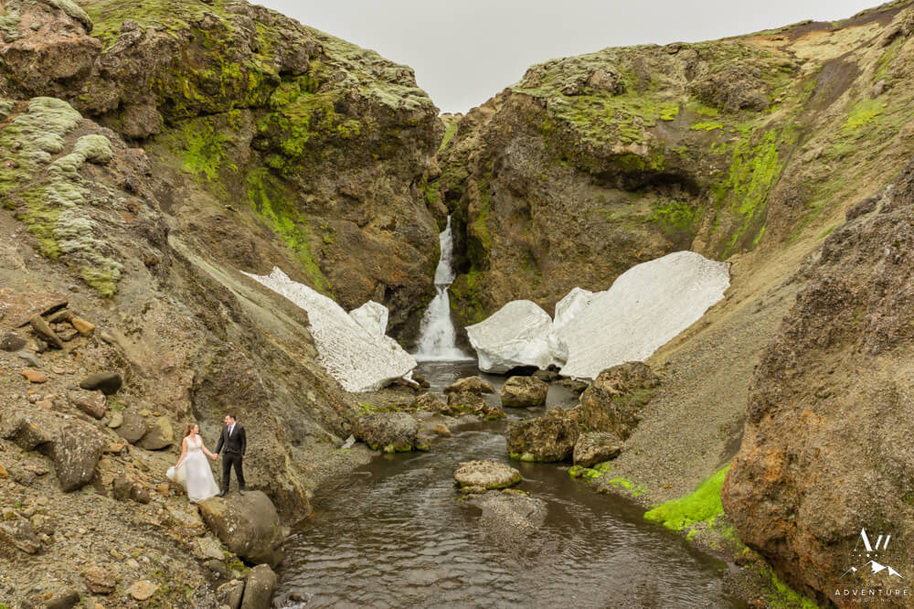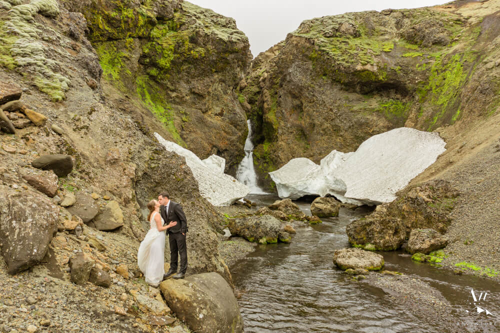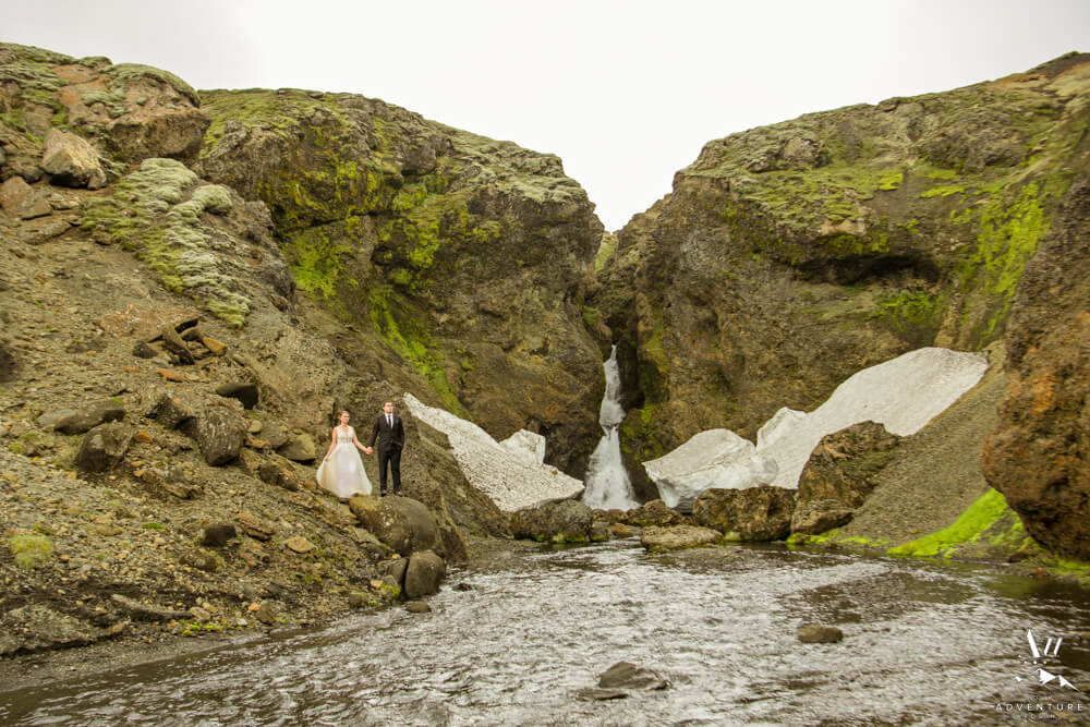 In some parts of the Icelandic highlands, summer never came this year.  Hard to believe, I know but it’s true!  Likewise, some of the interior roads didn’t open until late July and than somehow became “impassable” again come mid-August because winter reared it’s head early.  But luckily our impromptu stop at this scouted-only waterfall had just a bit of snow sticking around.  Therefore, the newlyweds hikes down into the canyon to experience its beauty!  Truly a perfect addition to their Iceland July wedding journey!!