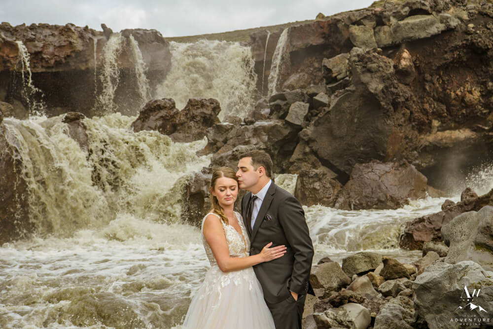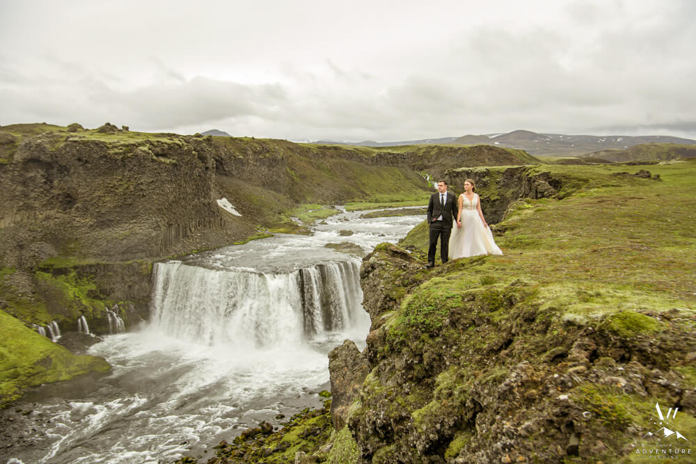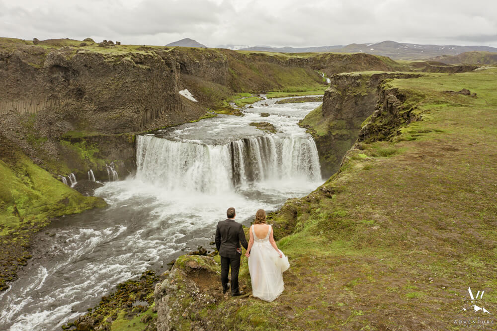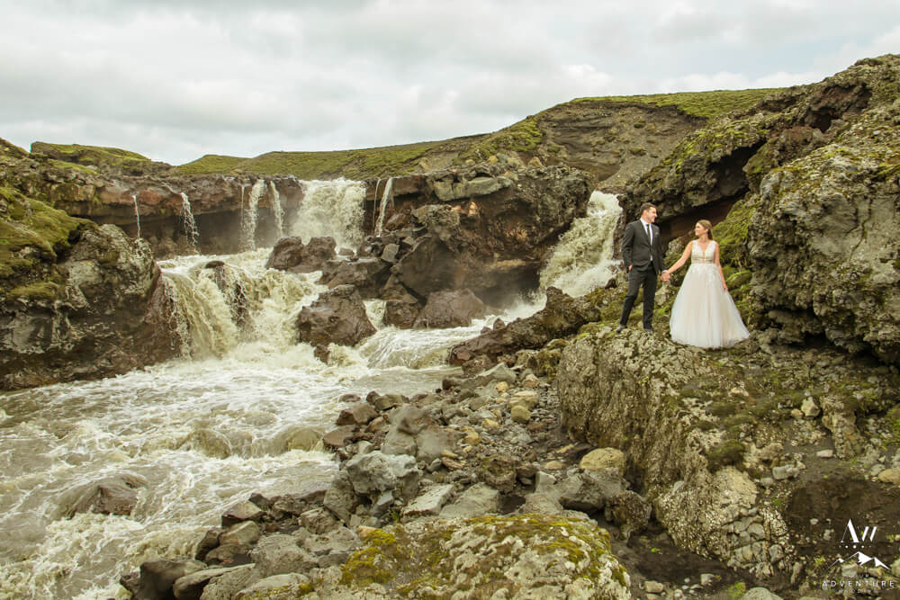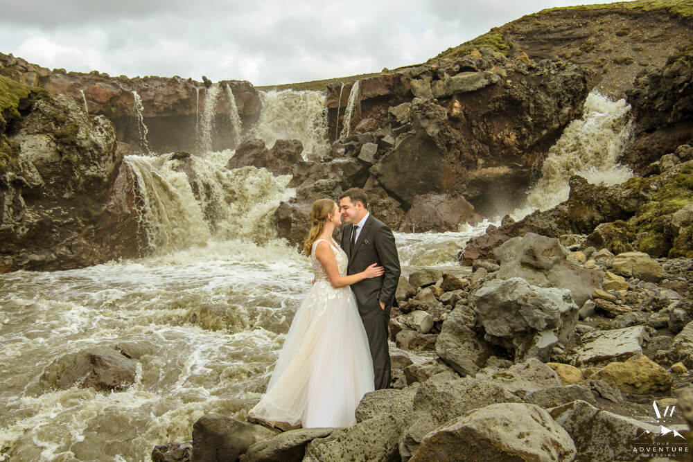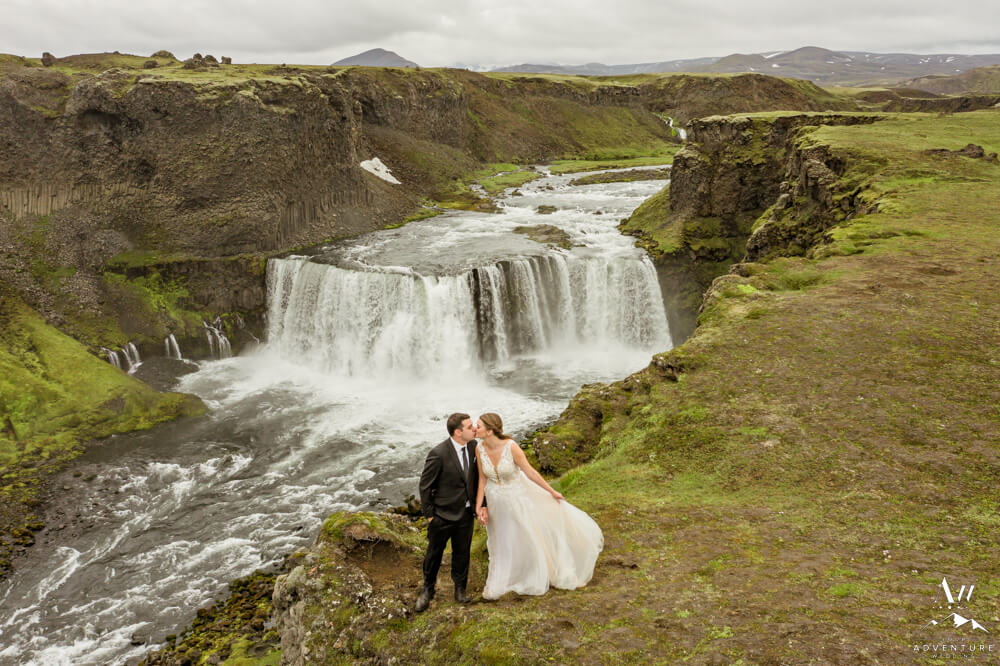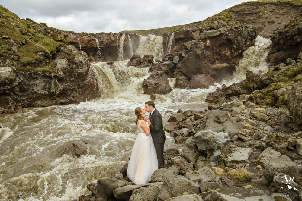 In some parts of the Icelandic highlands, summer never came this year.  Hard to believe, I know but it’s true!  Likewise, some of the interior roads didn’t open until late July and than somehow became “impassable” again come mid-August because winter reared it’s head early.  But luckily our impromptu stop at this scouted-only waterfall had just a bit of snow sticking around.  Therefore, the newlyweds hikes down into the canyon to experience its beauty!  Truly a perfect addition to their Iceland July wedding journey!!