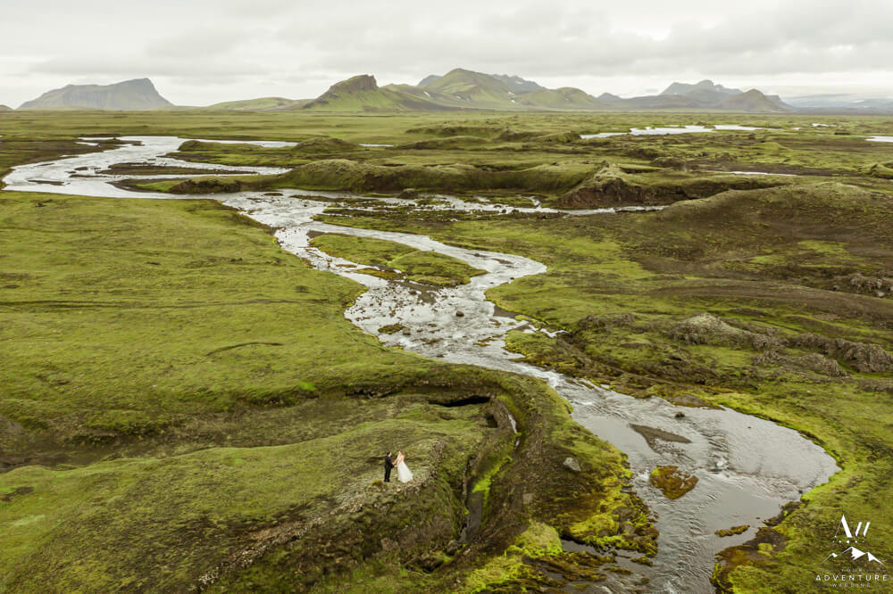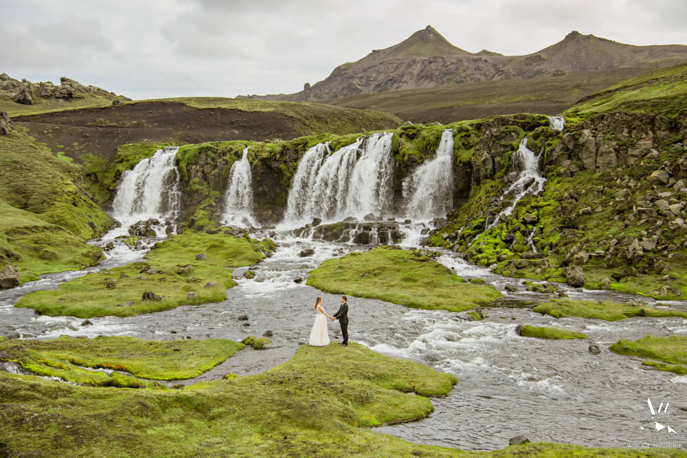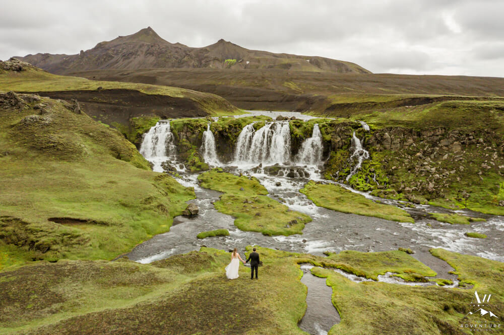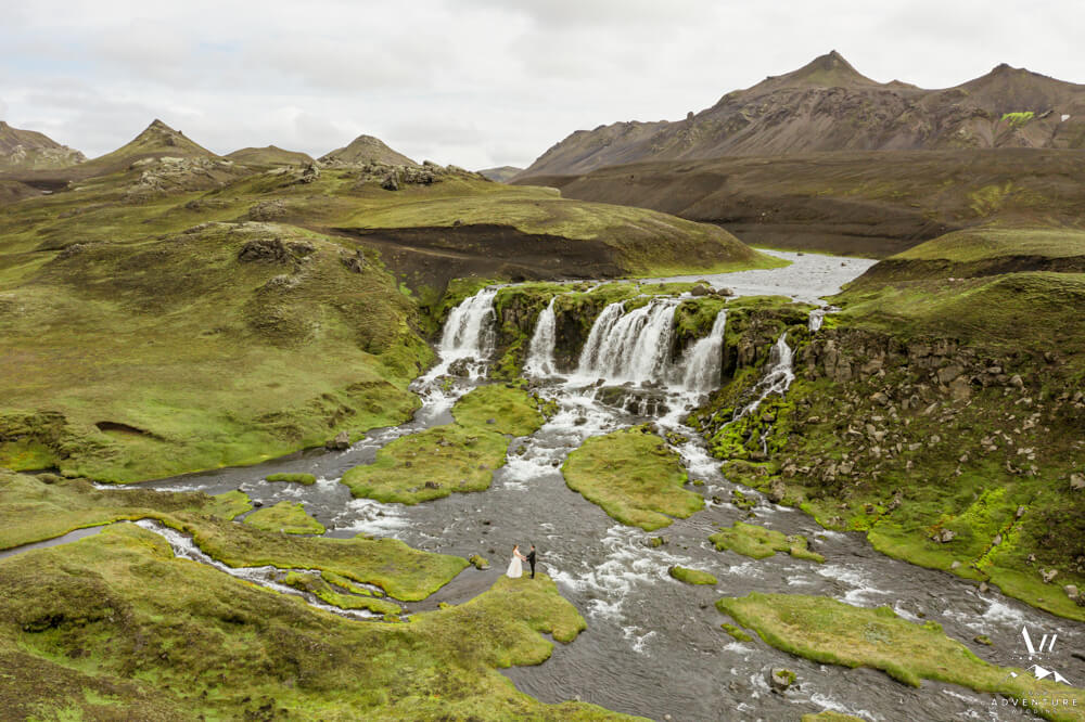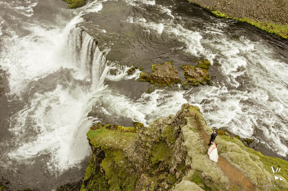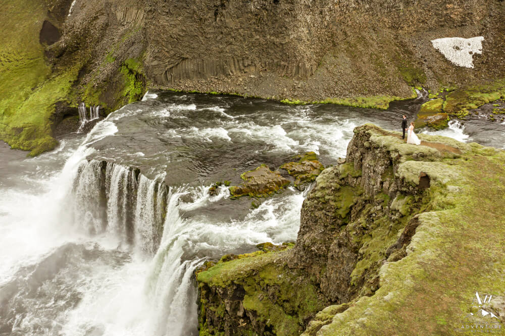 As if their Iceland July wedding ceremony waterfall wasn’t big enough, they had to one up it and discover a gigantic one!  Freaking nuts from the ground but somehow even more powerful seeing the perspective from our adventure wedding photographers drone!!