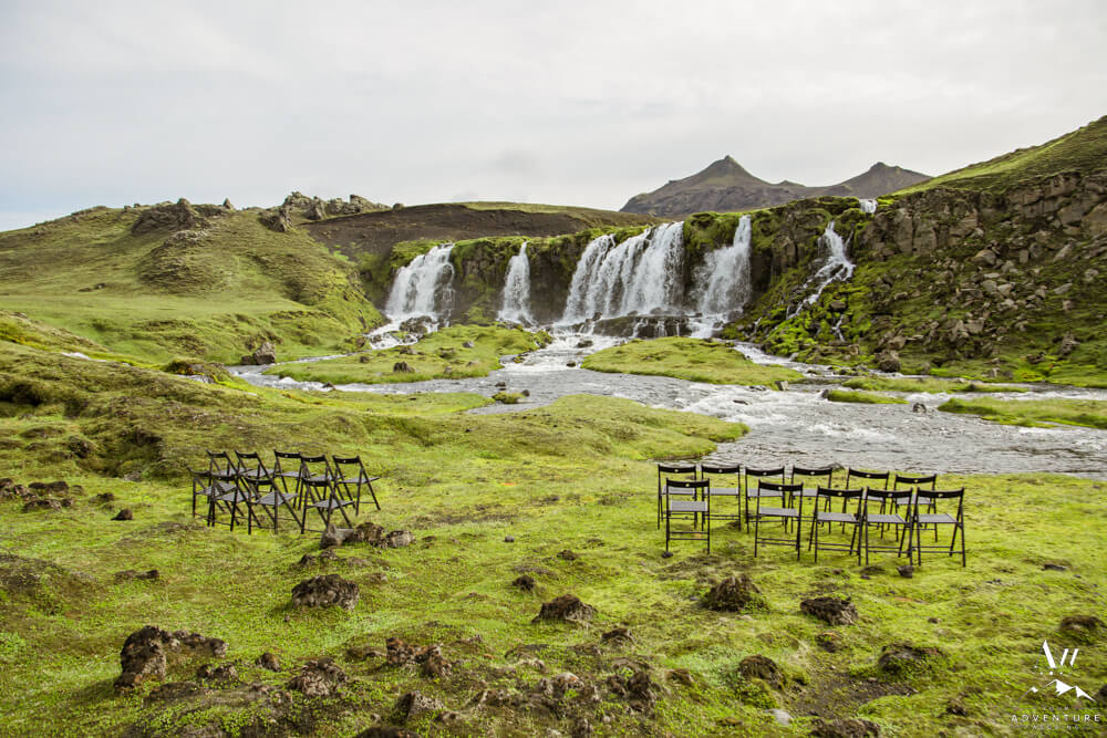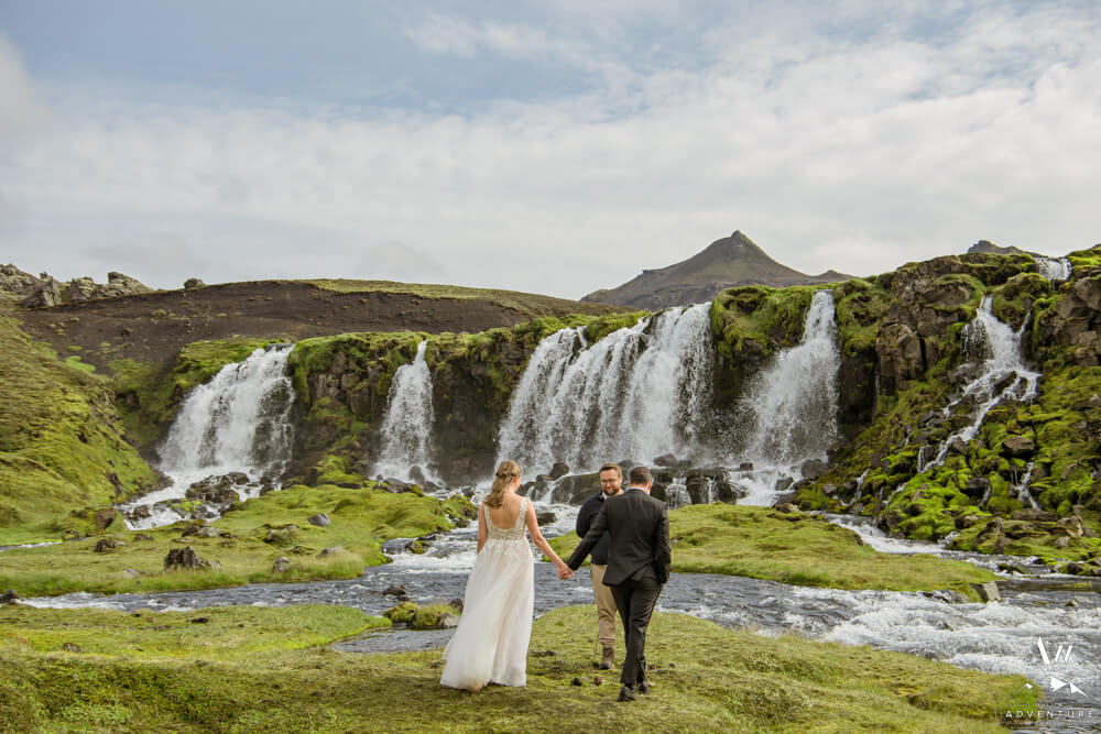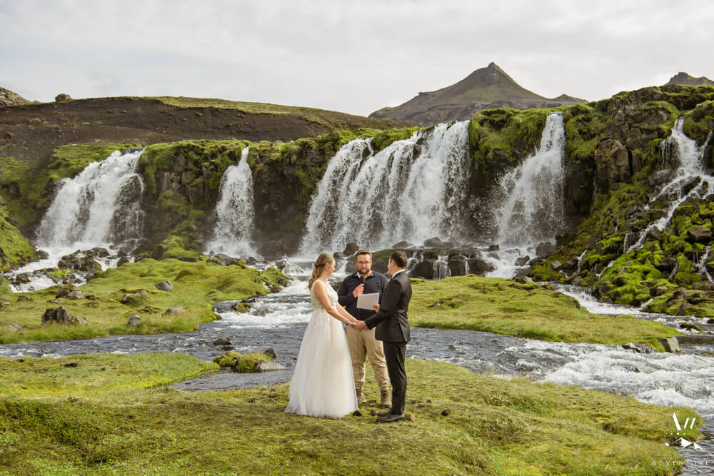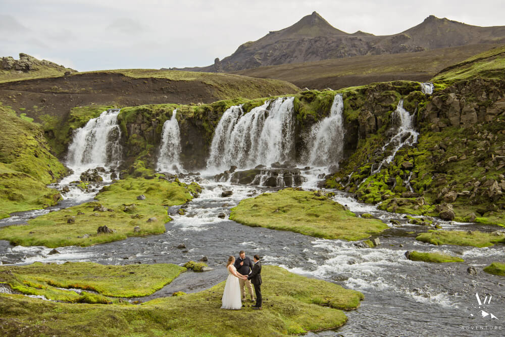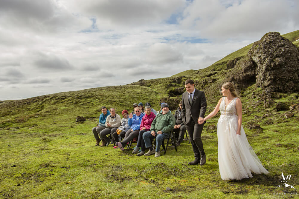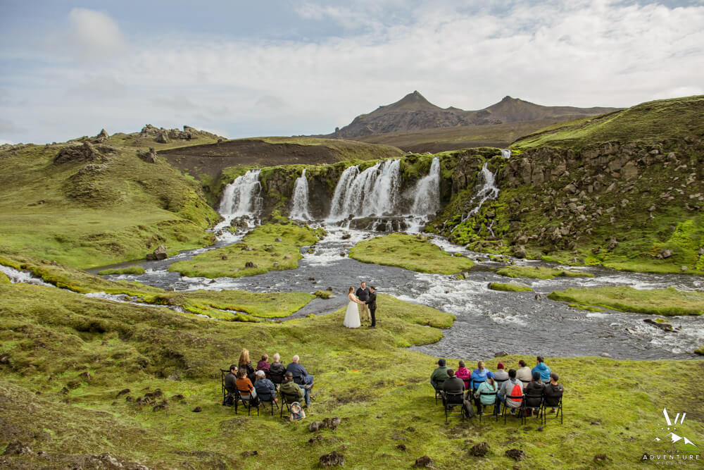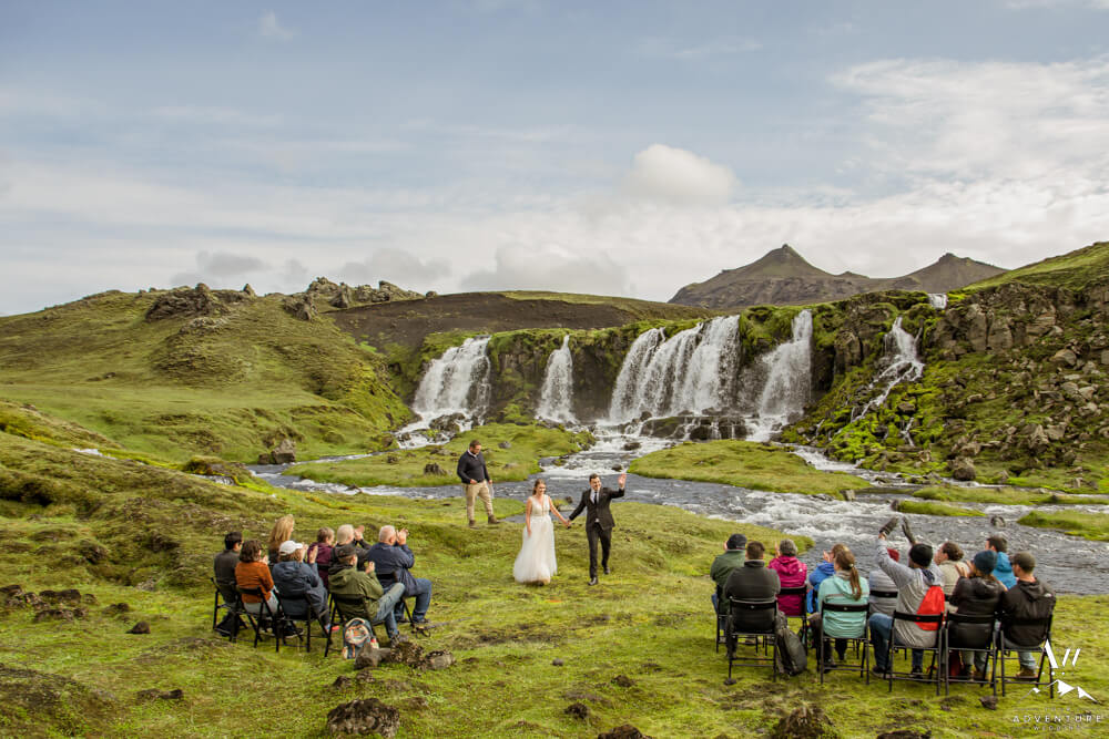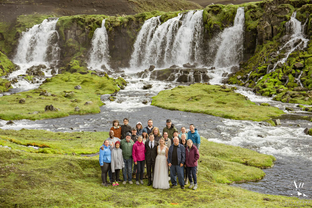 Upon arriving to the Iceland wedding ceremony location, everyone was astonished!  Never had anyone ever been to a remote waterfall that was just there for them.  No tourists, no ropes, no signs, no barriers.  Next, our Iceland Wedding Planner team got to work setting up chairs, sound system, and seating guests.  Cortney and Ben romantically walked down the aisle together.  One of their favorite people performed a symbolic ceremony.  Meanwhile, they exchanged candid personal vows, rings, and partied down the aisle way afterwards!
