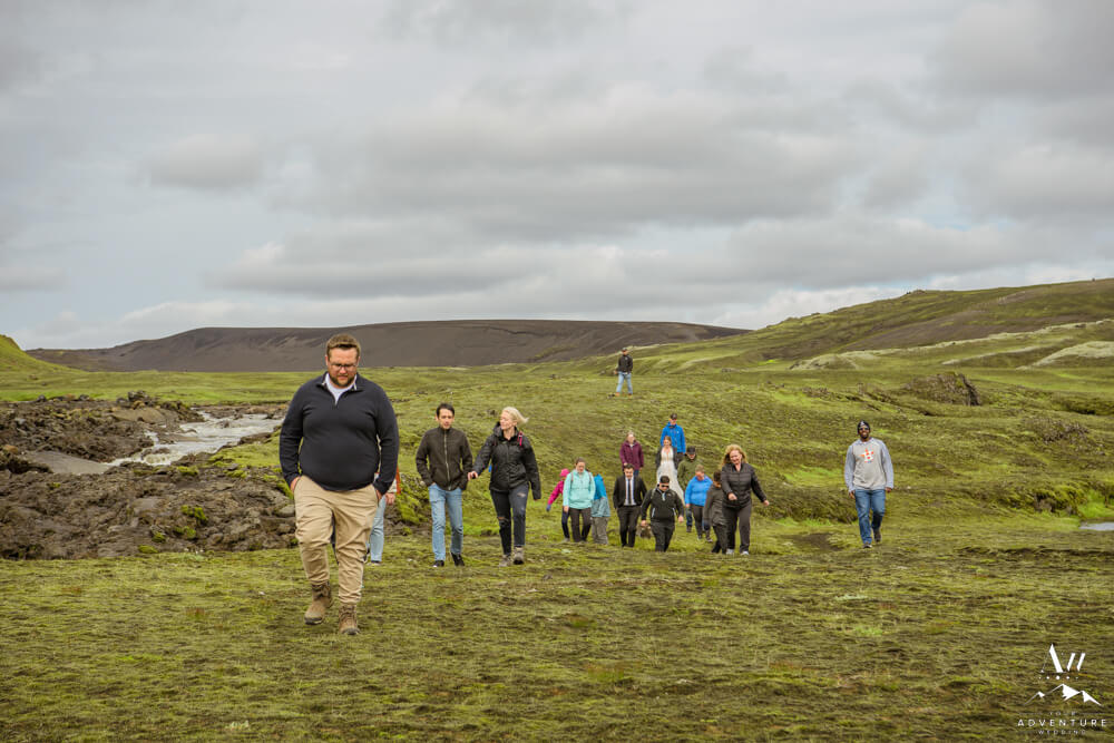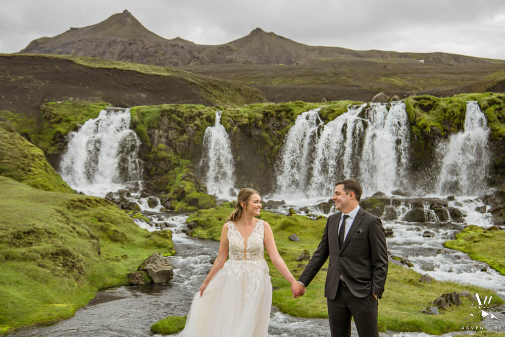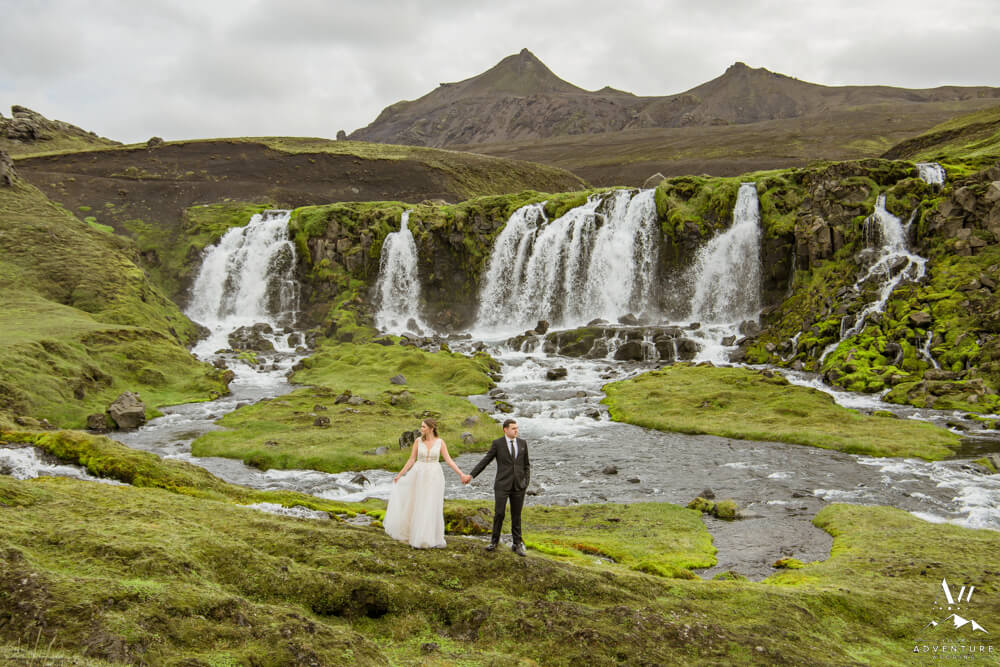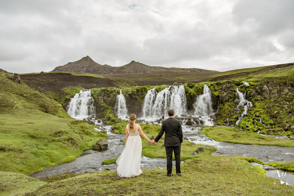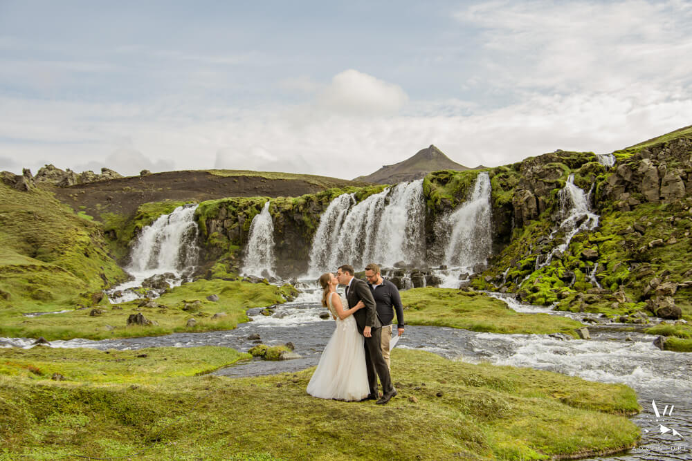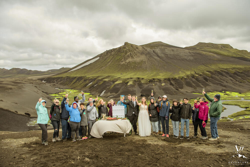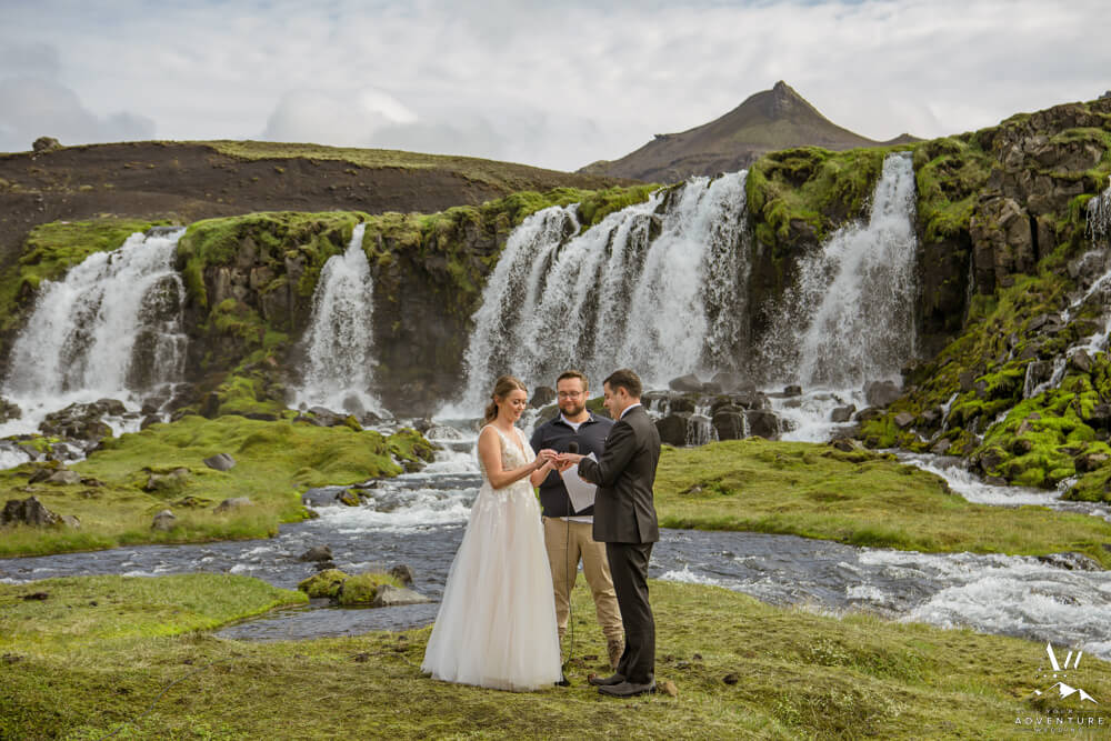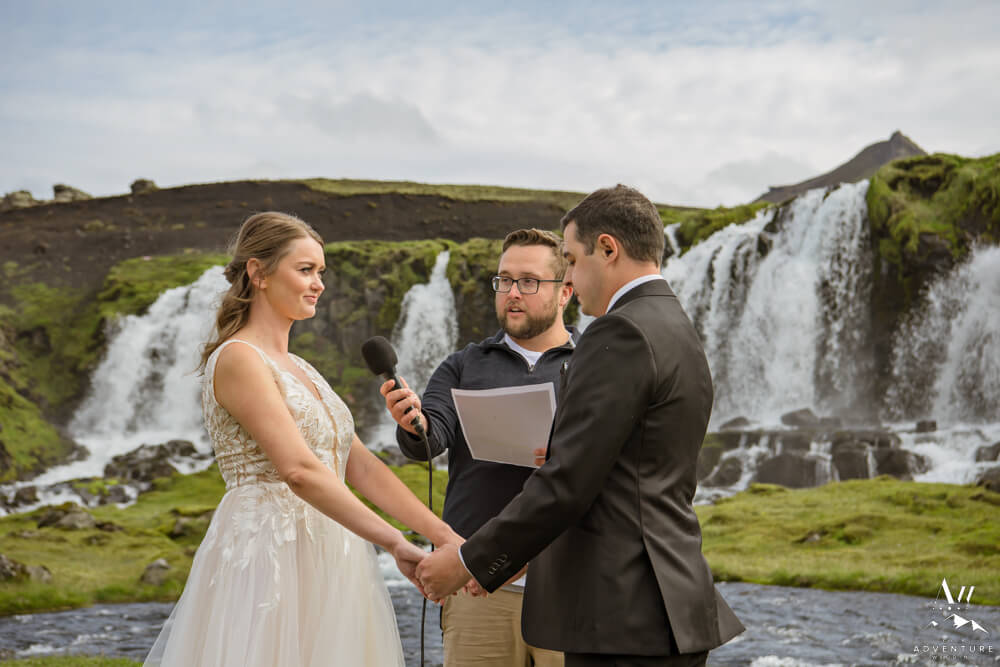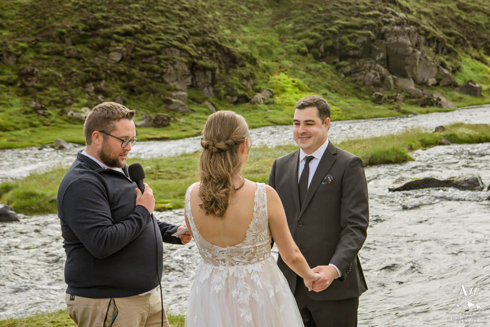 Upon arriving to the Iceland wedding ceremony location, everyone was astonished!  Never had anyone ever been to a remote waterfall that was just there for them.  No tourists, no ropes, no signs, no barriers.  Next, our Iceland Wedding Planner team got to work setting up chairs, sound system, and seating guests.  Cortney and Ben romantically walked down the aisle together.  One of their favorite people performed a symbolic ceremony.  Meanwhile, they exchanged candid personal vows, rings, and partied down the aisle way afterwards!