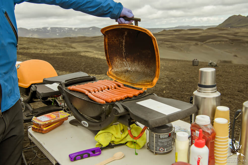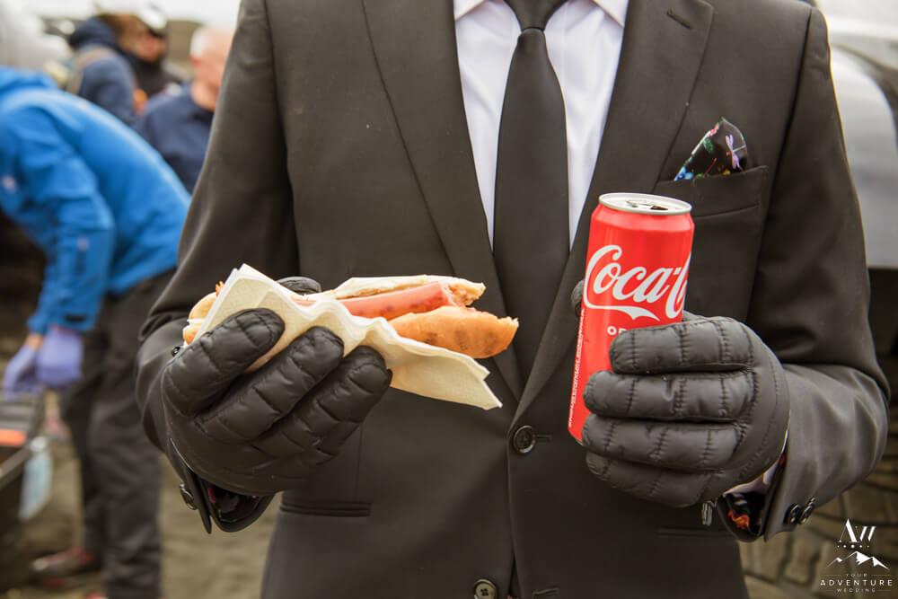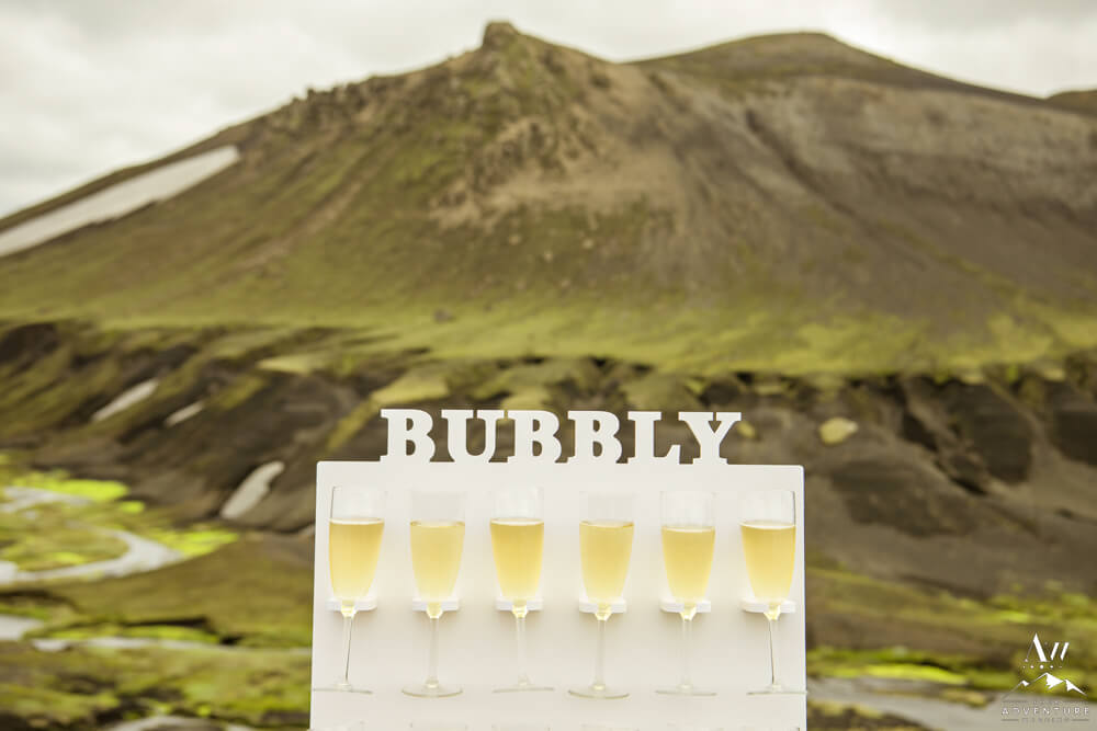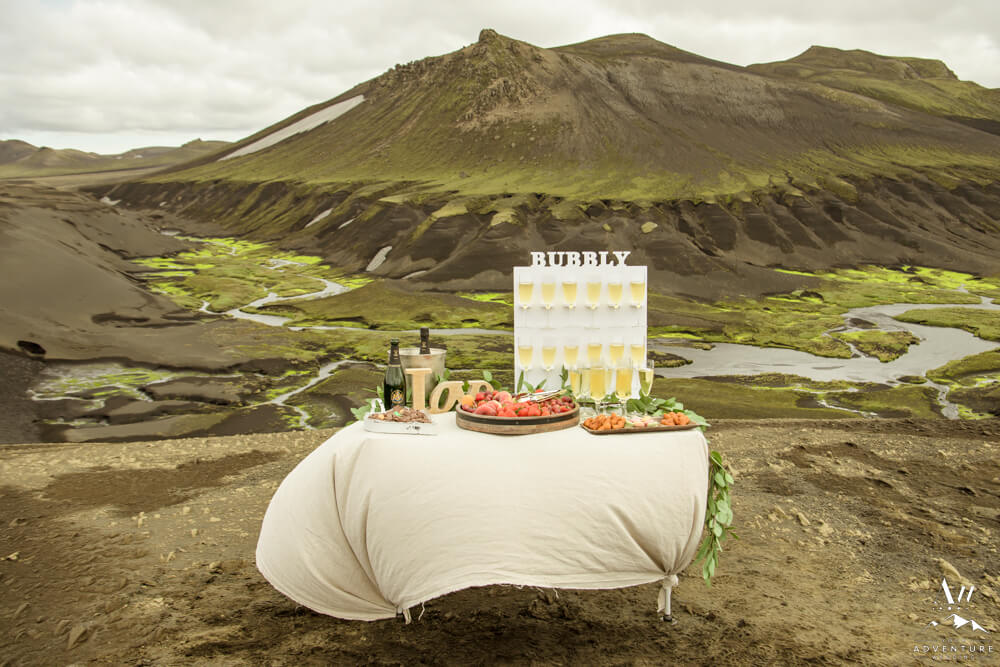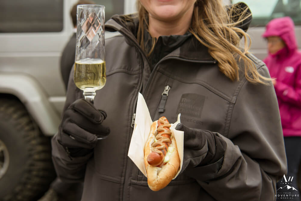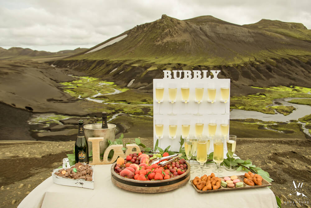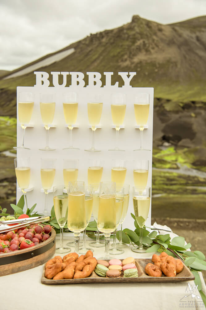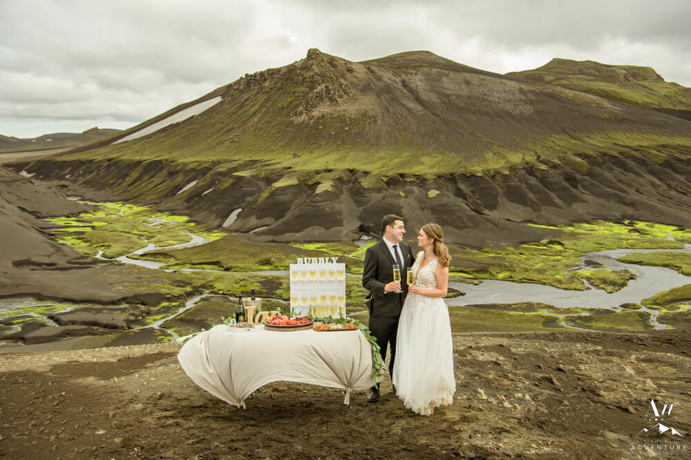 Holding an Iceland July wedding is the perfect excuse to have a champagne toast that turns to a lunch experience!  Firstly, the backdrop was visually inspiring.  After all where else can you find such vivid greens, crazy shaped mountains, and black sands?!  Secondly, if you know anything about champagne, Barons de Rothschild Brut is a delicious treat!  Thirdly, sipping it alongside trying Icelandic chocolate, fruit, and kleina with this view is simply unforgettable.  Fair to say their guests thought so too!  After, a traditional hot dog highland BBQ and exploration of the area with our Iceland wedding photographer followed.