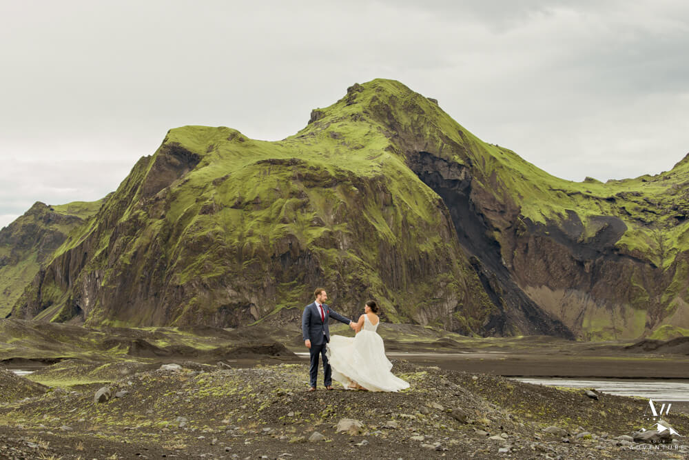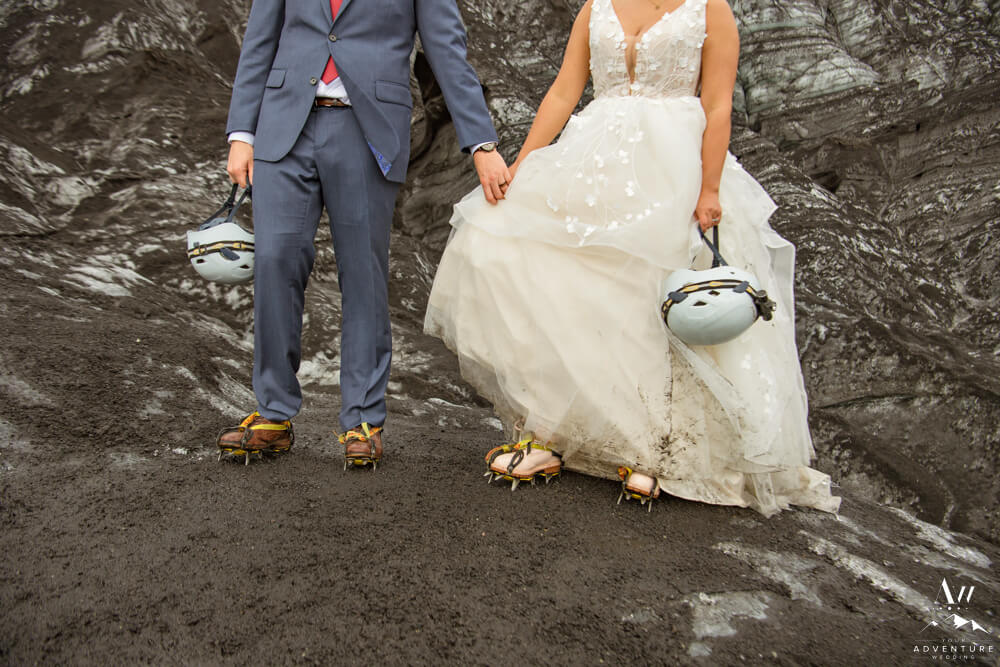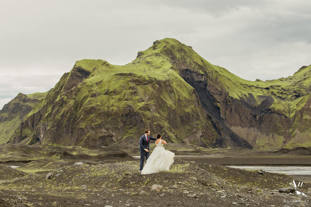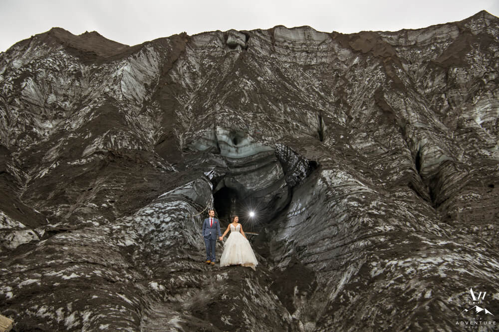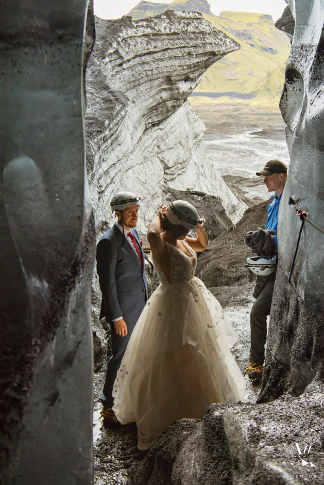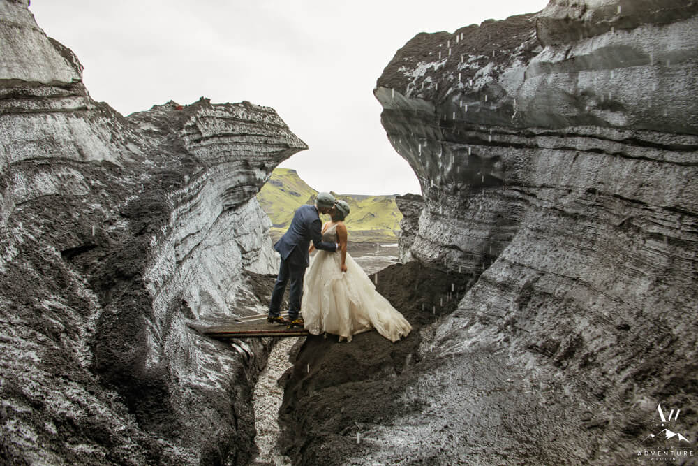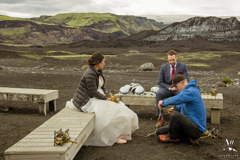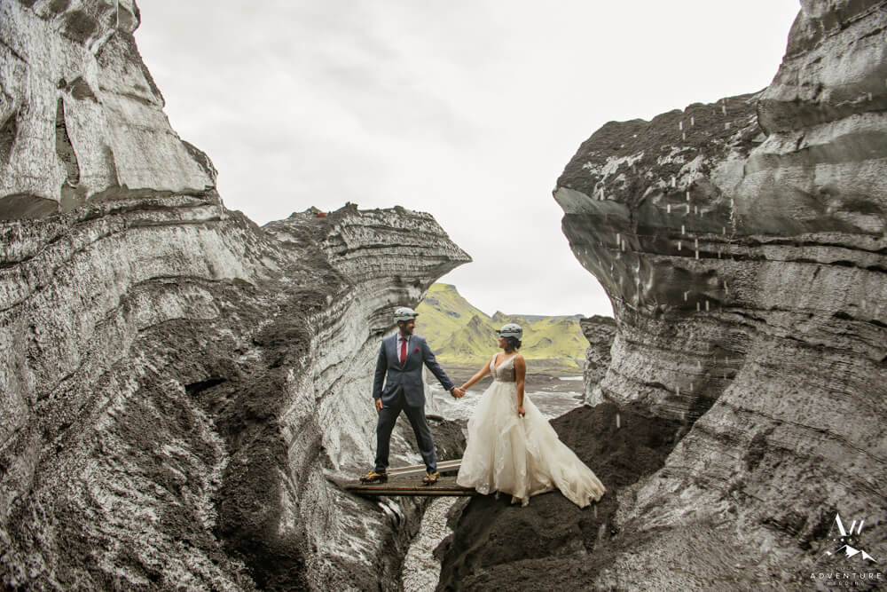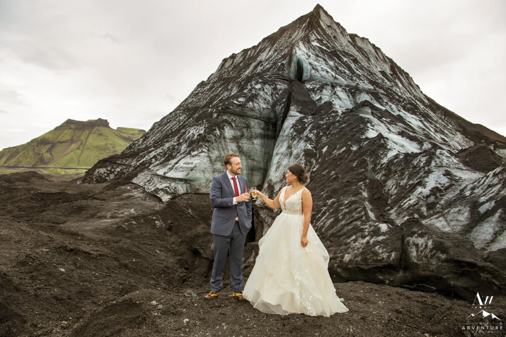 Later, back up into another area of the highlands the newlyweds go! This time to discover an offbeat glacier outlet. To illustrate, the area is chockful of crazy shaped green mountains, black sands, and interesting icy walls! Therefore it was time to strap on some crampons, drink champagne, and experience the place during their thrilling day of adventure & vows!