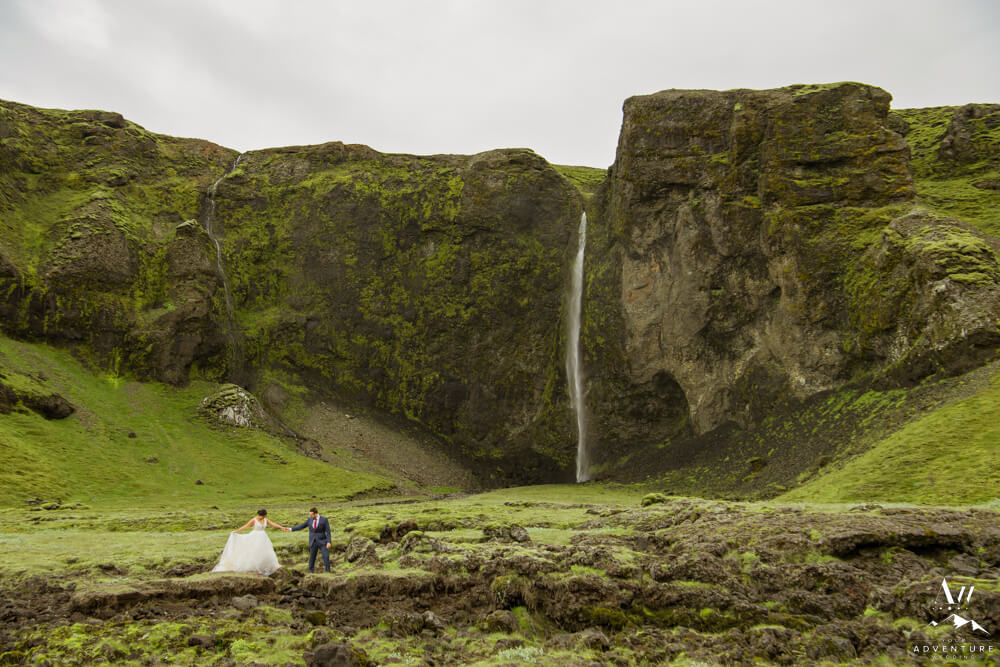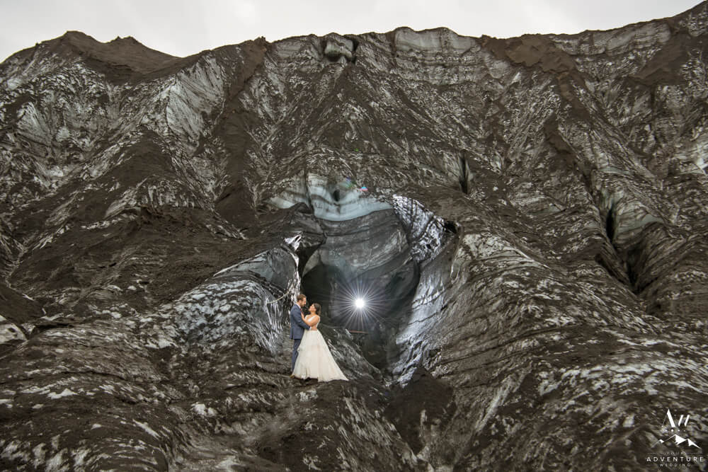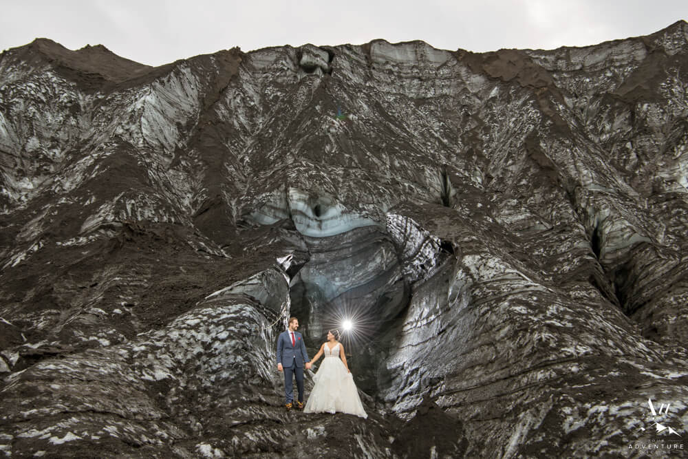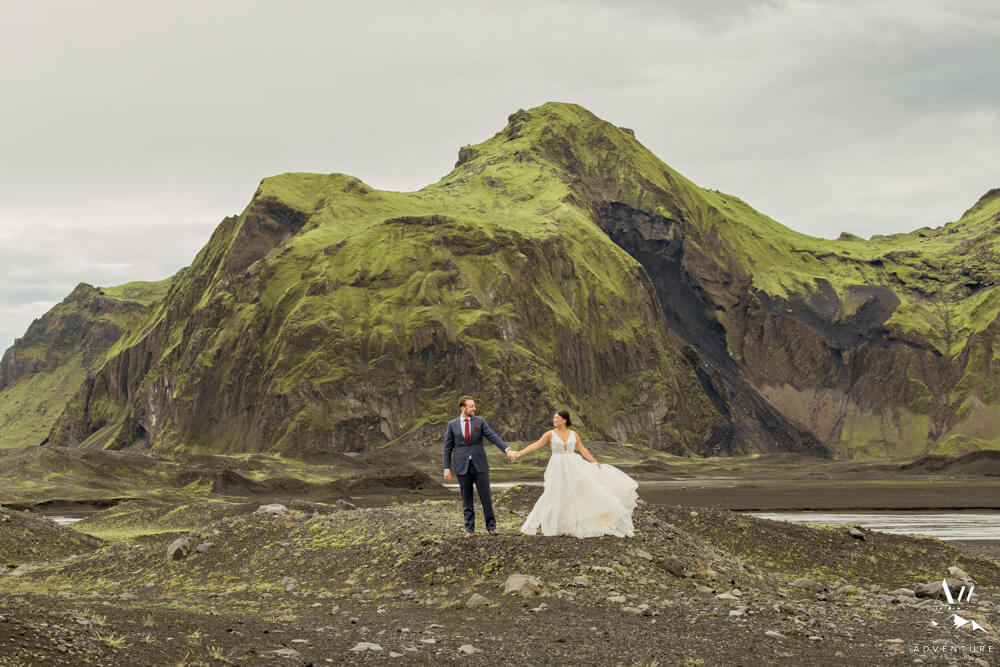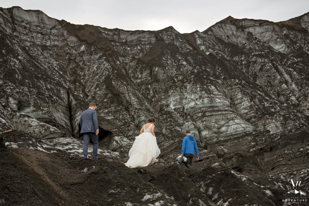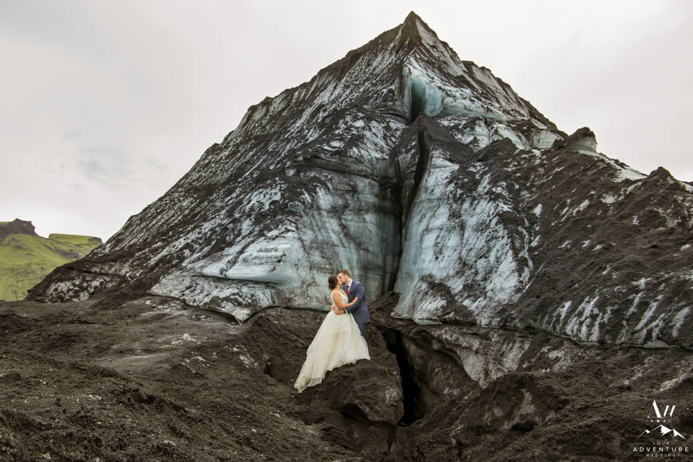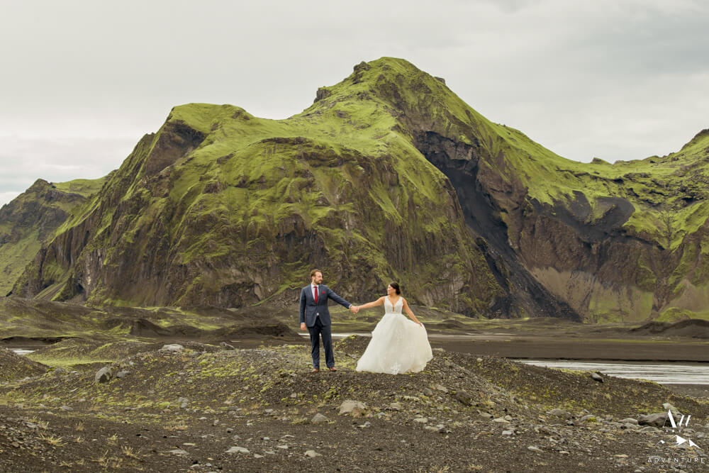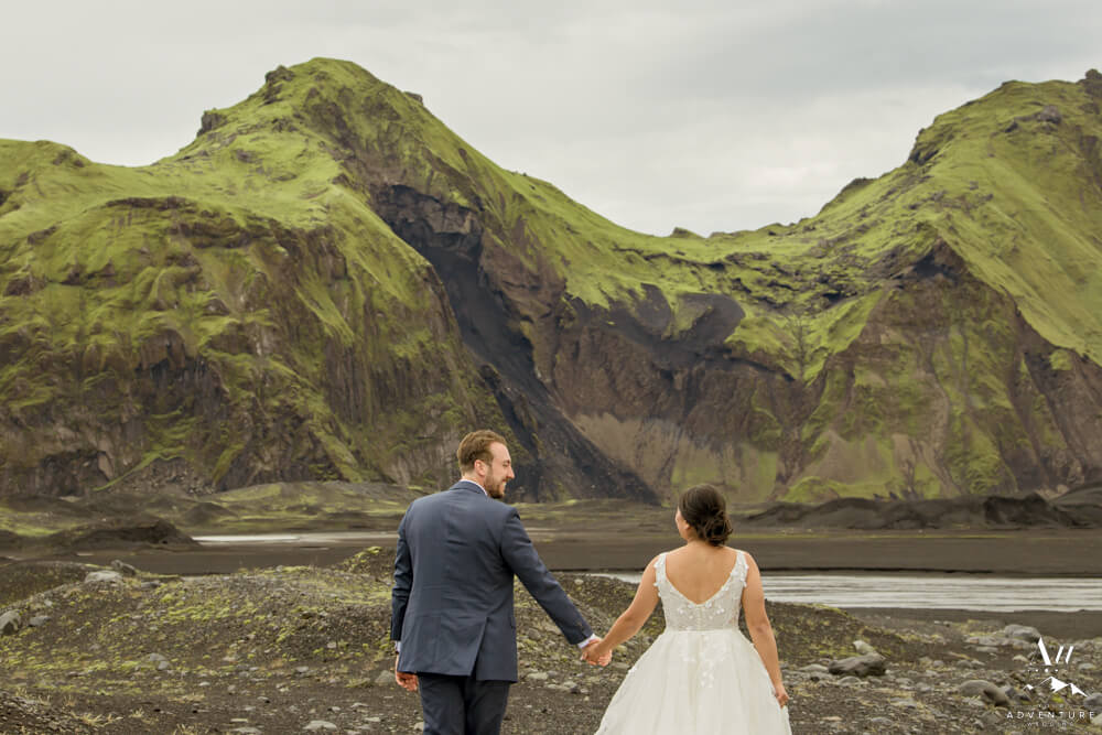 Later, back up into another area of the highlands the newlyweds go! This time to discover an offbeat glacier outlet. To illustrate, the area is chockful of crazy shaped green mountains, black sands, and interesting icy walls! Therefore it was time to strap on some crampons, drink champagne, and experience the place during their thrilling day of adventure & vows!