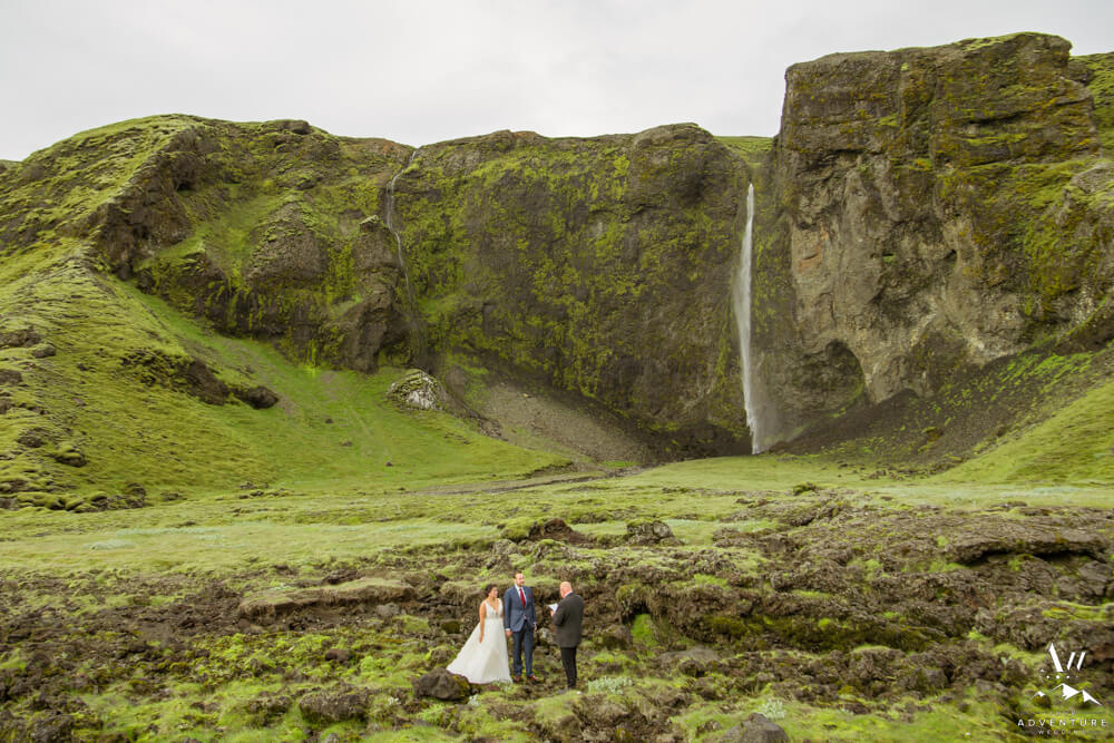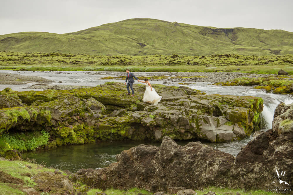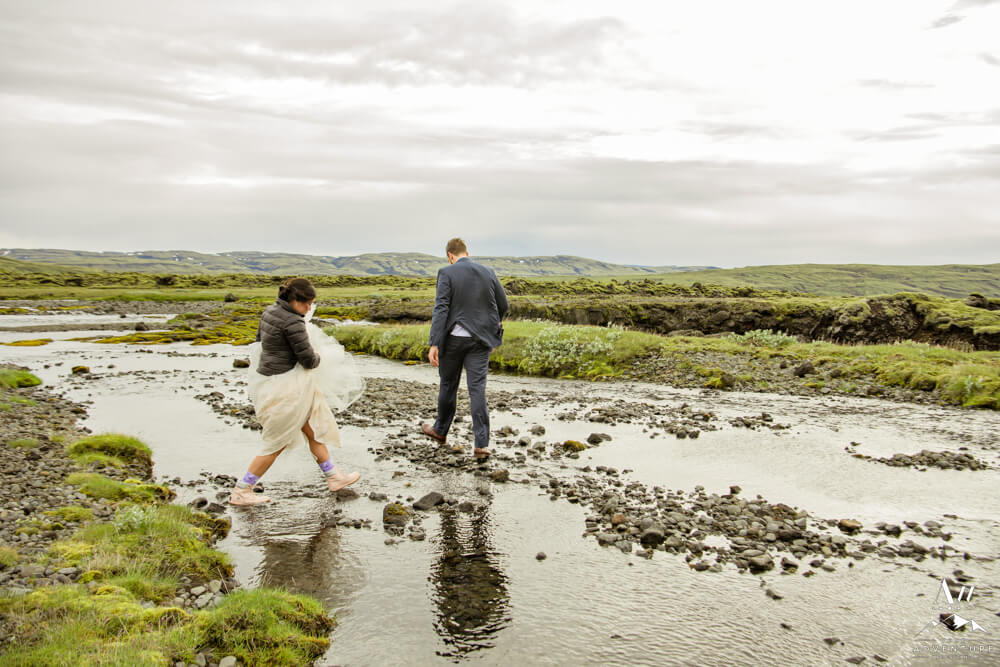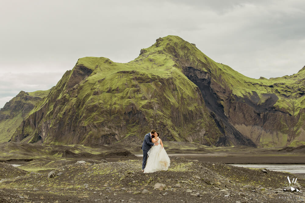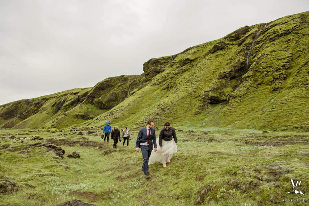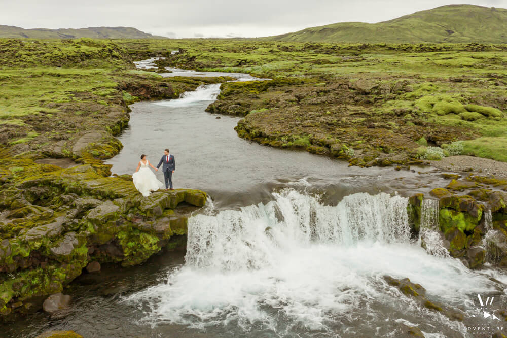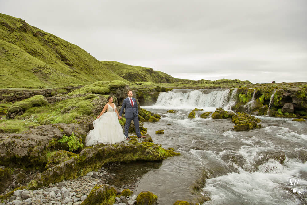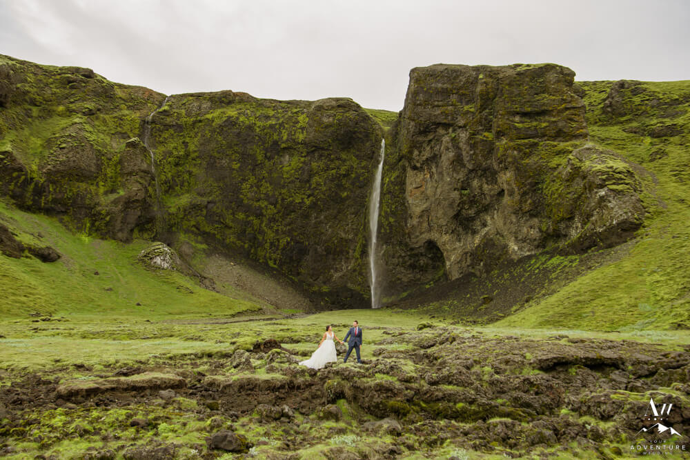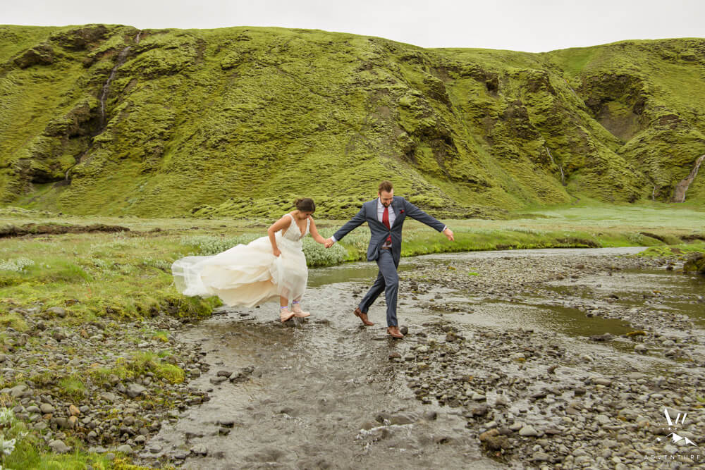Later, back up into another area of the highlands the newlyweds go! This time to discover an offbeat glacier outlet. To illustrate, the area is chockful of crazy shaped green mountains, black sands, and interesting icy walls! Therefore it was time to strap on some crampons, drink champagne, and experience the place during their thrilling day of adventure & vows!