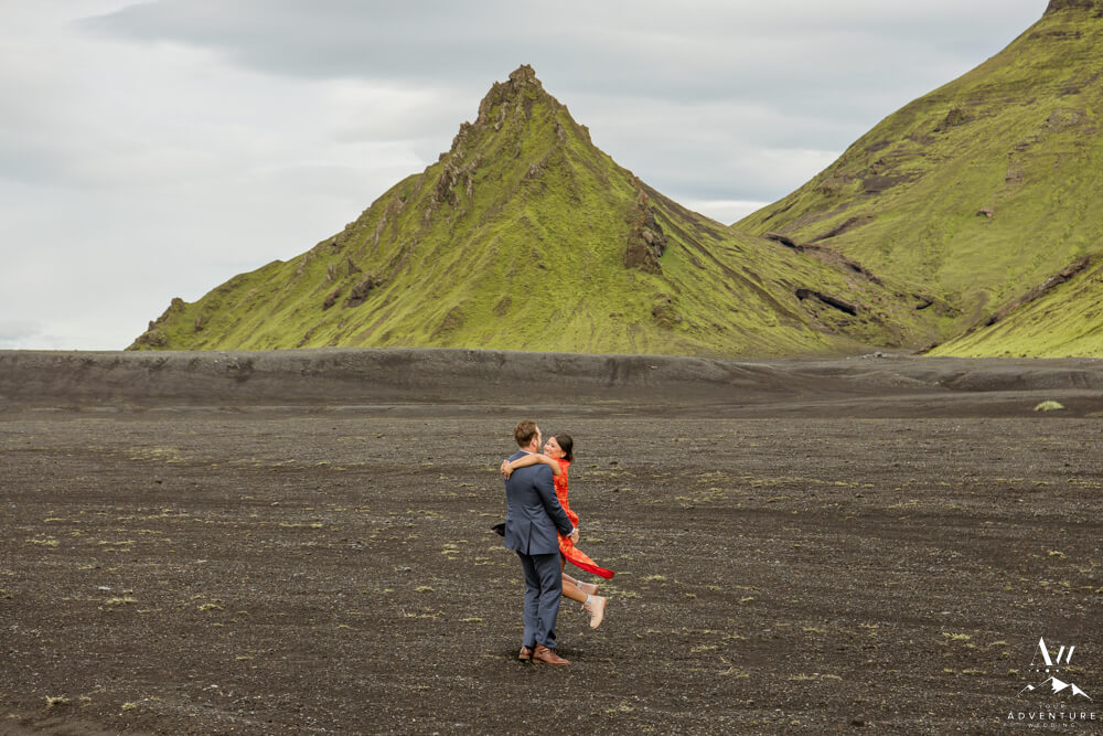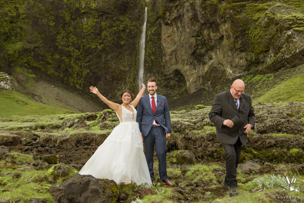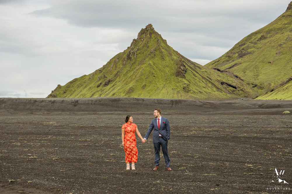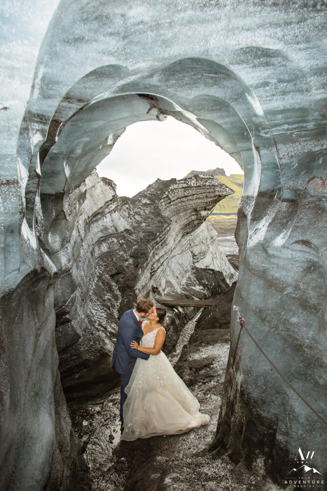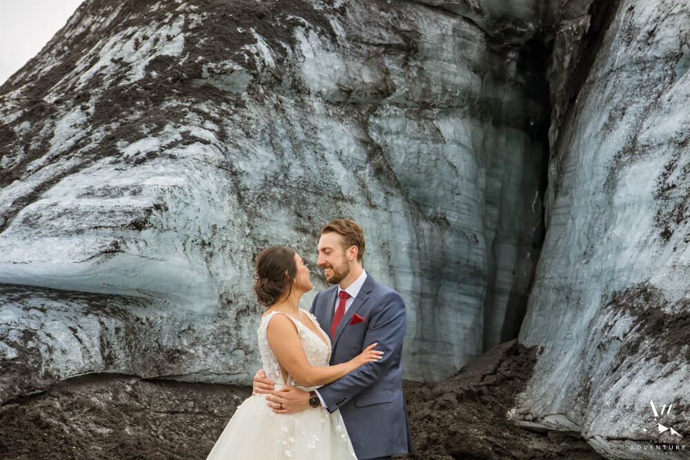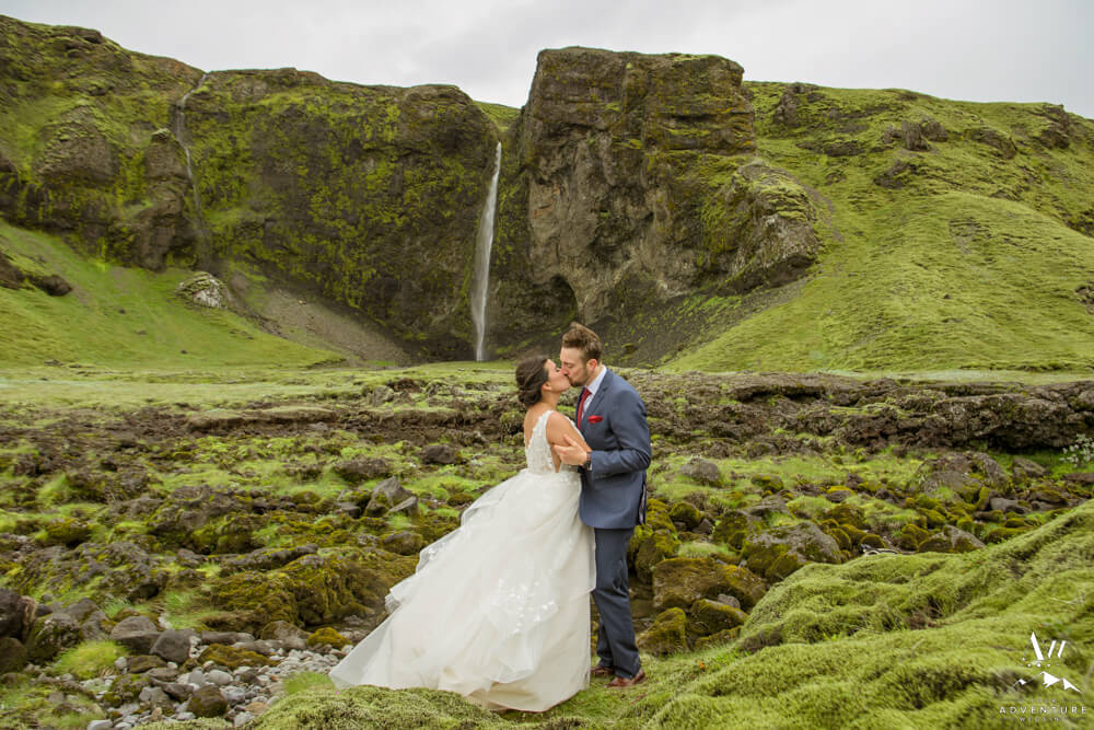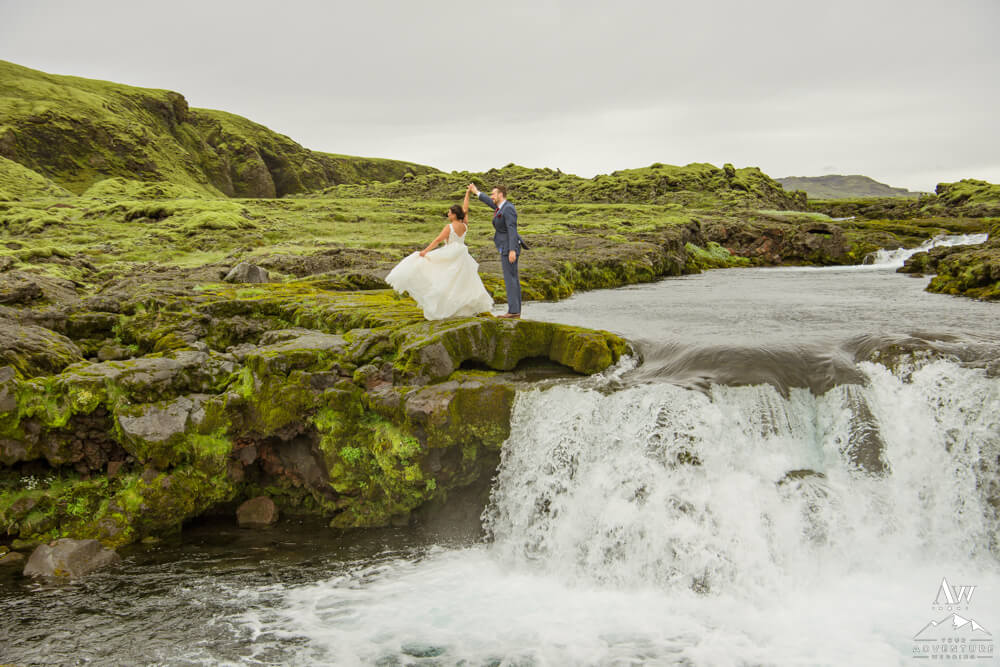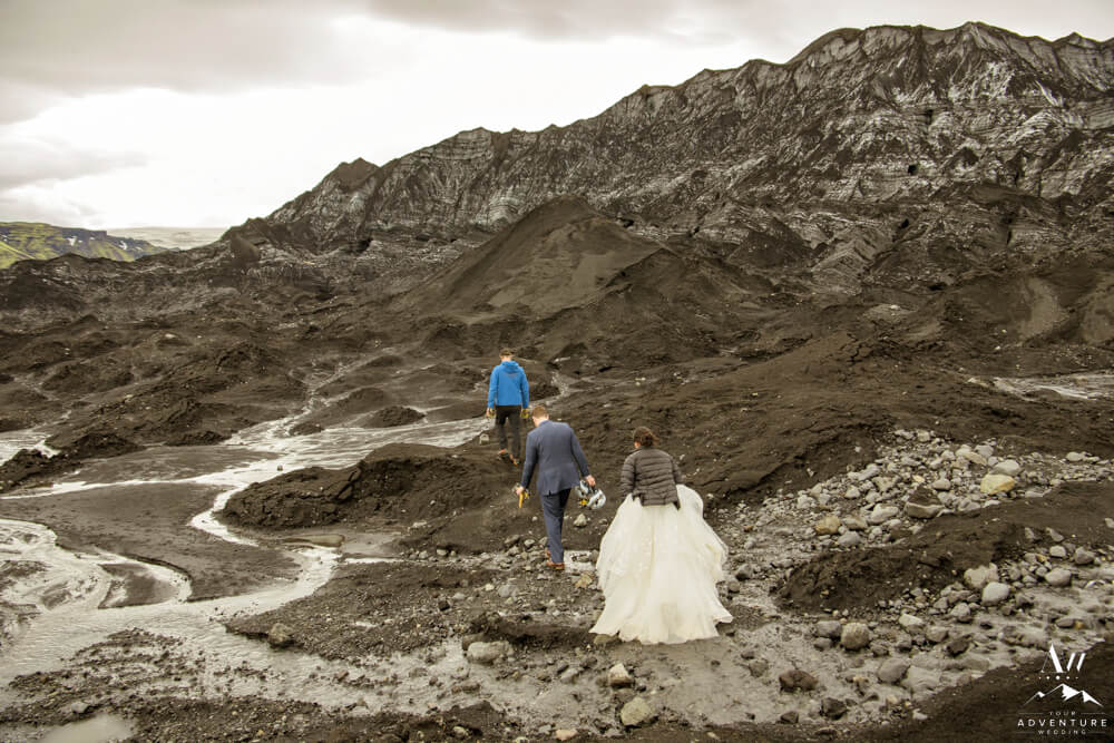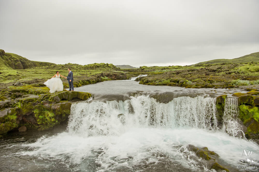 Later, back up into another area of the highlands the newlyweds go! This time to discover an offbeat glacier outlet. To illustrate, the area is chockful of crazy shaped green mountains, black sands, and interesting icy walls! Therefore it was time to strap on some crampons, drink champagne, and experience the place during their thrilling day of adventure & vows!