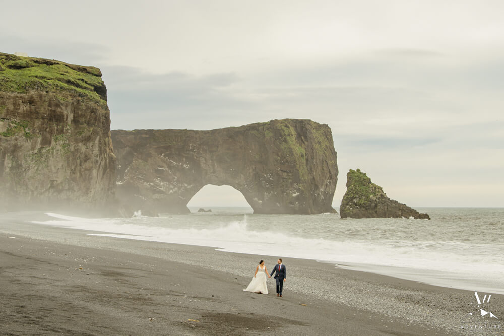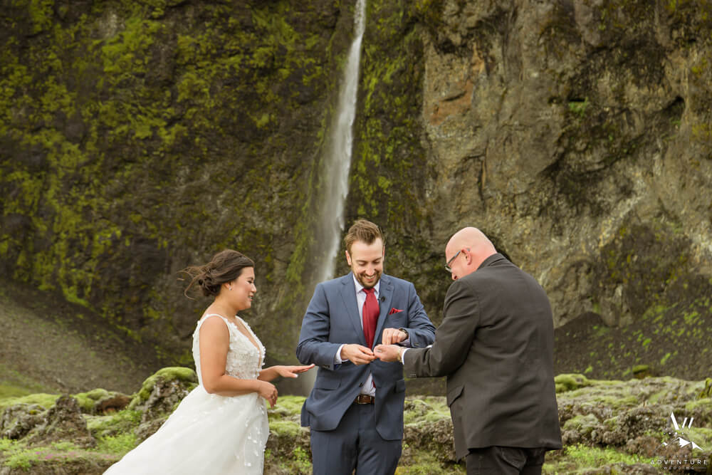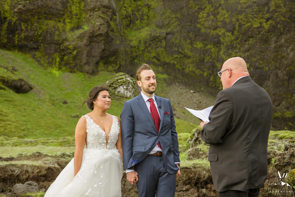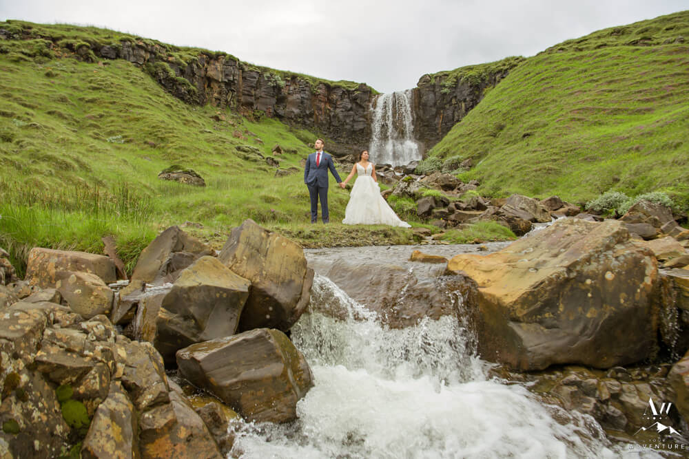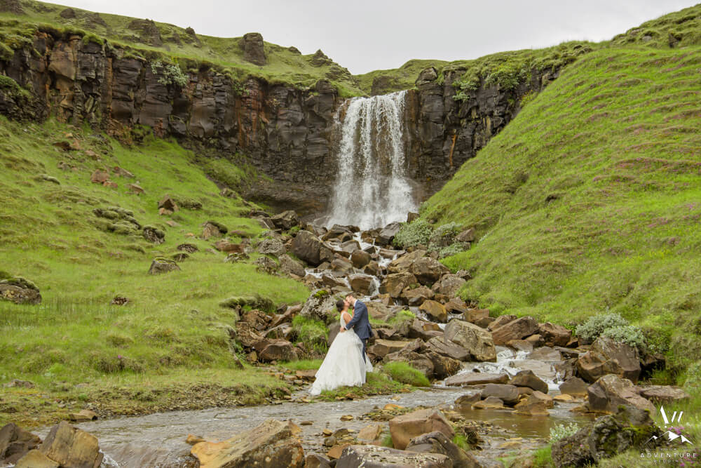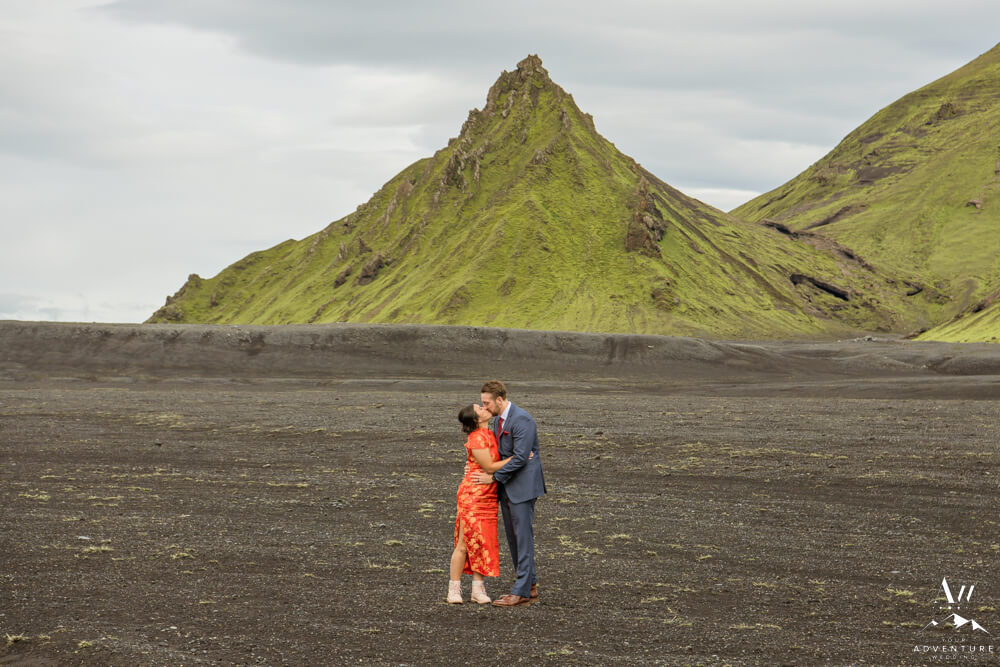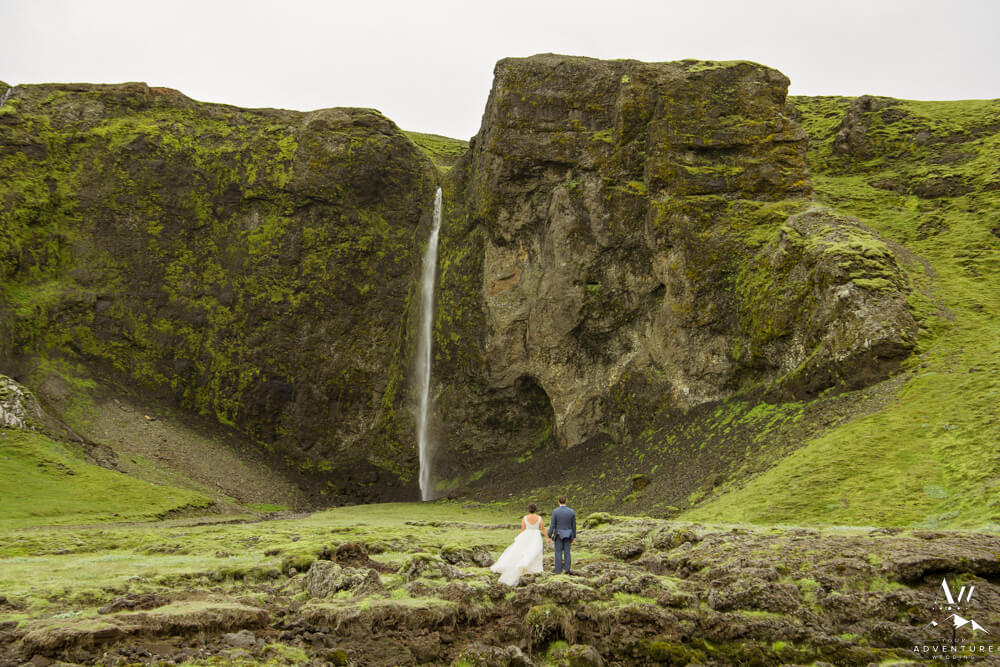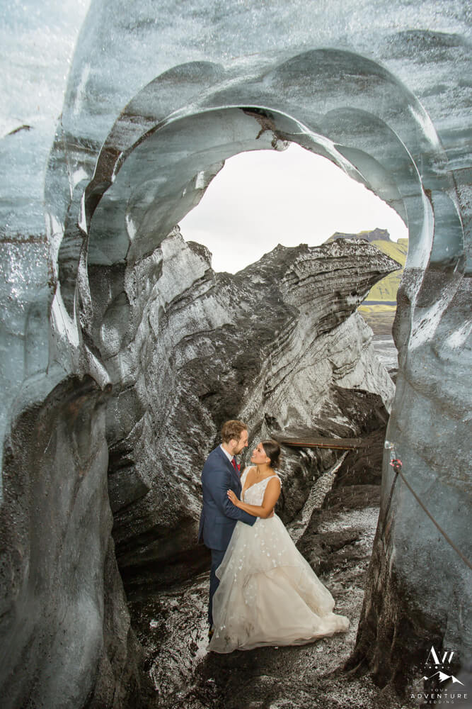 Later, back up into another area of the highlands the newlyweds go! This time to discover an offbeat glacier outlet. To illustrate, the area is chockful of crazy shaped green mountains, black sands, and interesting icy walls! Therefore it was time to strap on some crampons, drink champagne, and experience the place during their thrilling day of adventure & vows!