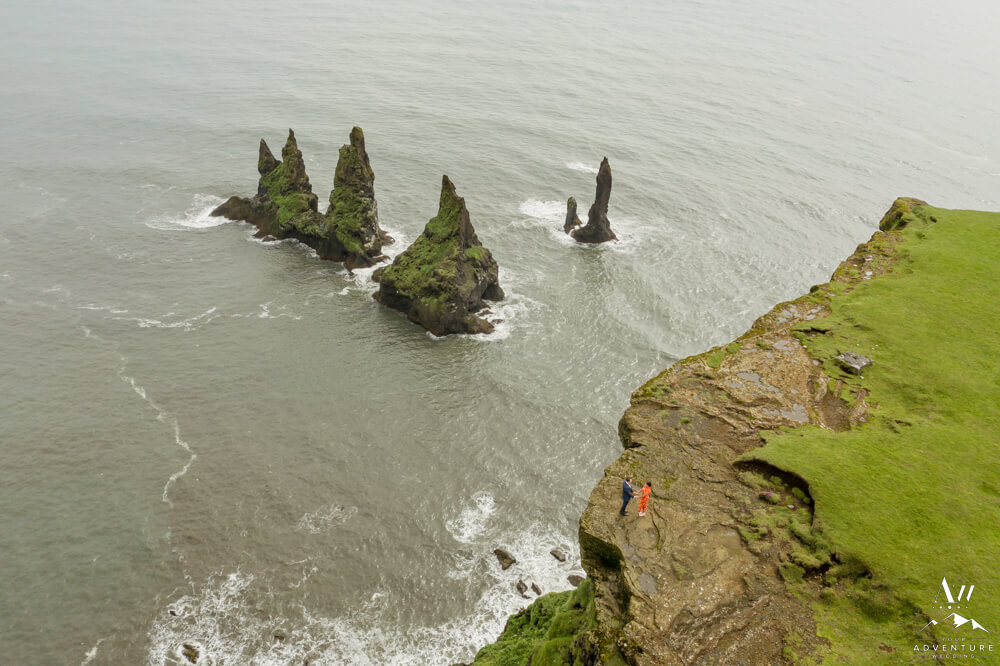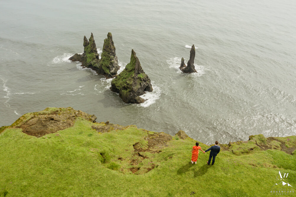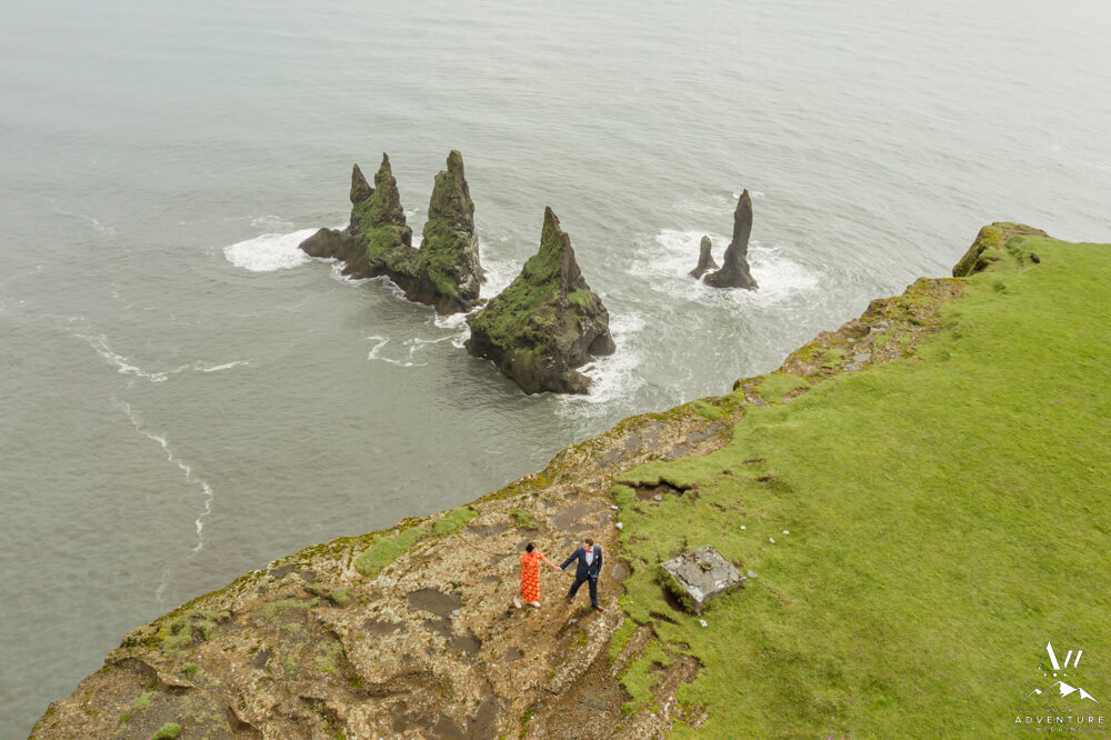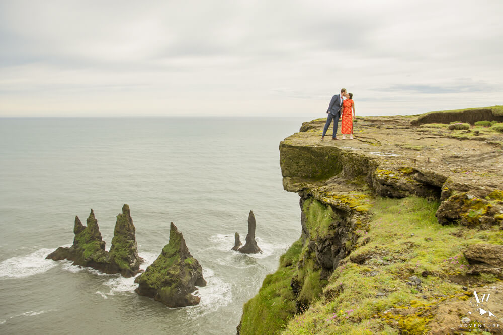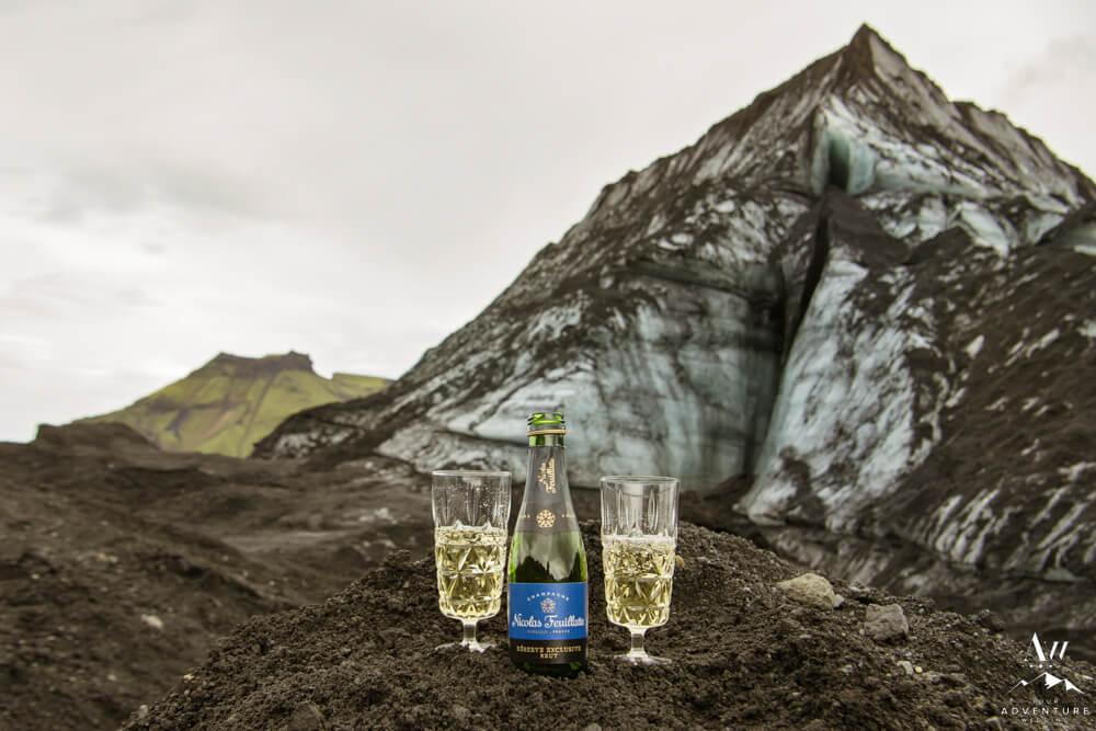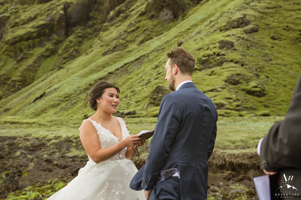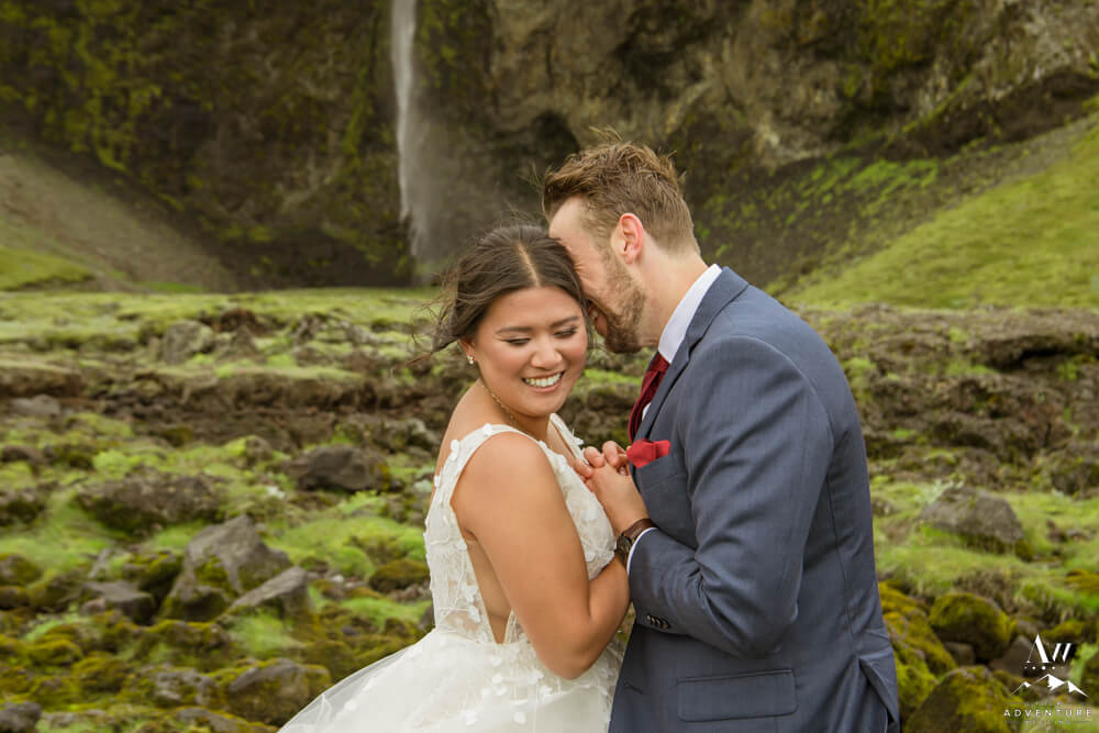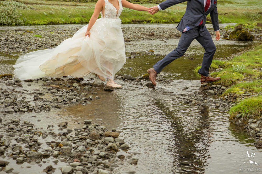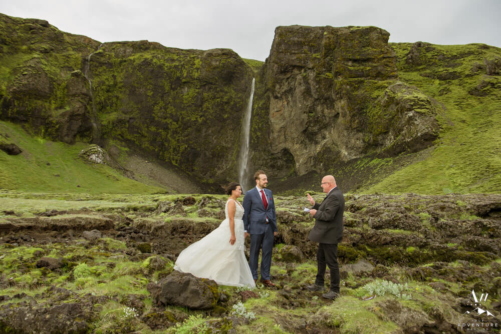 Later, back up into another area of the highlands the newlyweds go! This time to discover an offbeat glacier outlet. To illustrate, the area is chockful of crazy shaped green mountains, black sands, and interesting icy walls! Therefore it was time to strap on some crampons, drink champagne, and experience the place during their thrilling day of adventure & vows!