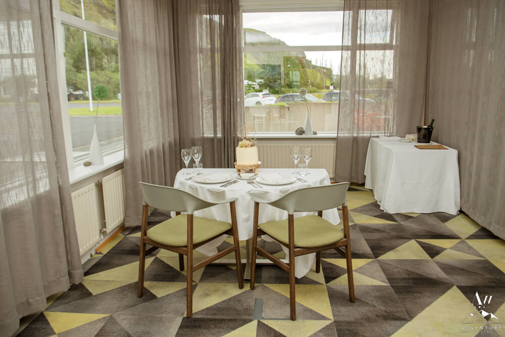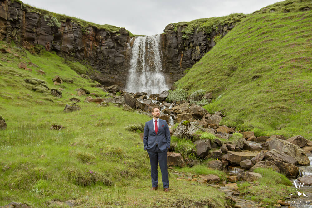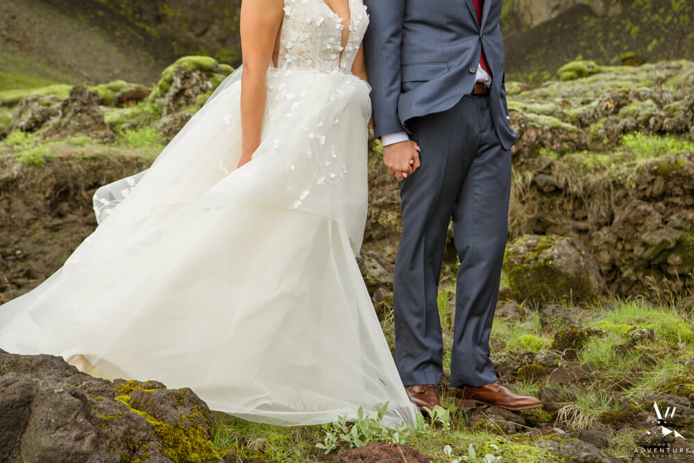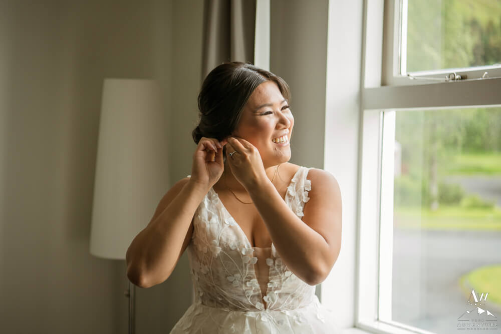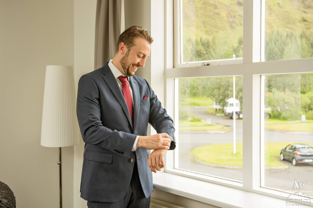 The weather in July is considered summertime. But don’t let that fool you as conditions can always vary! To illustrate, we have had hail happen at the glacier in July! But don’t fret, this couple just had overcast skies and some wind nothing too terribly extreme. Further, the soon to be newlyweds got ready together in the suite at Hotel Klaustur.