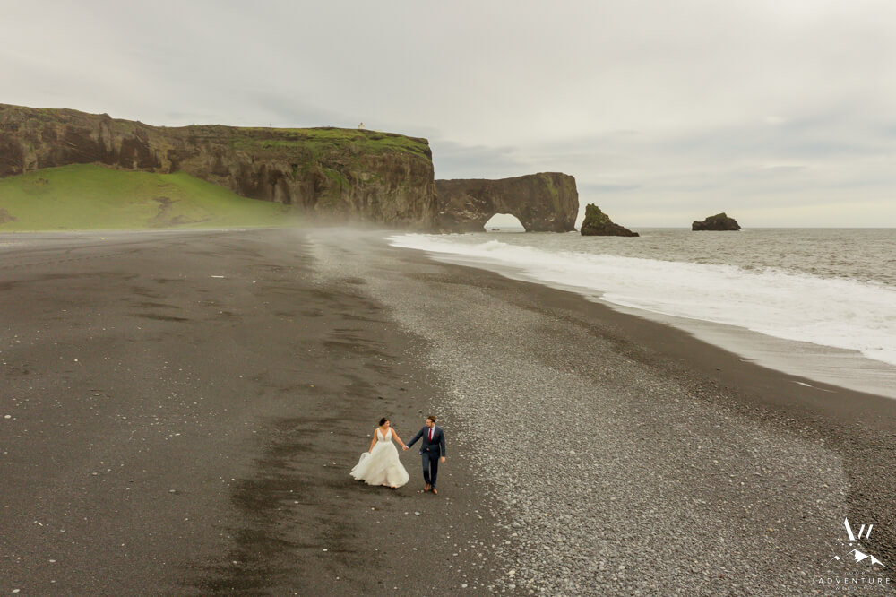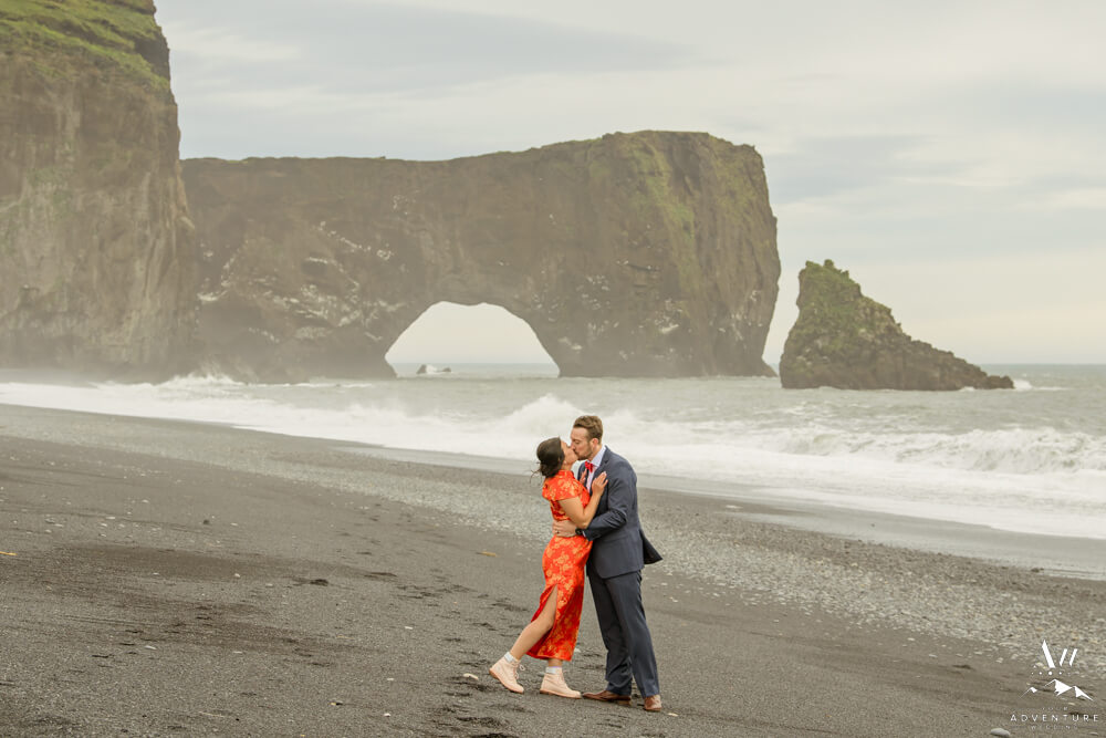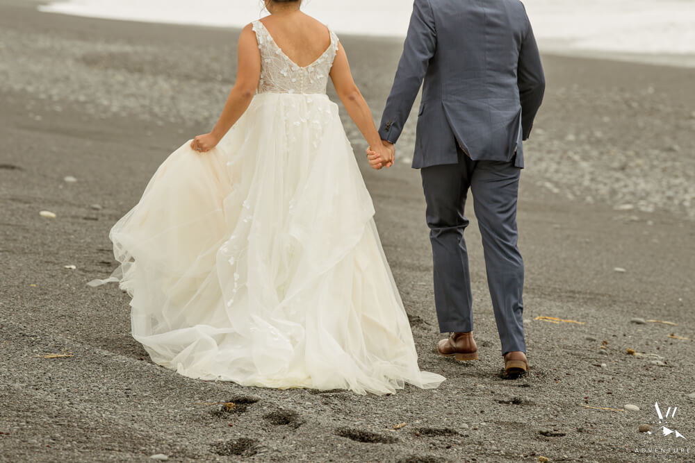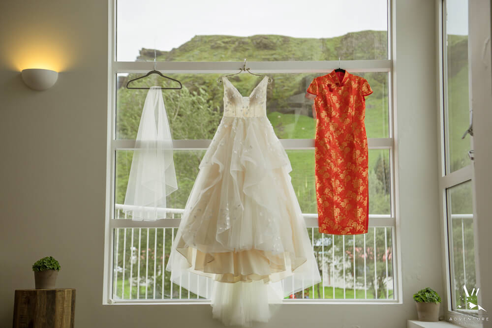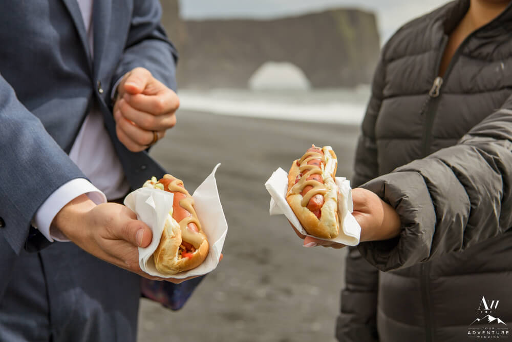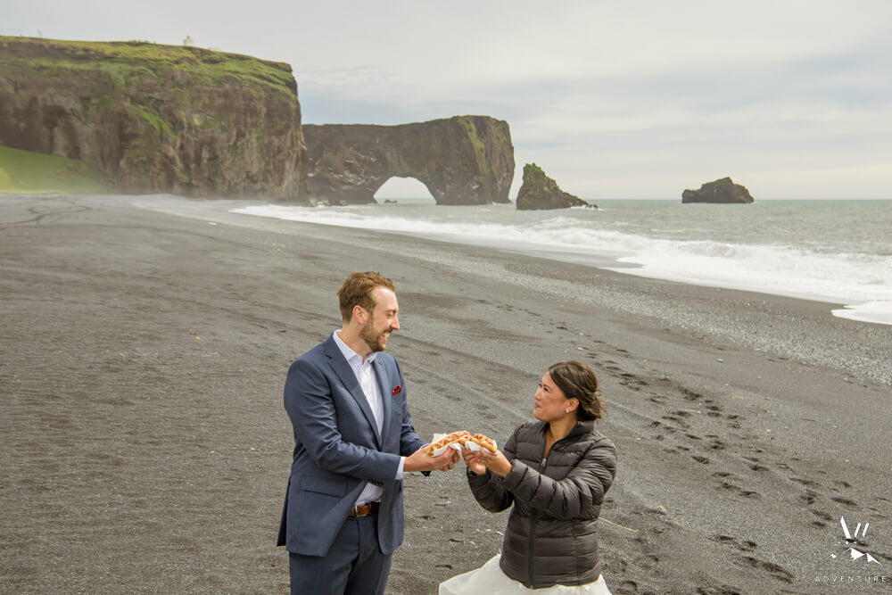Next on their adventure & vows agenda, is a beachside lunch! On the menu was a yummy traditional Icelandic hot dog BBQ with all the fixings. Meanwhile as the hot dogs were cooking Darcy and Allison spent some time discovering the private property beach with the best view of the famed Dyrhólaey sea arch! Also following lunch Allison changed into a traditional Chinese wedding dress to honor her family heritage.