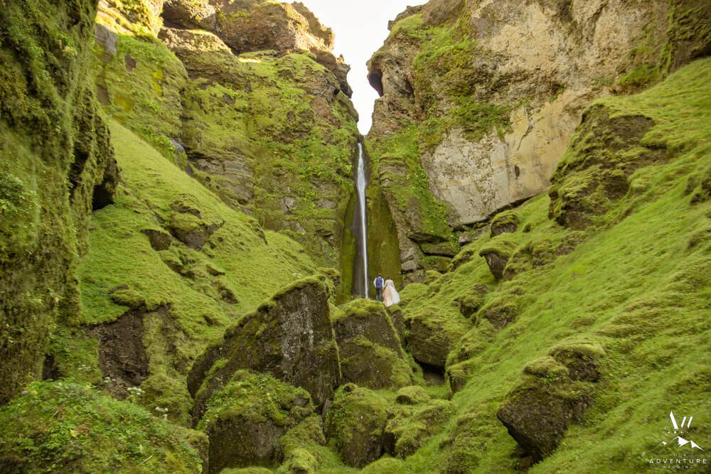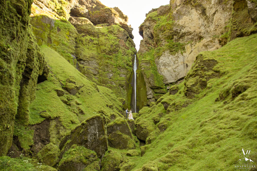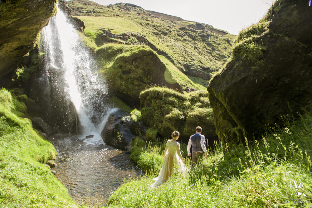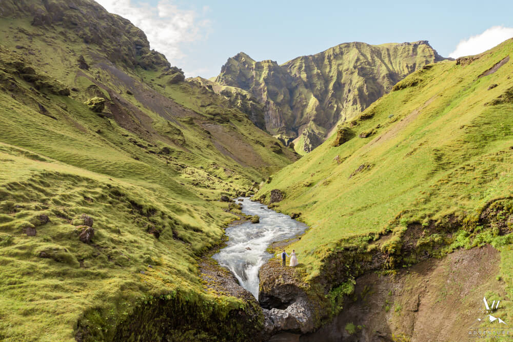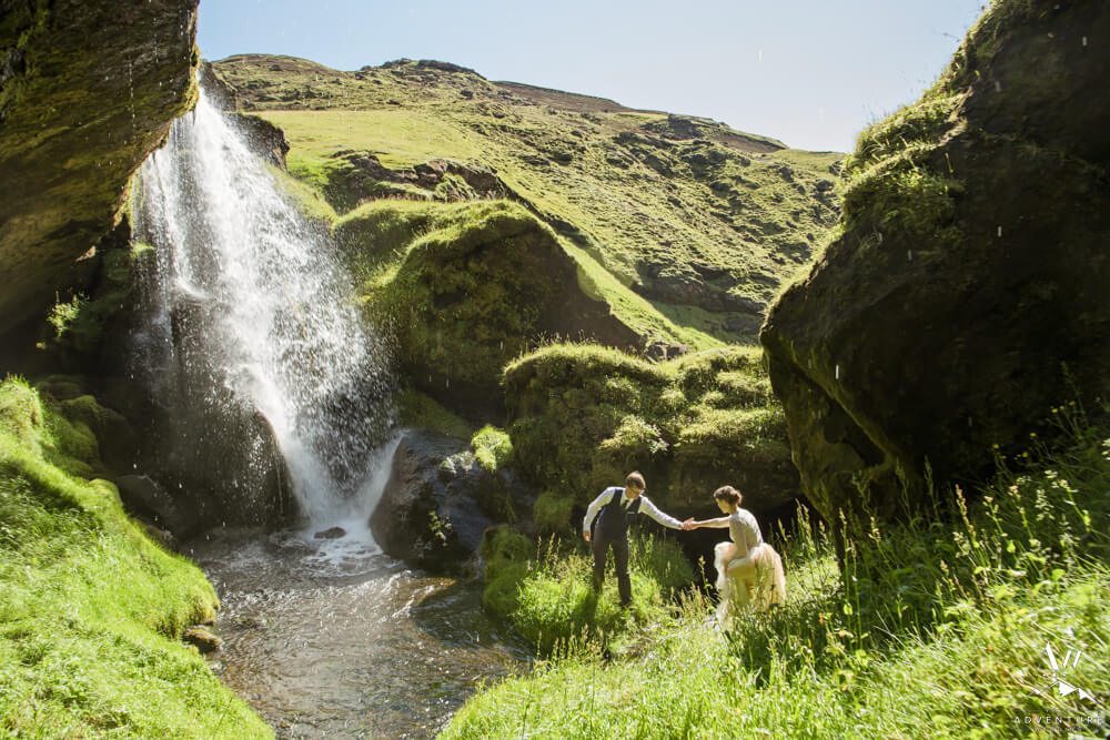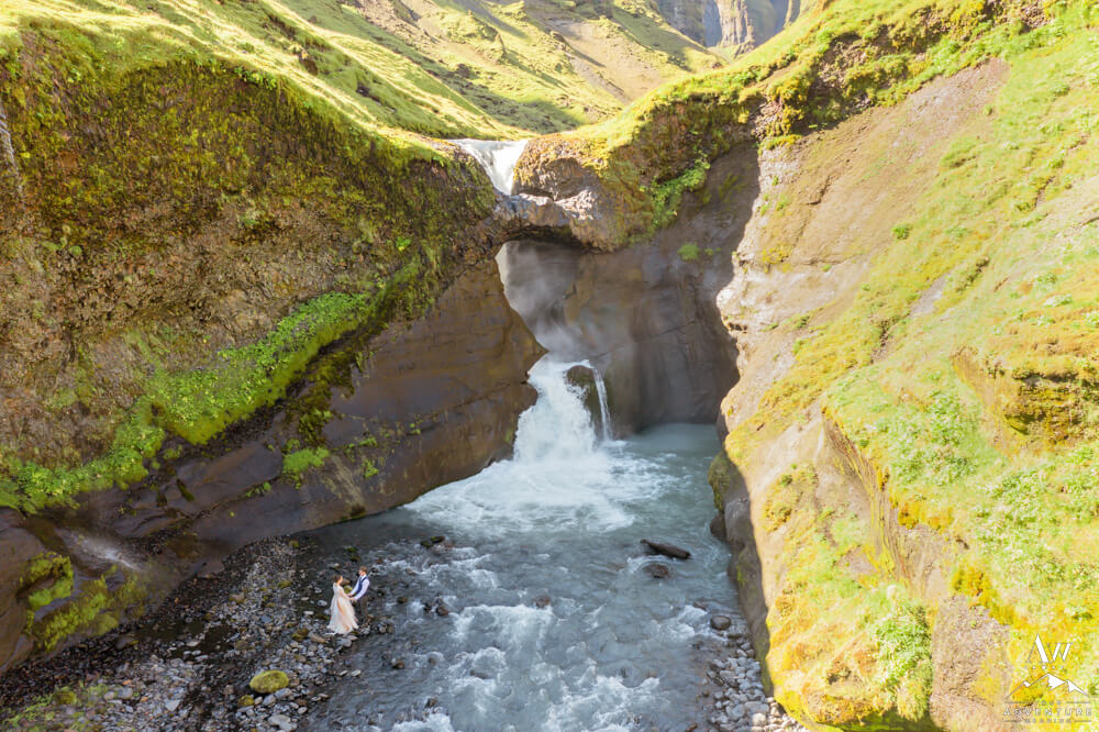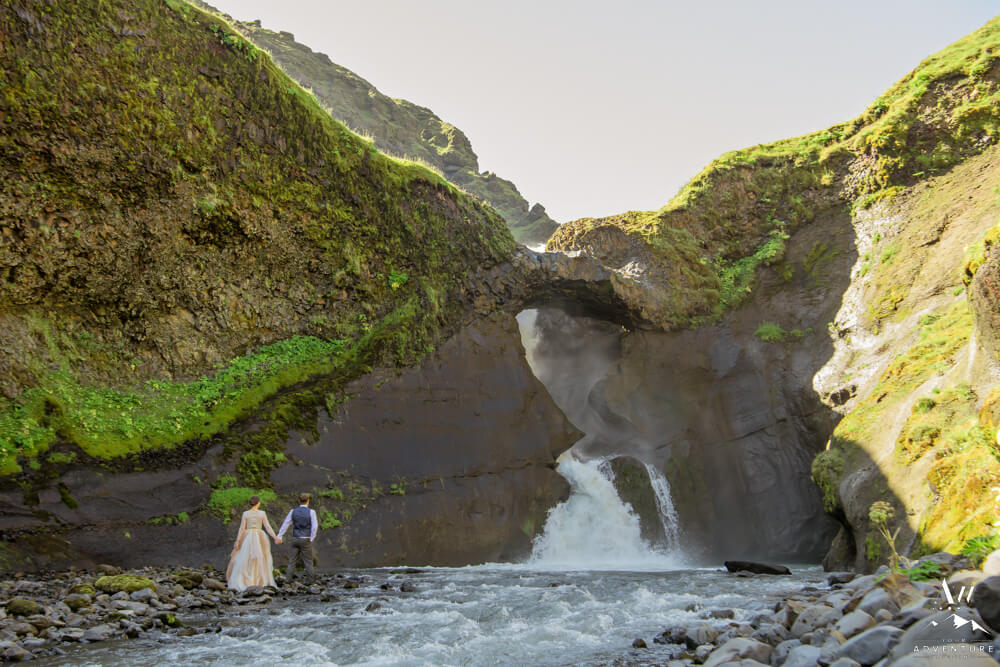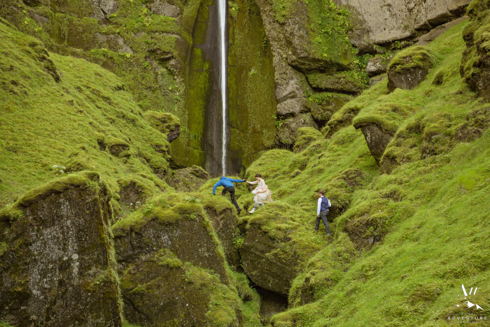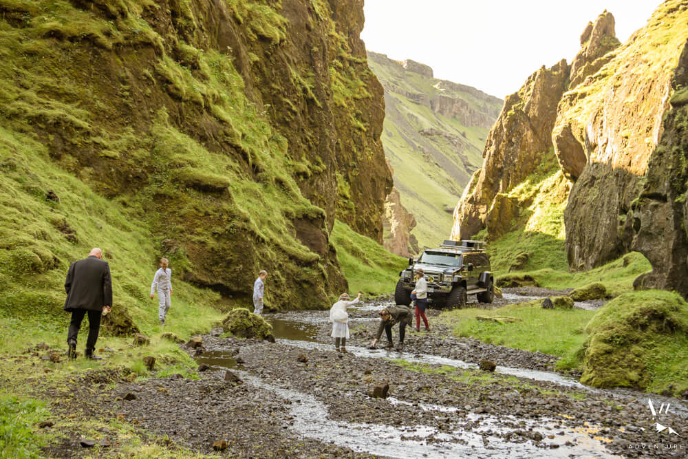 After dropping off the kids with our Iceland Wedding Planner babysitter, Sarah and Will begin a more intense hiking wedding adventure. The kind of hiking that is sketchy but oh-so worth it! First, example, they travelled to a remote canyon area that is home to a waterfall you can walk behind. Second, after several river crossings via super jeep and by foot they were hiking on a “sheep road.” Third, they powered through the steep and crazy parts to be greeted with a stunning season. Fourth, they explored this fragile waterfall and savored every single second!
