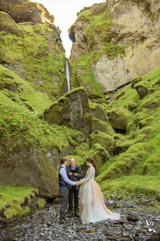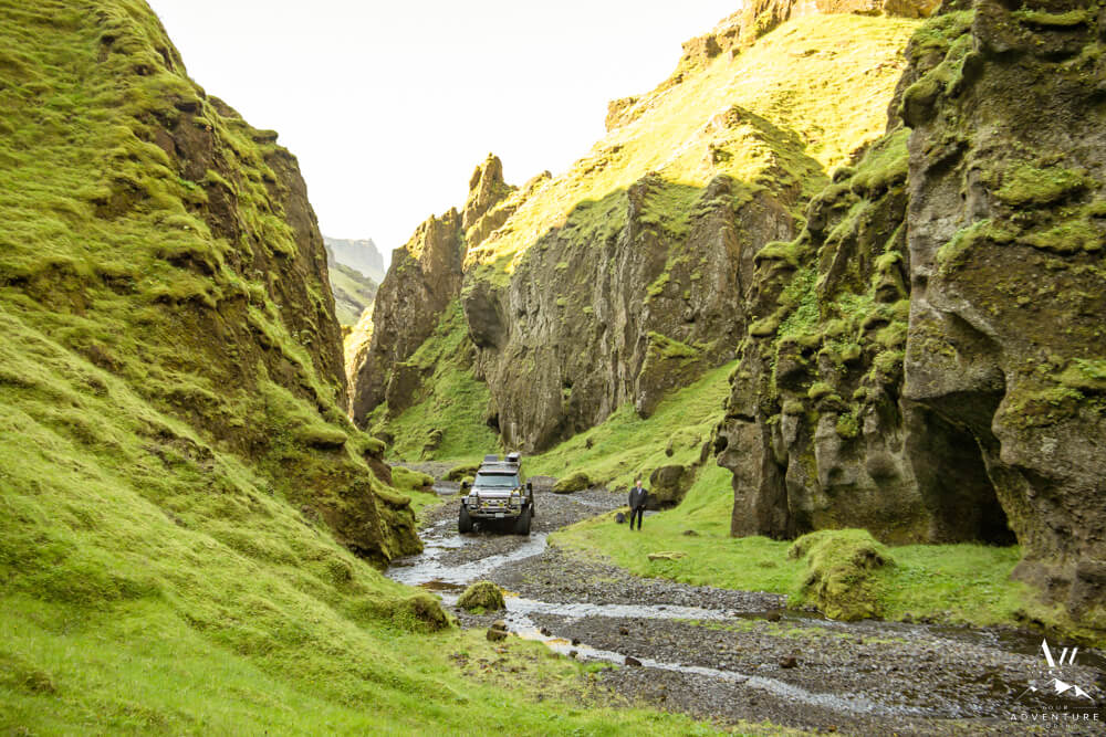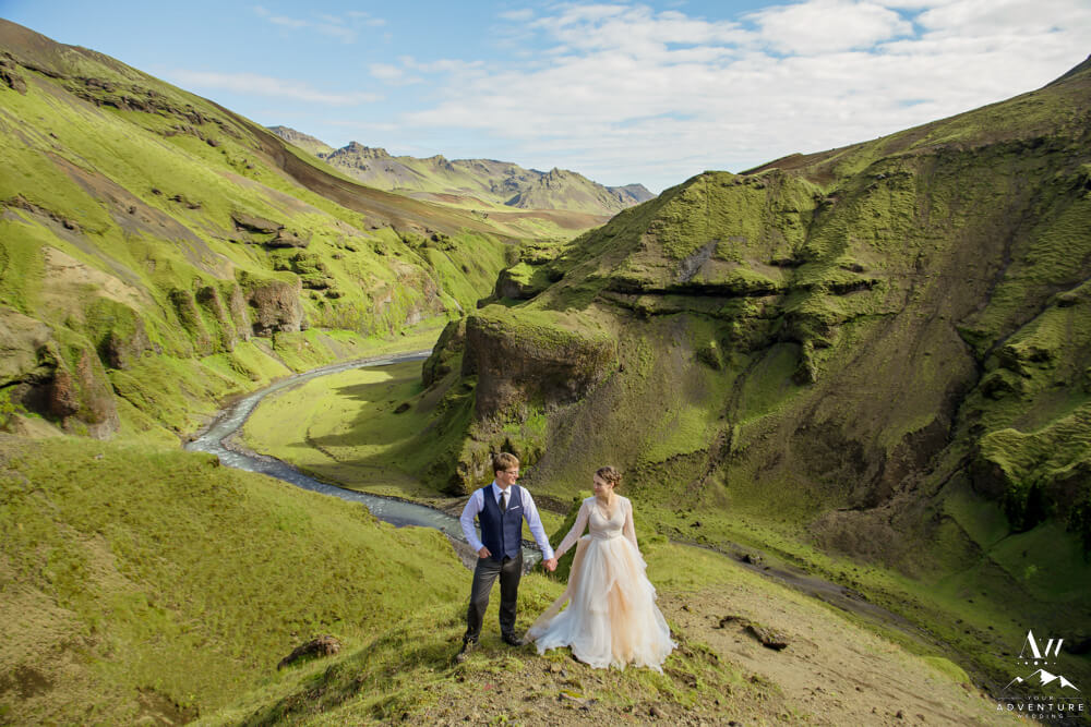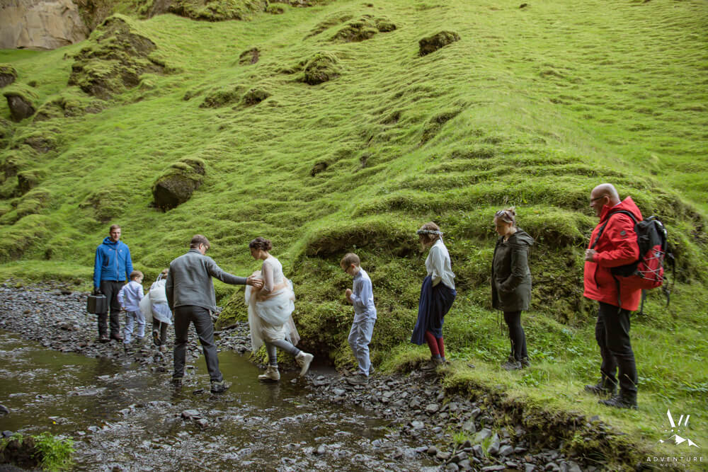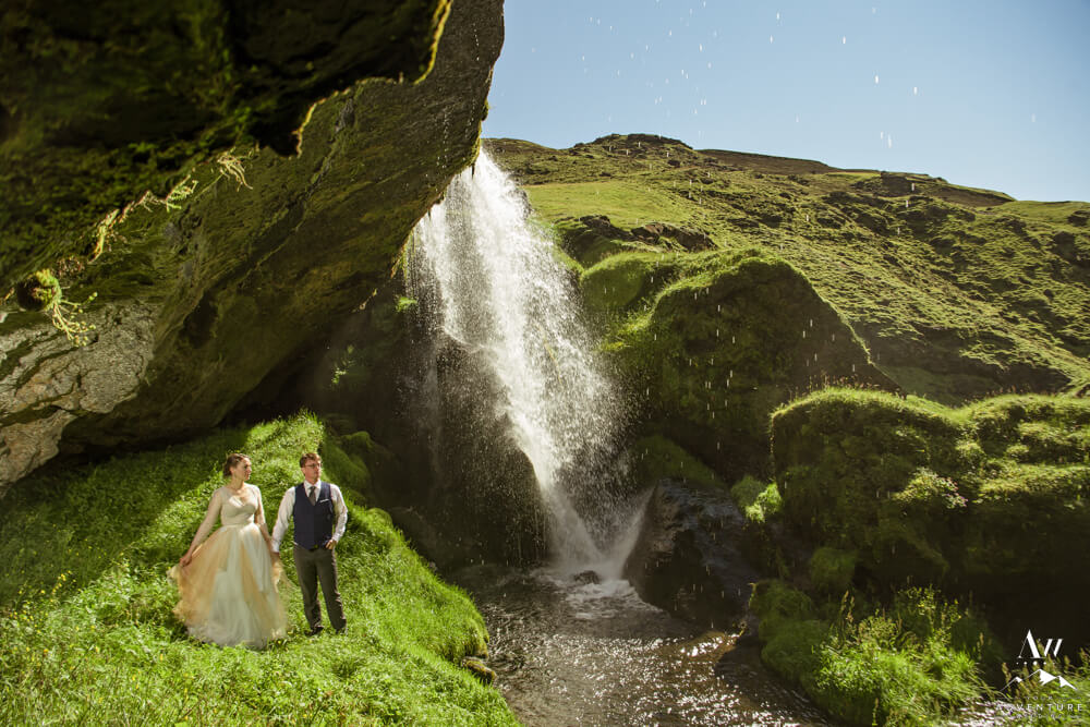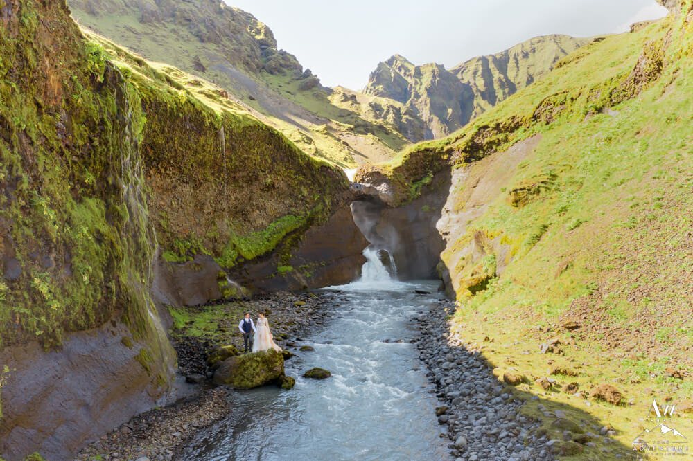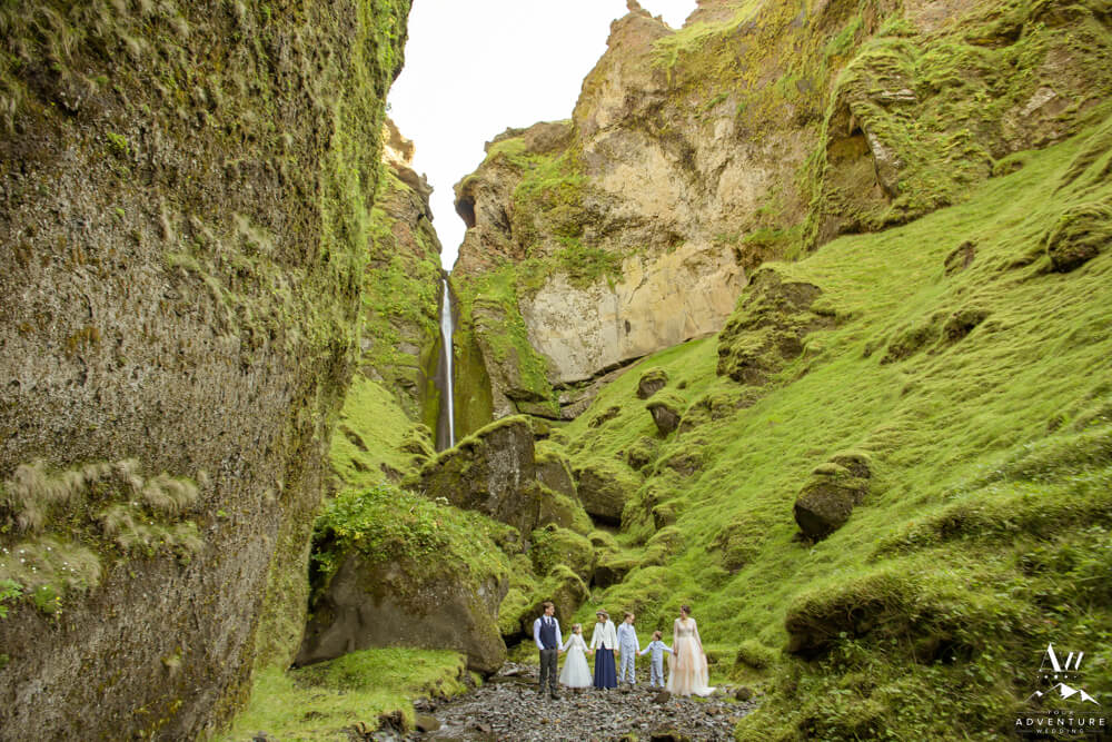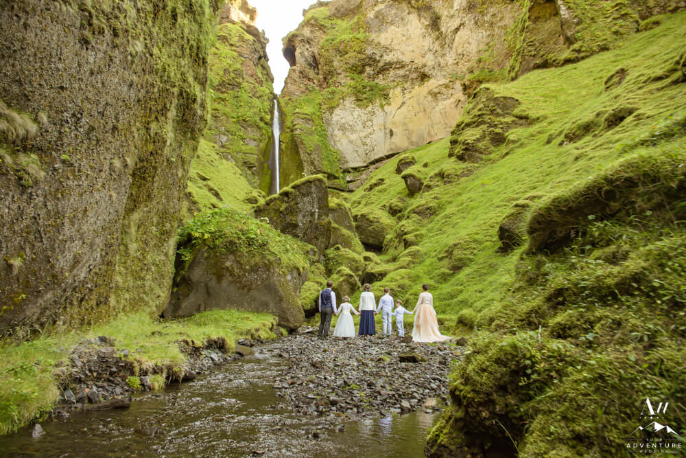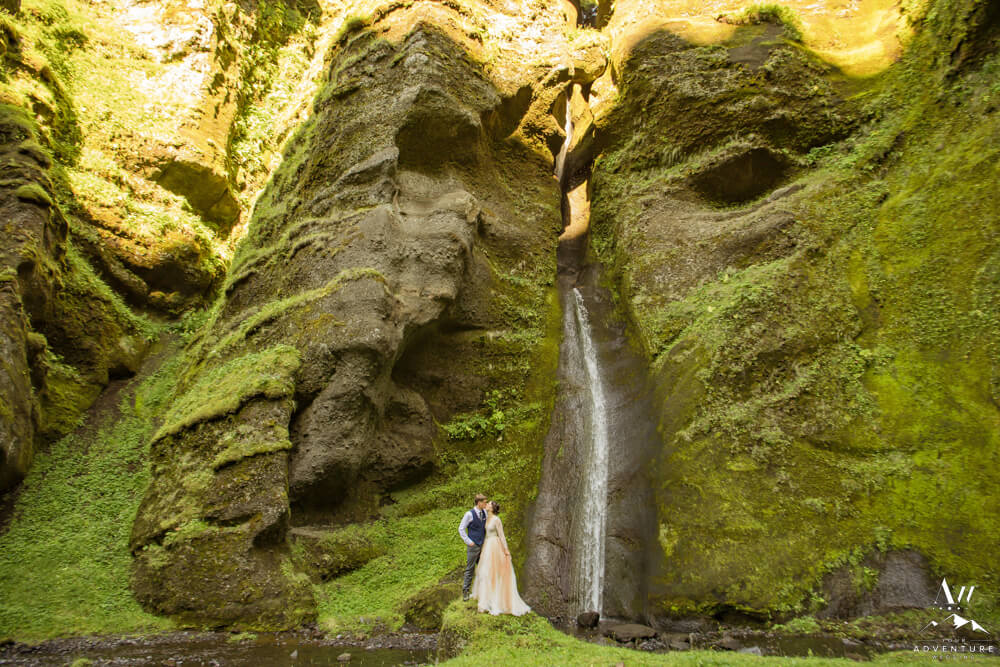After dropping off the kids with our Iceland Wedding Planner babysitter, Sarah and Will begin a more intense hiking wedding adventure. The kind of hiking that is sketchy but oh-so worth it! First, example, they travelled to a remote canyon area that is home to a waterfall you can walk behind. Second, after several river crossings via super jeep and by foot they were hiking on a “sheep road.” Third, they powered through the steep and crazy parts to be greeted with a stunning season. Fourth, they explored this fragile waterfall and savored every single second!