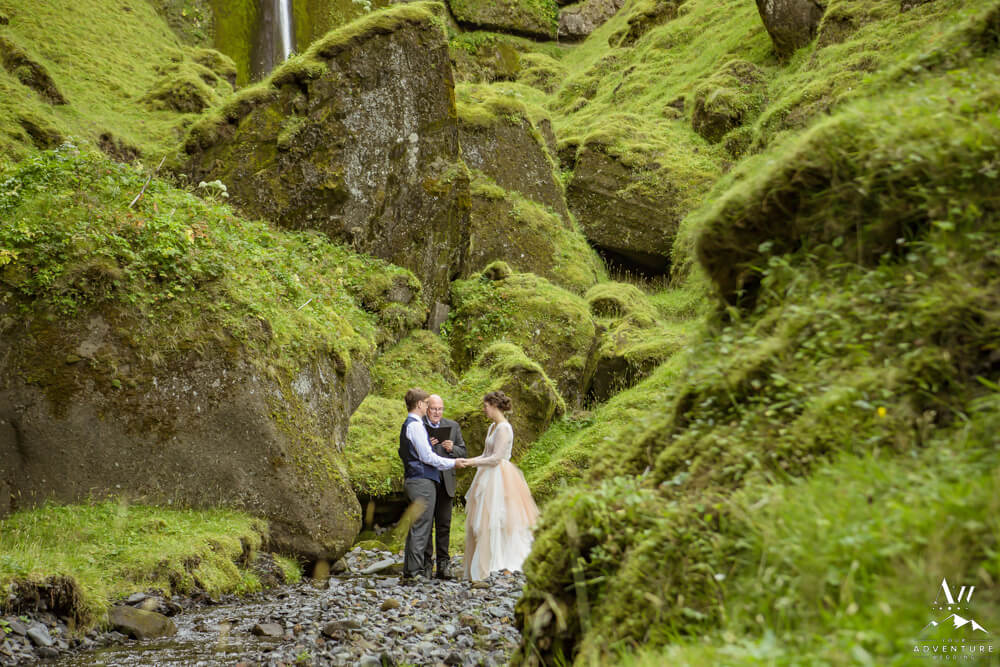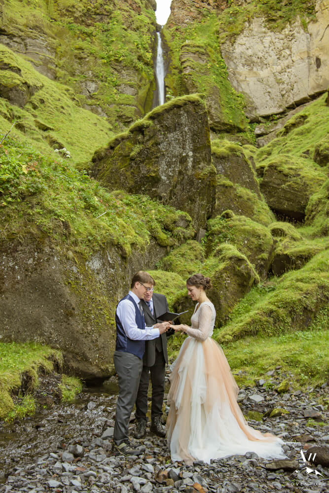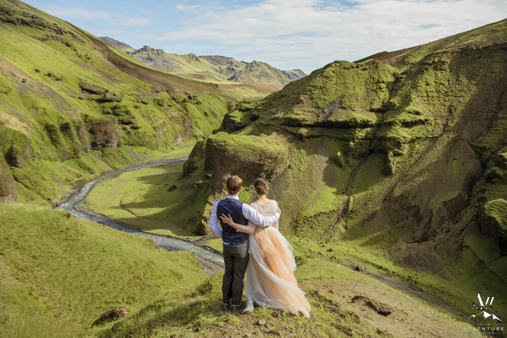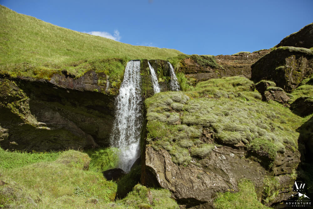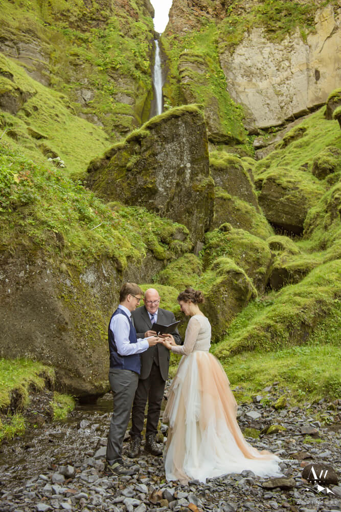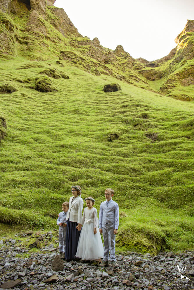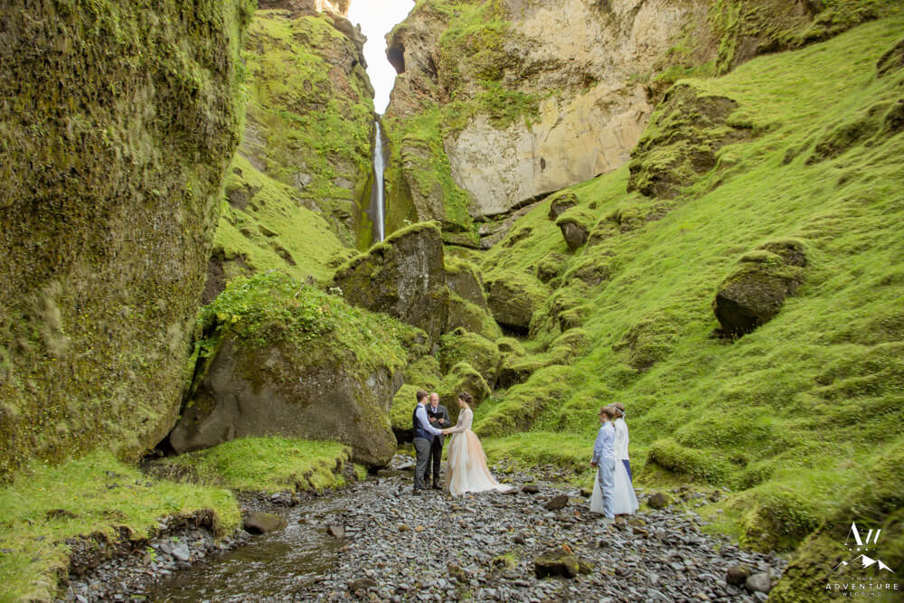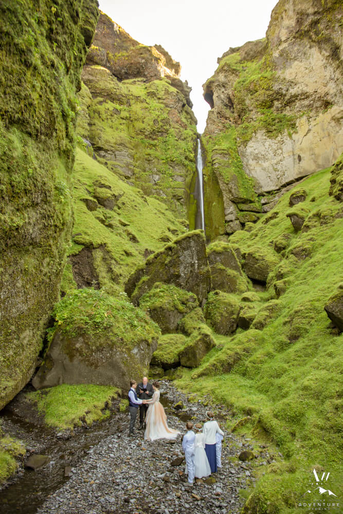 After dropping off the kids with our Iceland Wedding Planner babysitter, Sarah and Will begin a more intense hiking wedding adventure. The kind of hiking that is sketchy but oh-so worth it! First, example, they travelled to a remote canyon area that is home to a waterfall you can walk behind. Second, after several river crossings via super jeep and by foot they were hiking on a “sheep road.” Third, they powered through the steep and crazy parts to be greeted with a stunning season. Fourth, they explored this fragile waterfall and savored every single second!