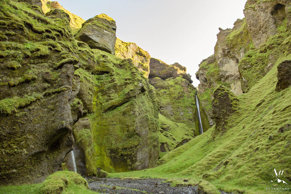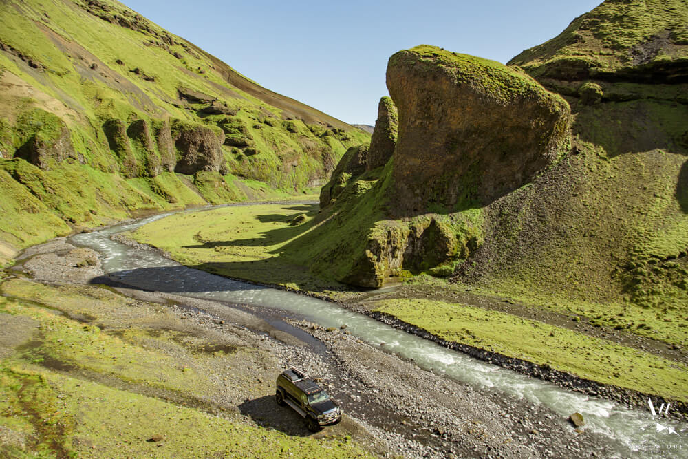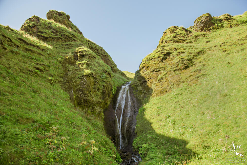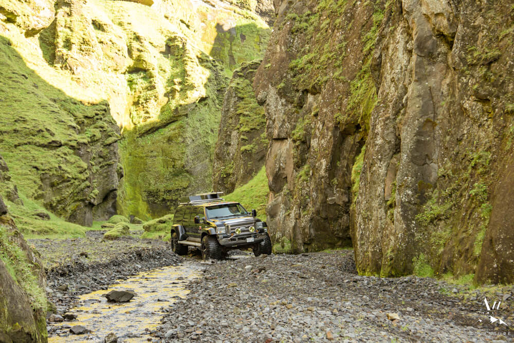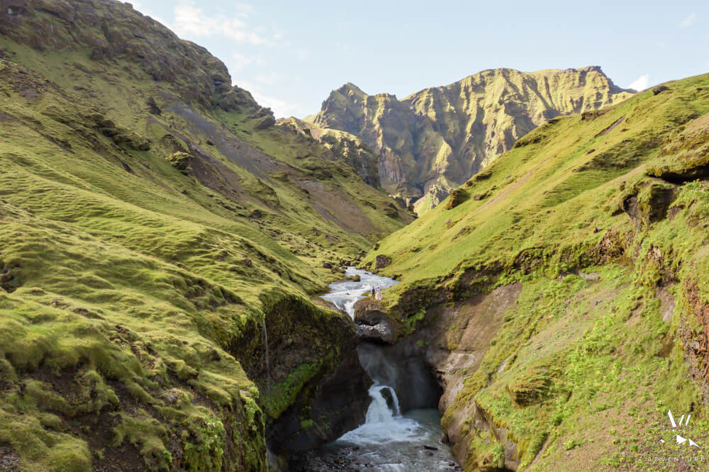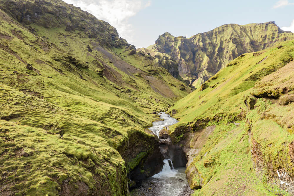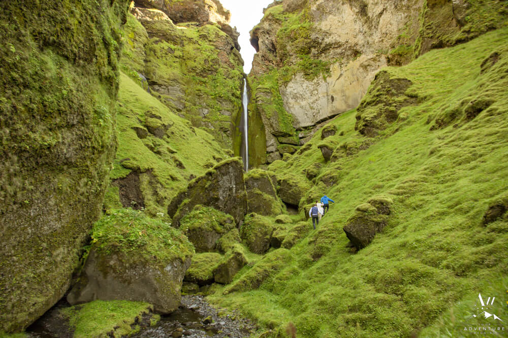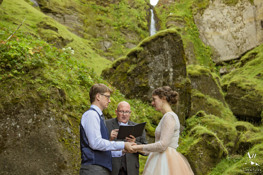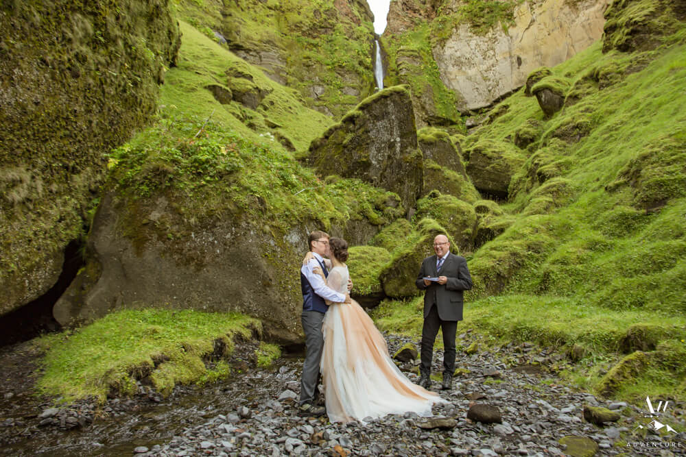 After dropping off the kids with our Iceland Wedding Planner babysitter, Sarah and Will begin a more intense hiking wedding adventure. The kind of hiking that is sketchy but oh-so worth it! First, example, they travelled to a remote canyon area that is home to a waterfall you can walk behind. Second, after several river crossings via super jeep and by foot they were hiking on a “sheep road.” Third, they powered through the steep and crazy parts to be greeted with a stunning season. Fourth, they explored this fragile waterfall and savored every single second!