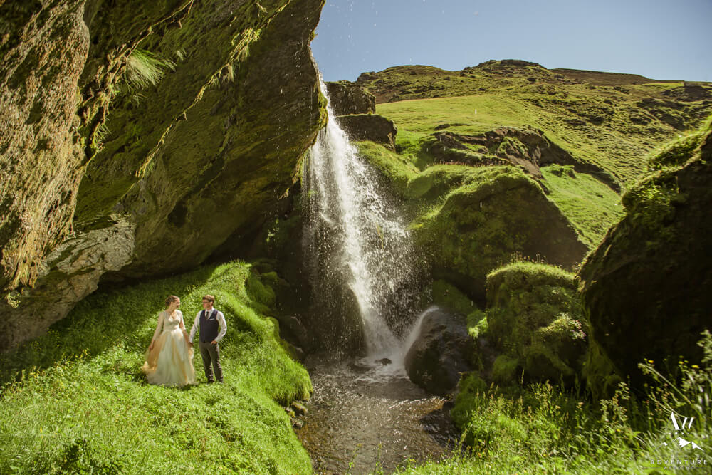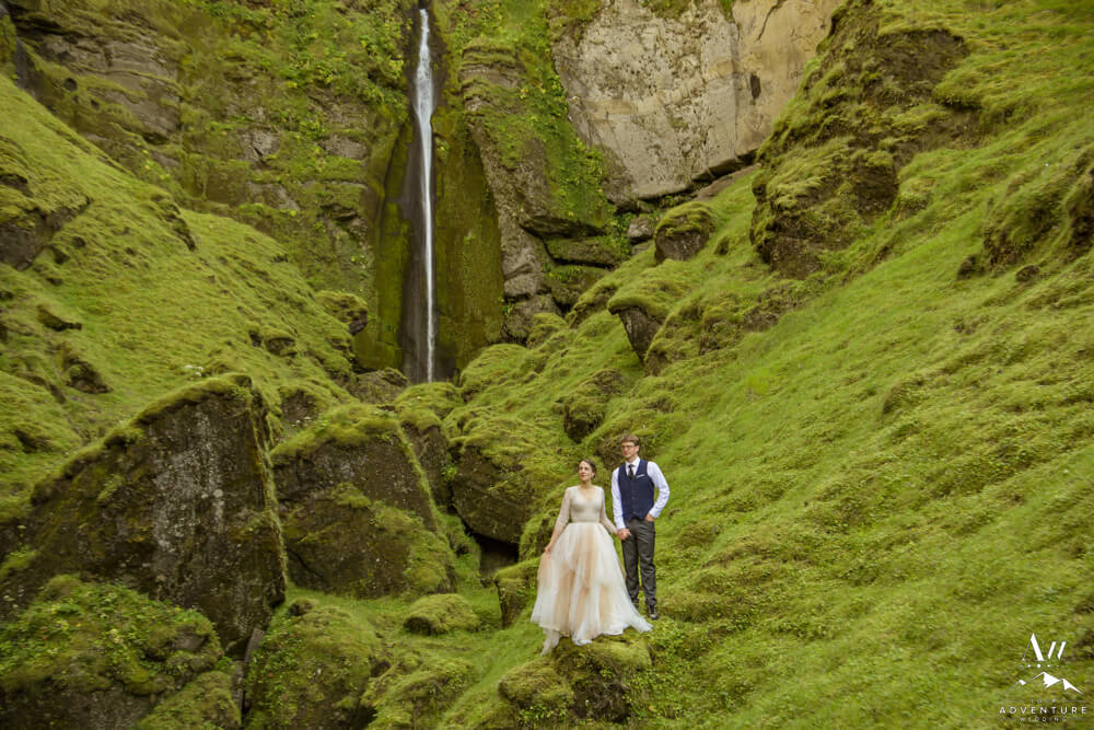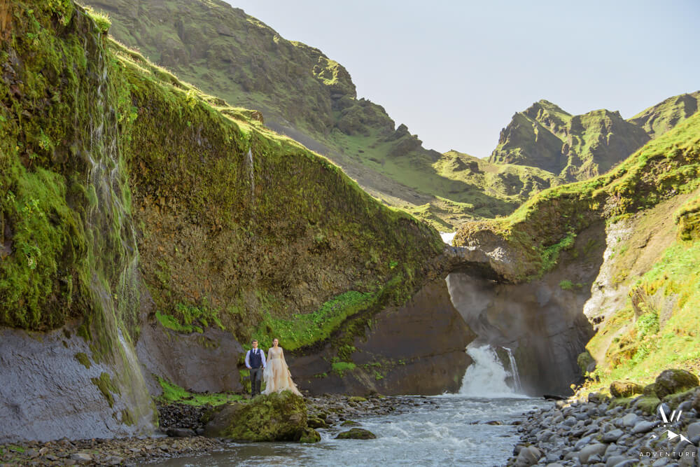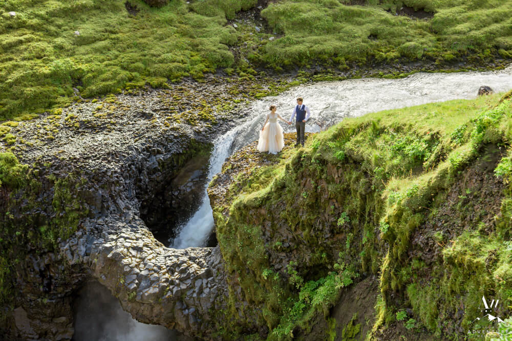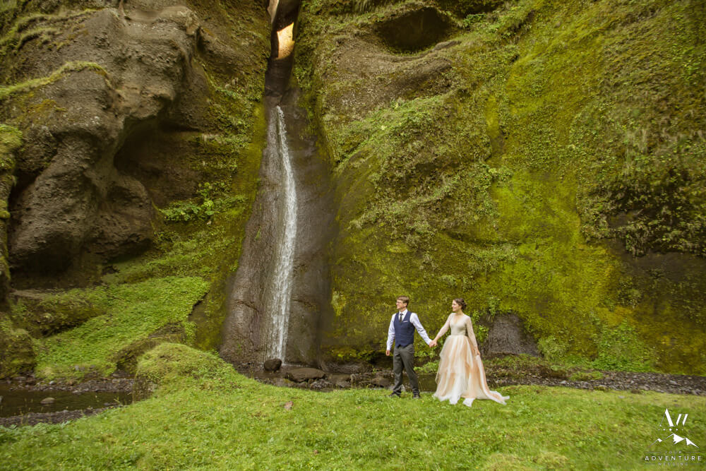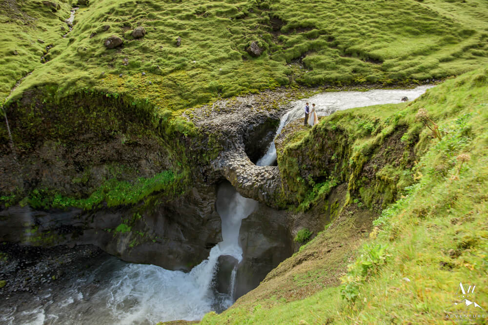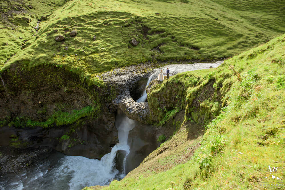 Will and Sarah continued their hiking wedding experience by venturing to one of our newest waterfalls in our portfolio. However, this specific Iceland wedding location is not for inexperienced hikers. Lots of steep slopes, switchbacks, elevation are encountered. But one of the most unique features about this private property waterfall is that it has a lava rock bridge. How picturesque for our elopement photographer to capture them with too?!
