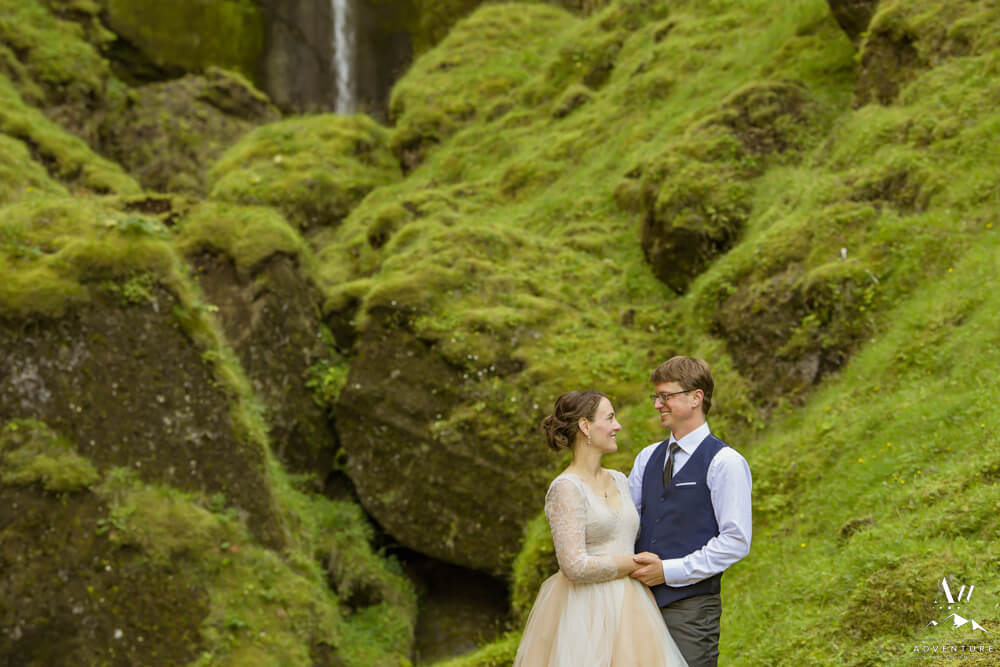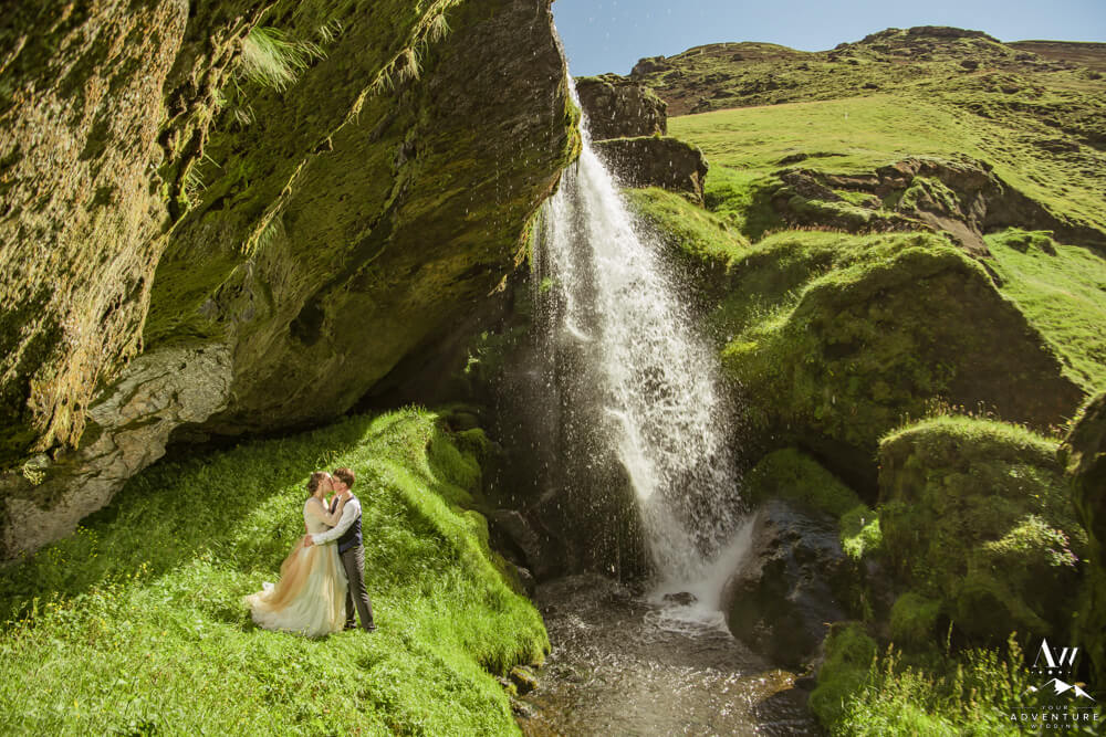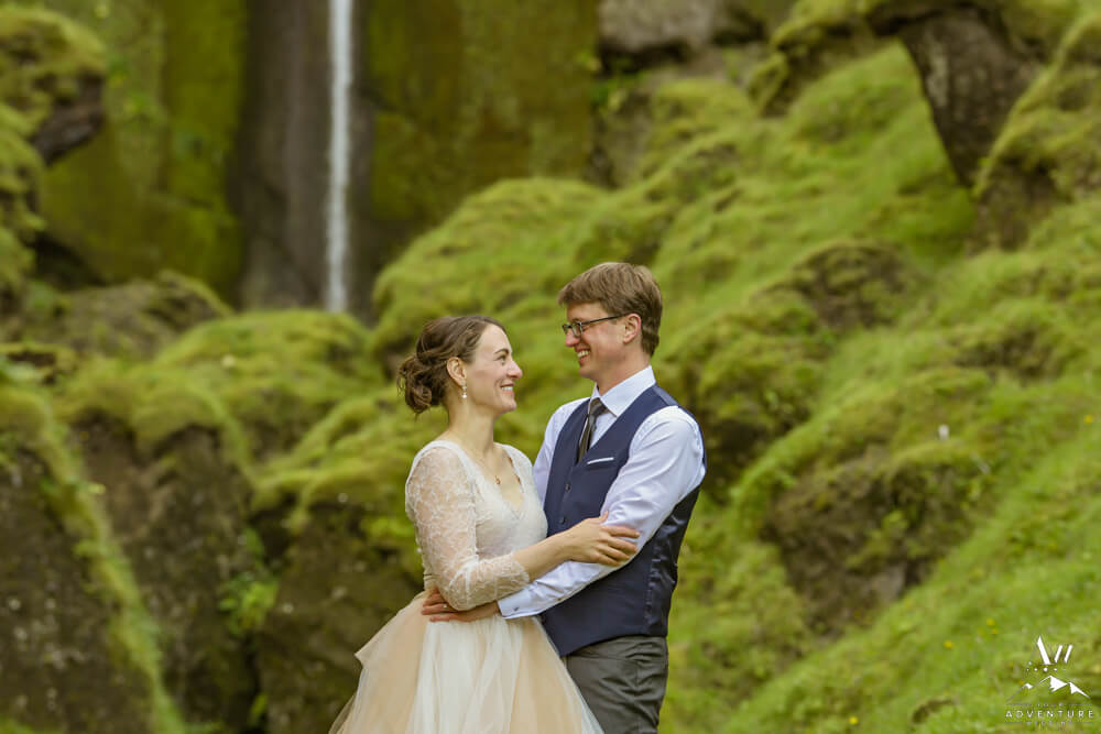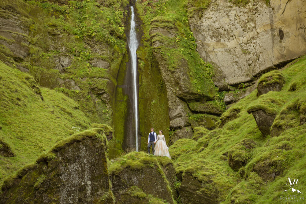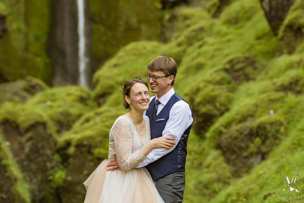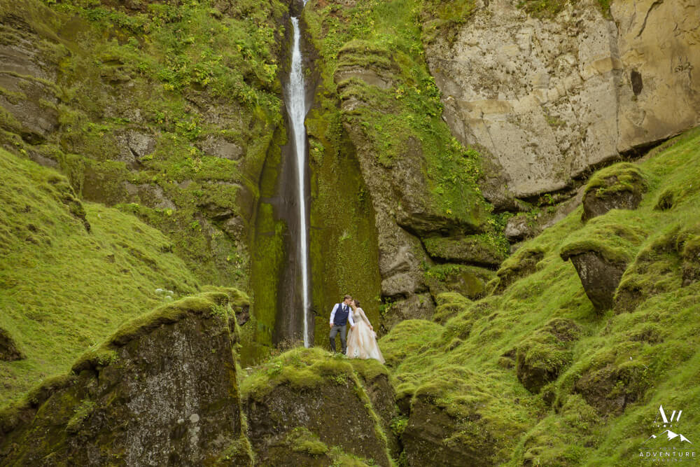 Will and Sarah continued their hiking wedding experience by venturing to one of our newest waterfalls in our portfolio. However, this specific Iceland wedding location is not for inexperienced hikers. Lots of steep slopes, switchbacks, elevation are encountered. But one of the most unique features about this private property waterfall is that it has a lava rock bridge. How picturesque for our elopement photographer to capture them with too?!