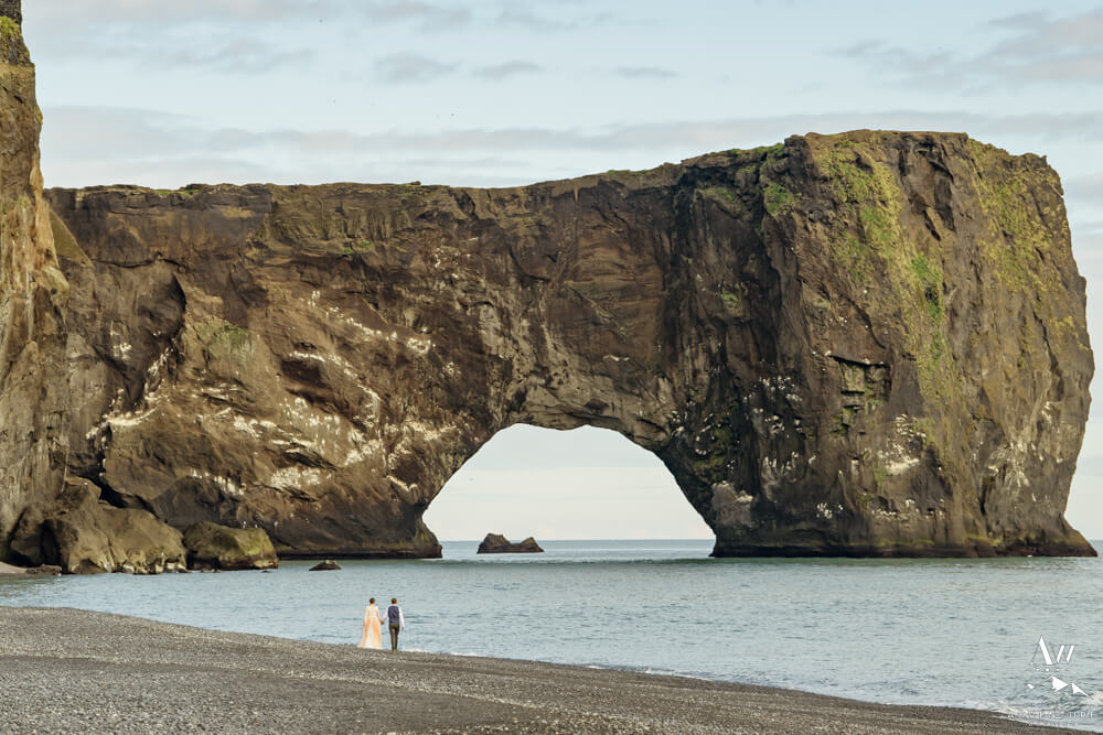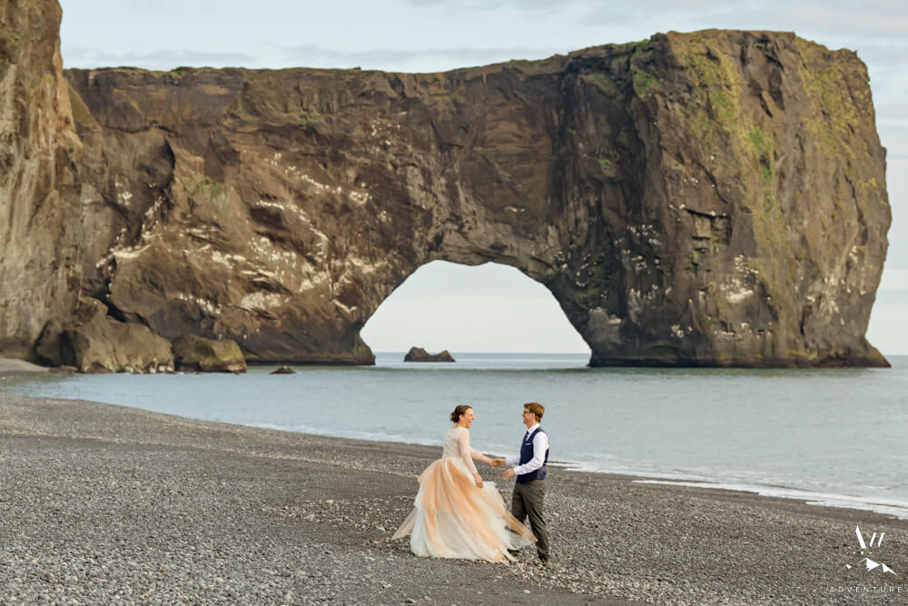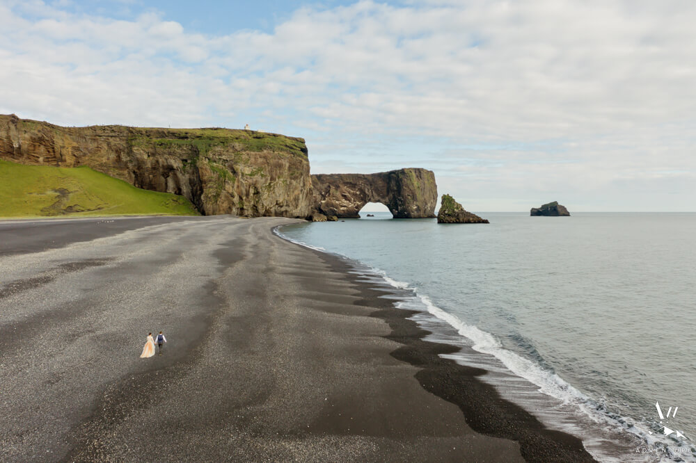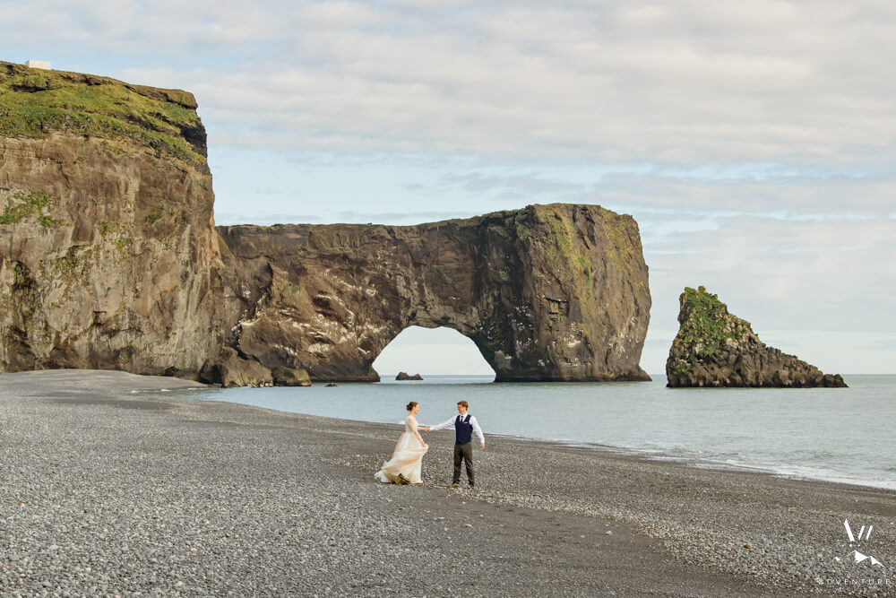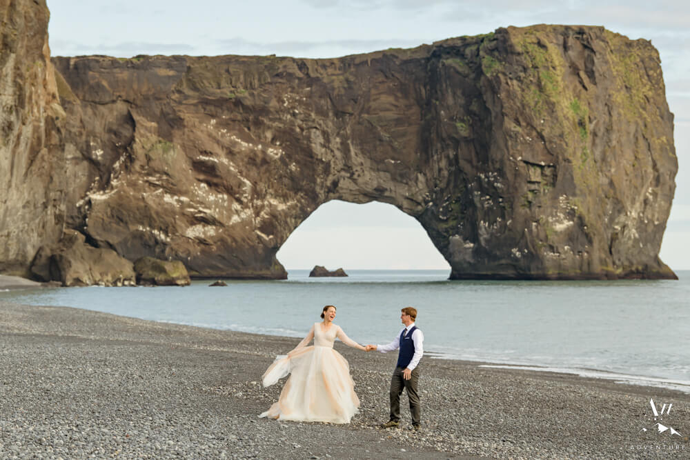 Frolicking around on a black sand beach on your hiking wedding day just makes freaking sense! In fact, there is something about this private side of Dyrhólaey that centers you with nature. I don’t know if it’s a calmness of the beach, crashing waves, or massiveness of the arch. But there, you will be in the moment and if you’re lucky time will stop.